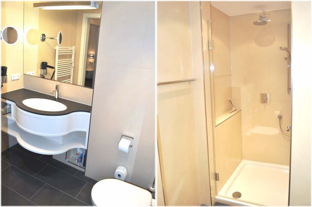 Bad 1: Duschkabine, Flachdusche mit Brauskopf und Regendusche, Fön, Kosmetikspiegel beleuchtet, Lüfter, Spiegel, Waschtisch, WC