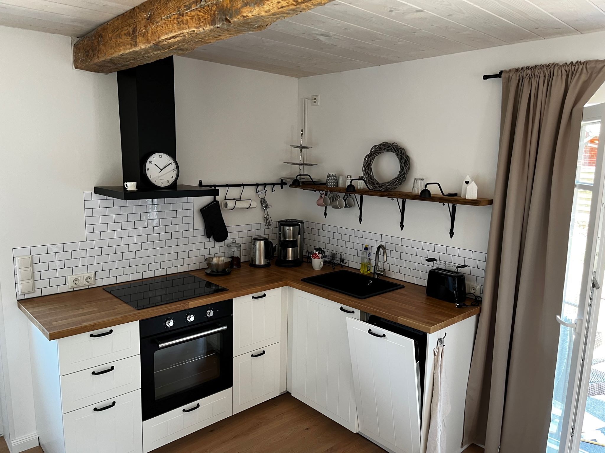 Gemütliches Ferienhaus für 2 Personen. Das Ferienhaus (68qm), verfügt über 1 Schlafzimmer im Obergeschoss mit einem 1,8x2m Doppelbett. Die Eckgarnitur im Wohnzimmer kann umgebaut werden, so dass dort noch zwei Kinder oder ein Erwachsener schlafen können. Die komplett ausgestattete Küche verfügt über einen Backofen, Kühlschrank, Geschirrspüler, Küchenmaschine mit Kochfunktion, Wasserkocher sowie Kaffeemaschine und Toaster. Es gibt eine schöne Holzterrasse mit Terrassenmöbeln einem Grill, Sonnenschirm und zwei Sonnenliegen.