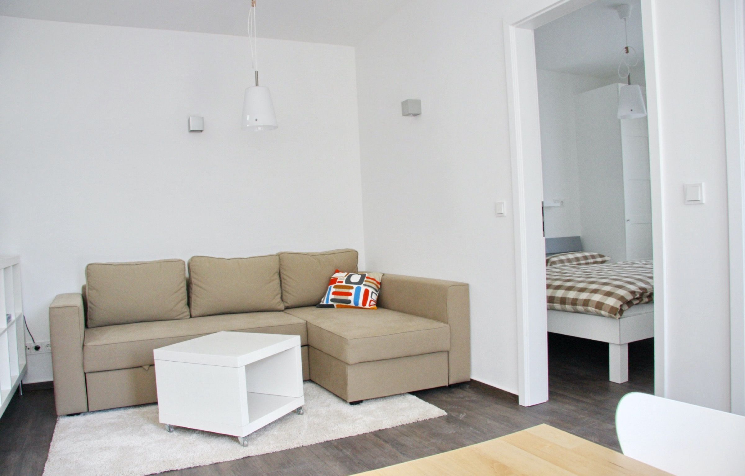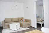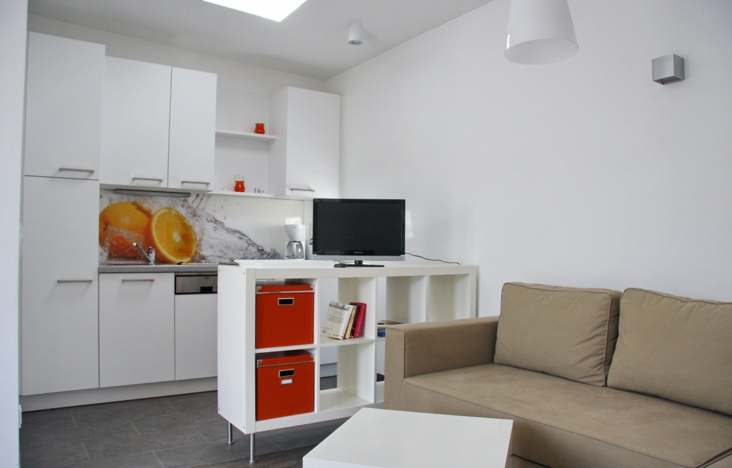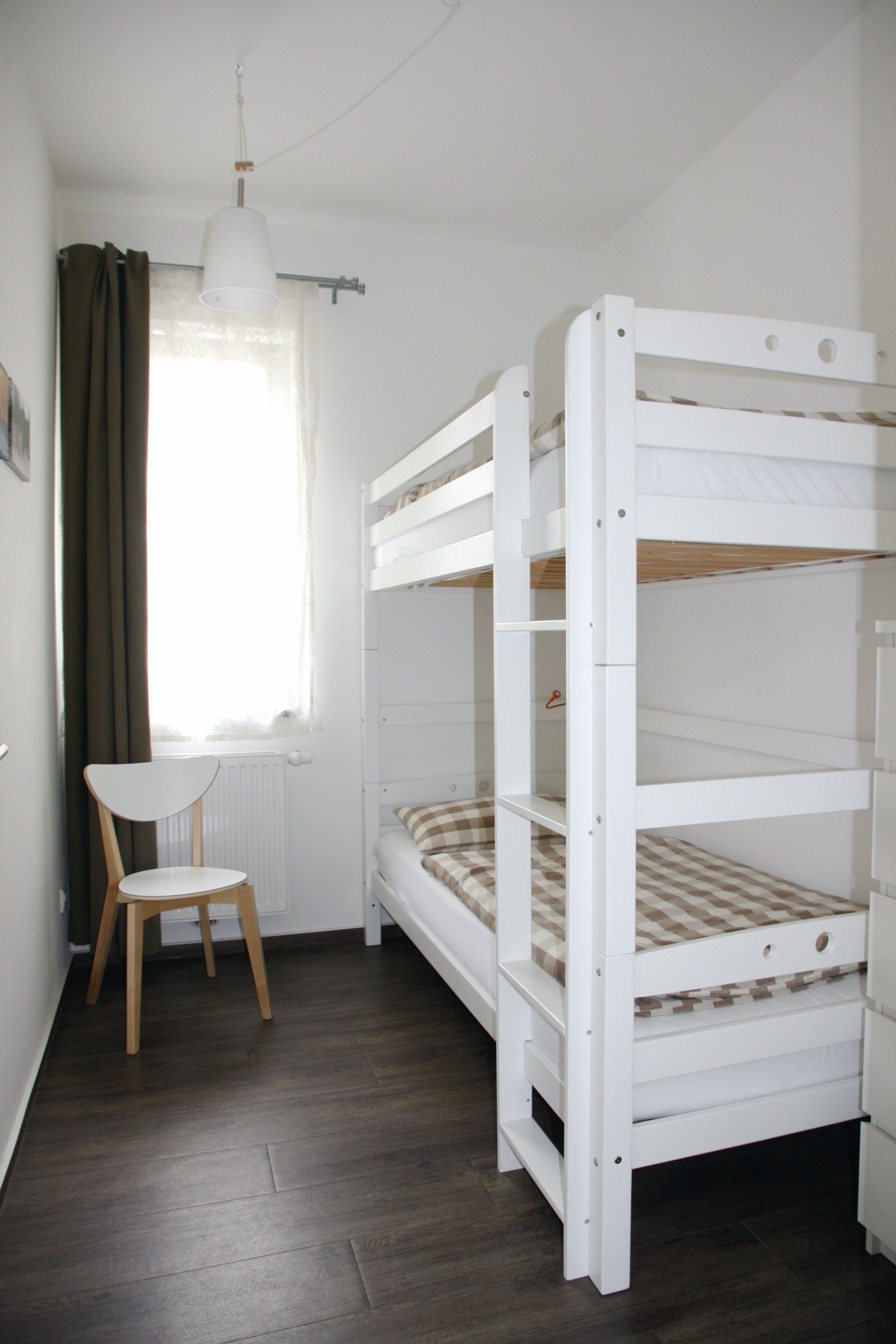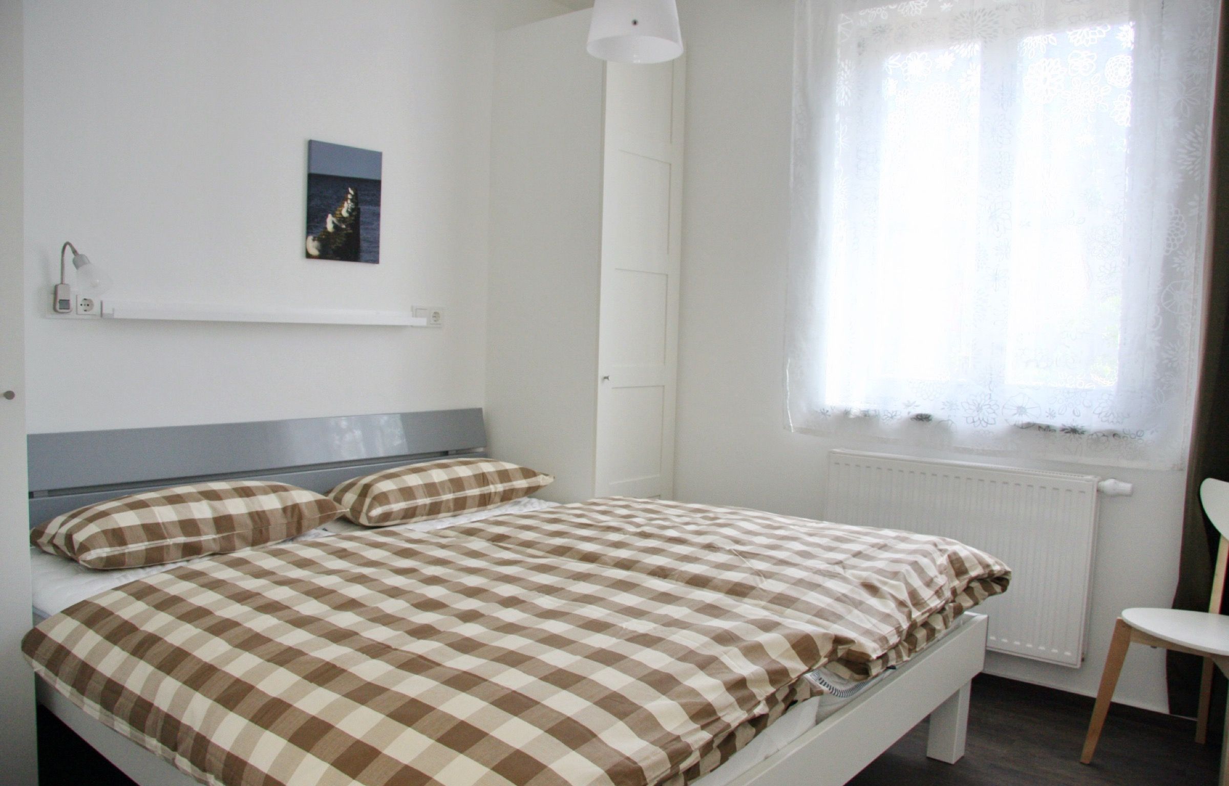 Ferienwohnung 1 bietet Platz für 4 Personen. Es gibt ein Wohnzimmer, zwei Schlafzimmer, Küche und Bad. Betreten wird die Ferienwohnung über den Wohn- und Essbereich. Vorgelagert befindet sich hier eine sonnige Terrasse. Das Wohnzimmer ist mit Couch und Kamin zum Ausruhen gerüstet. An das Wohnzimmer grenzt die offene Küche. Ein Schlafzimmer ist mit einem Doppelbett, das andere mit einem Doppelstockbett ausgestattet.