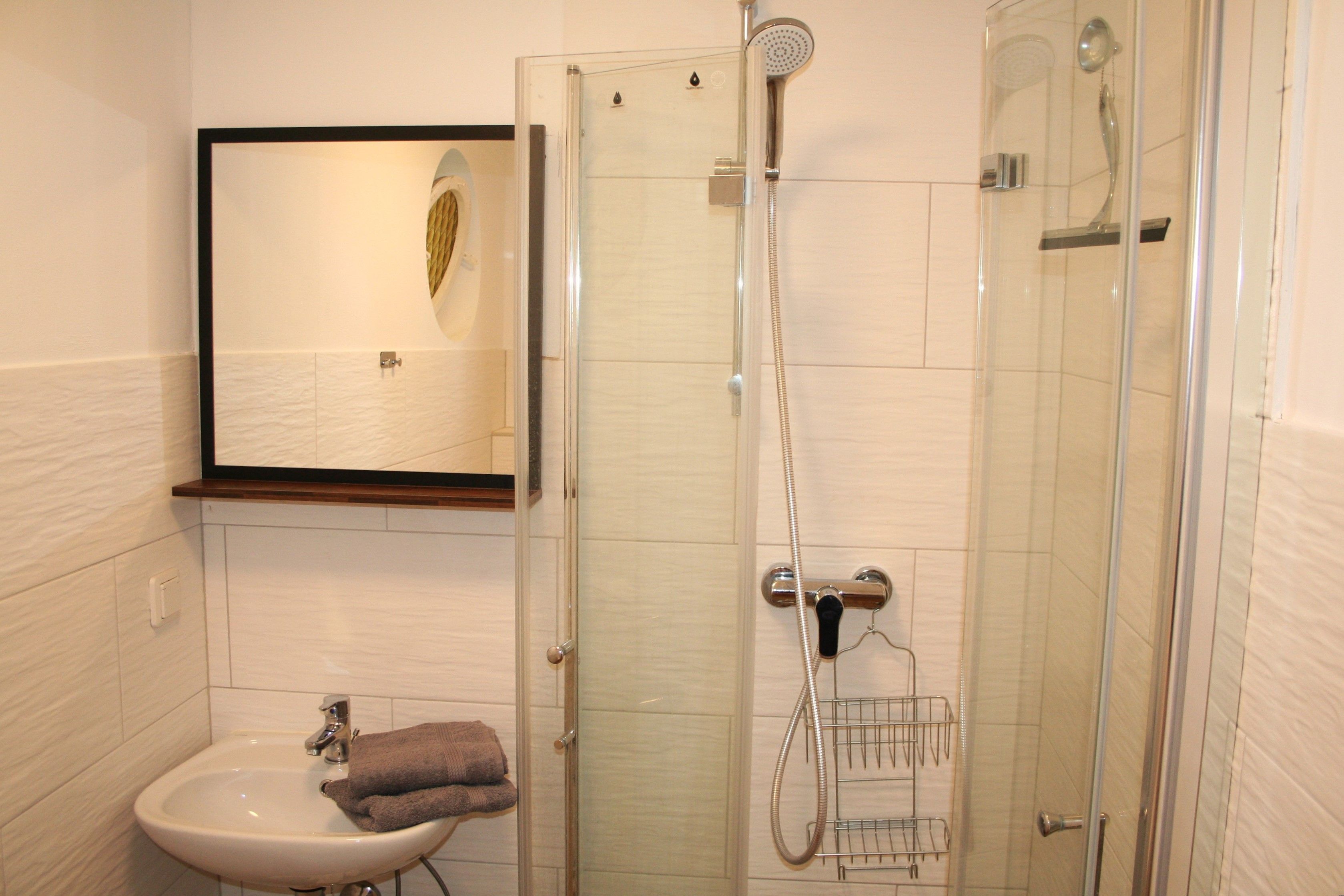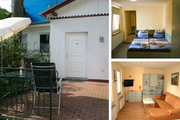Unsere Wohnung 7 befindet sich im Erdgeschoß der Residenz und verfügt über 35m². Im Schlafzimmer gibt es ein Doppelbett sowie einen Kleiderschrank. Der Wohn- und Essbereich bietet Ihnen eine voll ausgestattete Küche (mit Mini-Ofen), einen Esstisch, ein gemütliches Sofa und einen Fernseher. Die Wohnung erreichen Sie über einen separaten Außeneingang im Erdgeschoß.