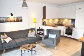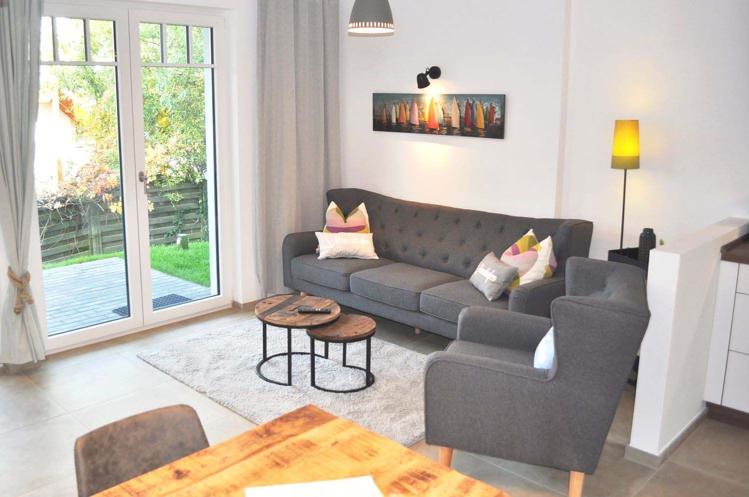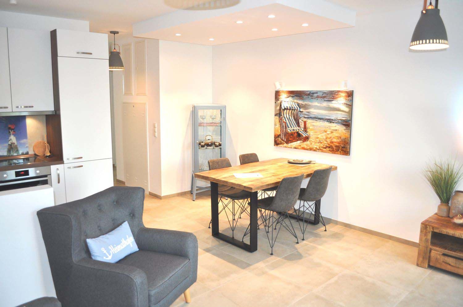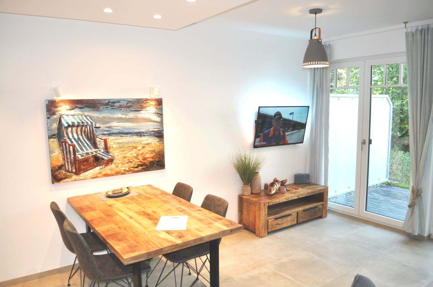 Wohnzimmer: 4 Plattenherd mit Ceranfeld und Backofen, 4 Stühle, Couch, Couchtisch, Dimmbares Unterschranklicht (Touchsensor), Dunstabzugshaube, Eierkocher, Einbauküche, elektrische Aussenrollladen, Esstisch, Flachbildschirm mit LED Rücklicht, Fussbodenheizung, Gefrierschrank, Geschirr, Geschirrständer, Glasvitrine, Kabel-TV, Kaffeemaschine, Kochtöpfe, Kühlschrank, Pürierstab, Quooker Wasserhahn (kochendes Wasser, Sprudelwasser, stilles Wasser, Leitungswasser), Radio, Regal mit Bücher, Sessel, Spülmaschine, Stehlampe, Toaster, TV schwenkbar an der Wand, TV-Anrichte, Waffeleisen, Wandleuchte, Wasserkocher