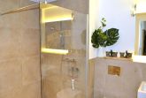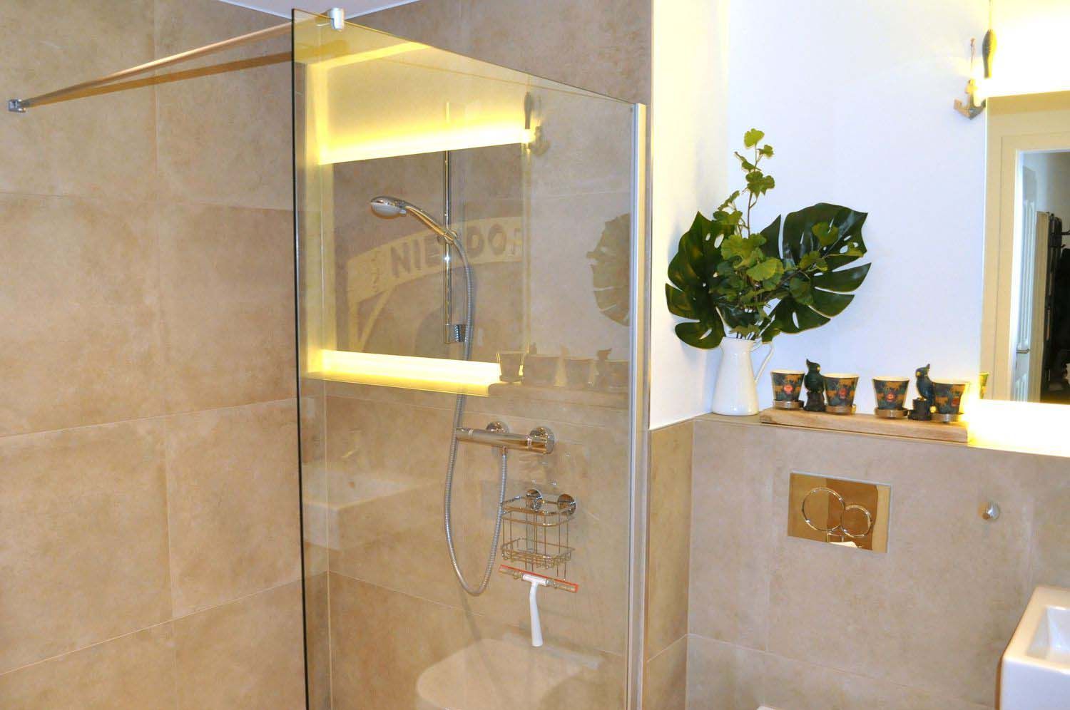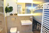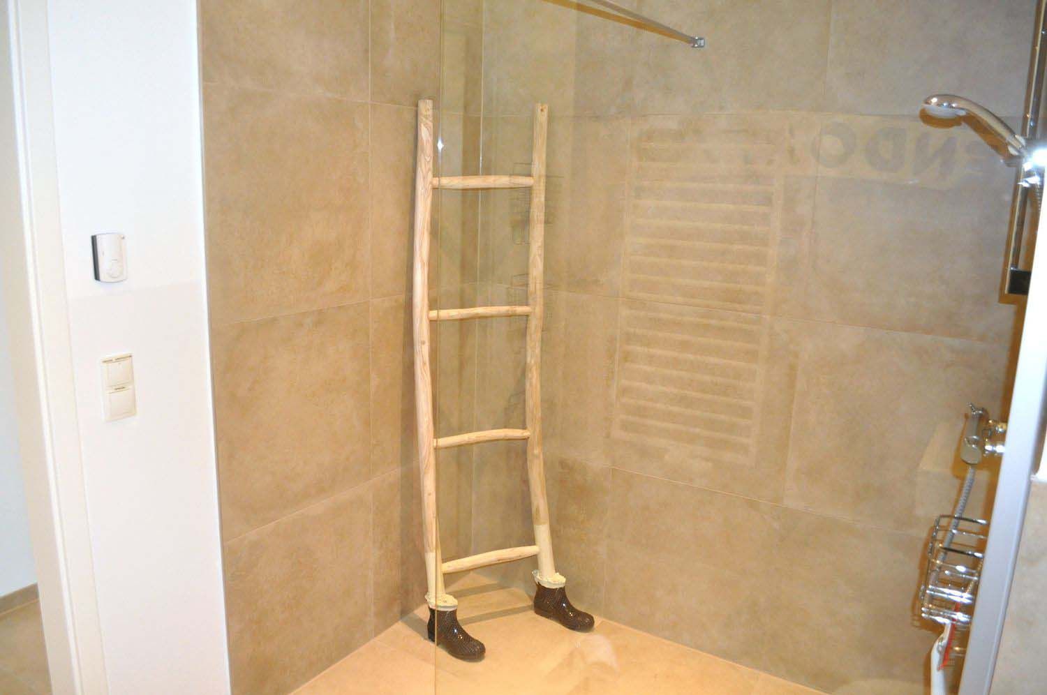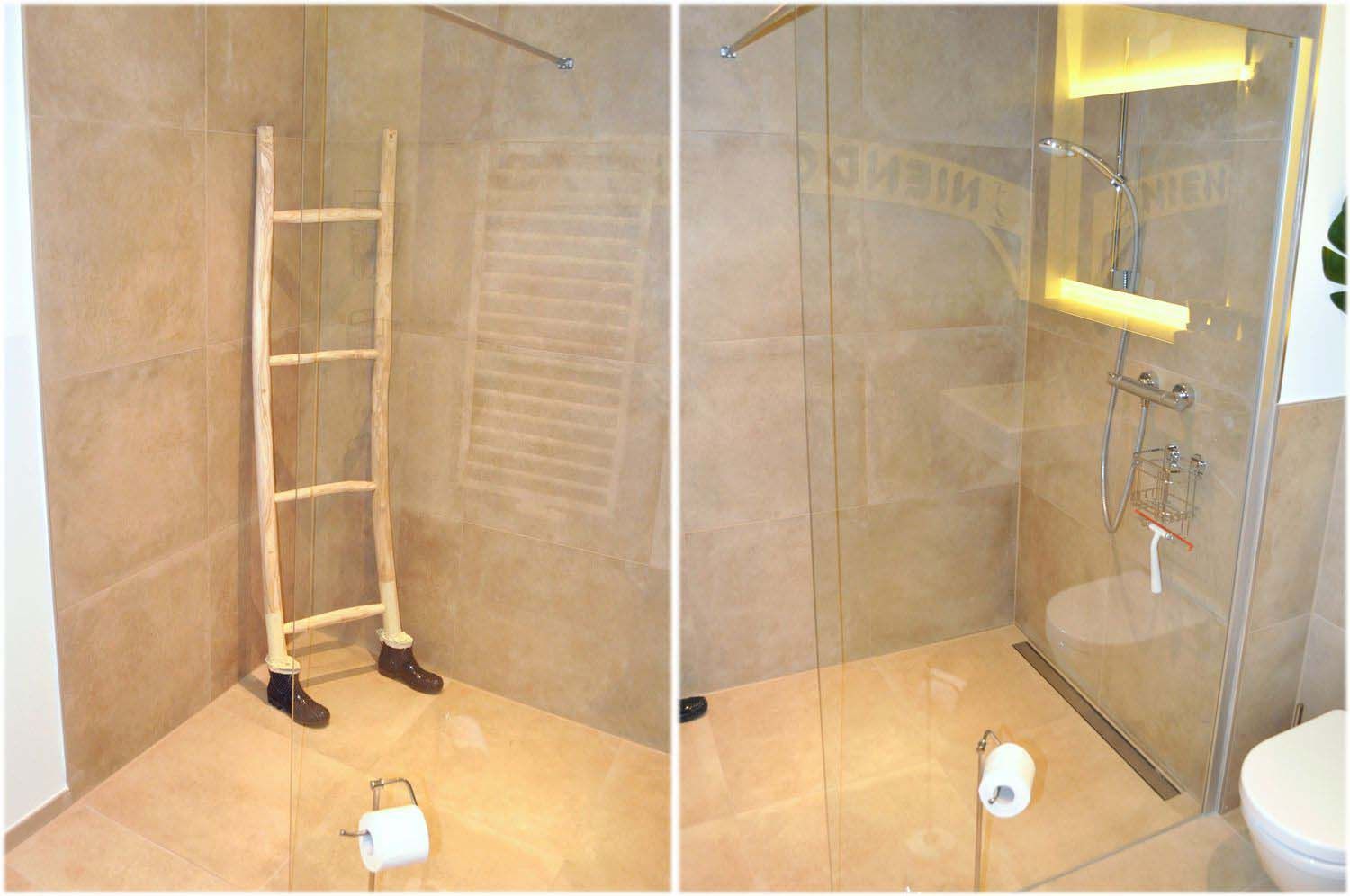 Bad 1: Dusche bodengleich, Fön, Fussbodenheizung, Glastrennwand, Handtuchheizung, Handtuchleiter, Hängeregal, Spiegel, Waschbecken, WC