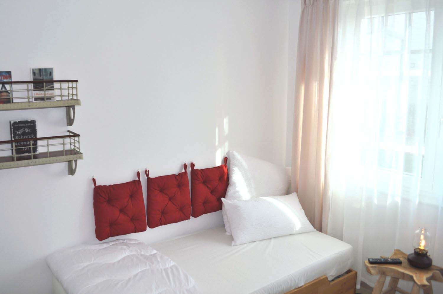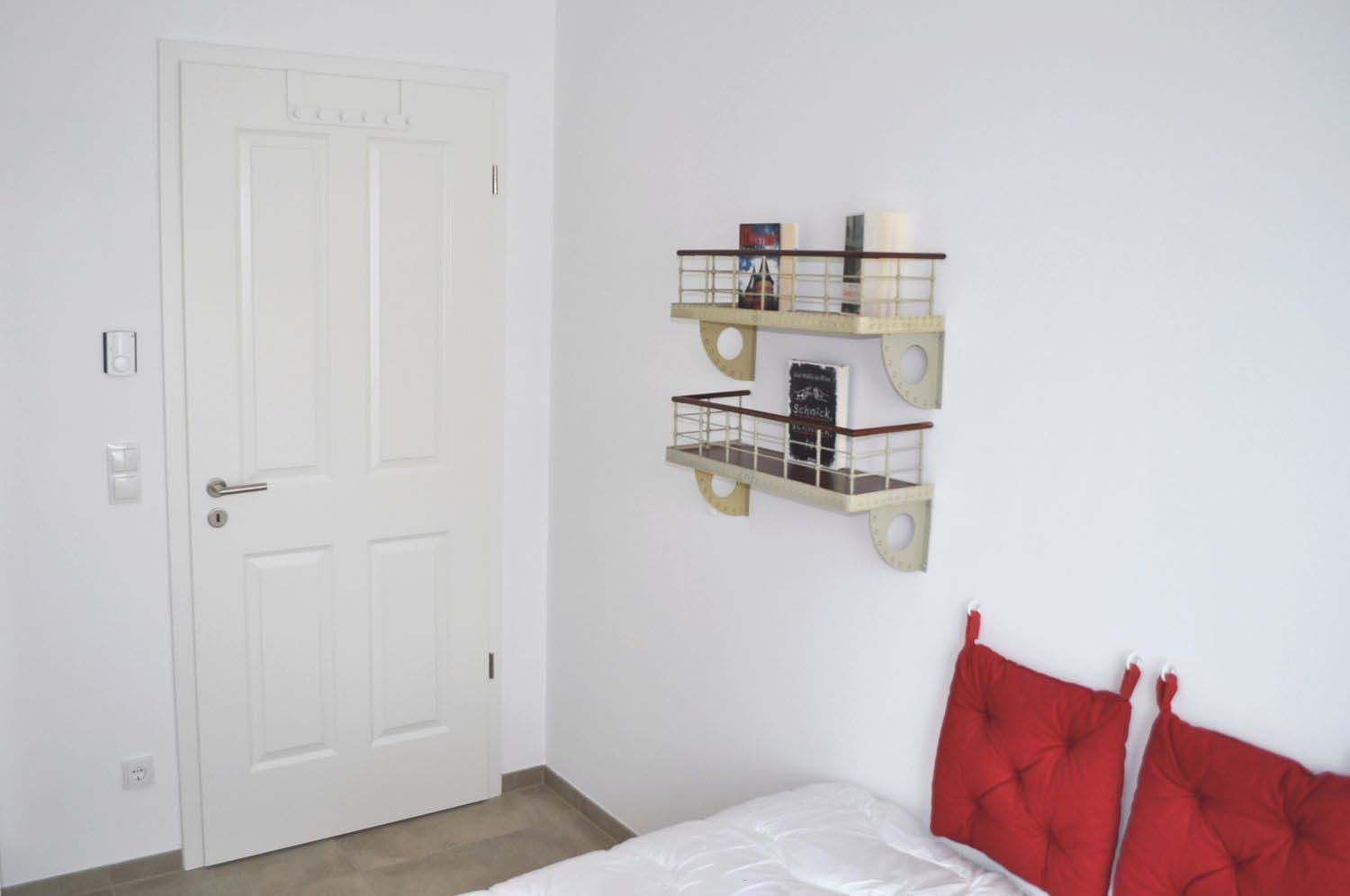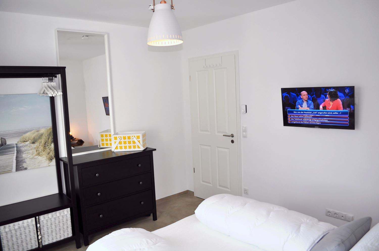 Schlafzimmer 2: 2 Einzelbetten 2,00 x 0,90 m, Einzelbetten können übereinander gestellt werden, elektrische Aussenrollladen, Flachbildschirm schwenkbar, Fussbodenheizung, Kabel-TV, Kleiderschrank, Nachttisch, Nachttischlampe, Regal mit Bücher, Spiegel