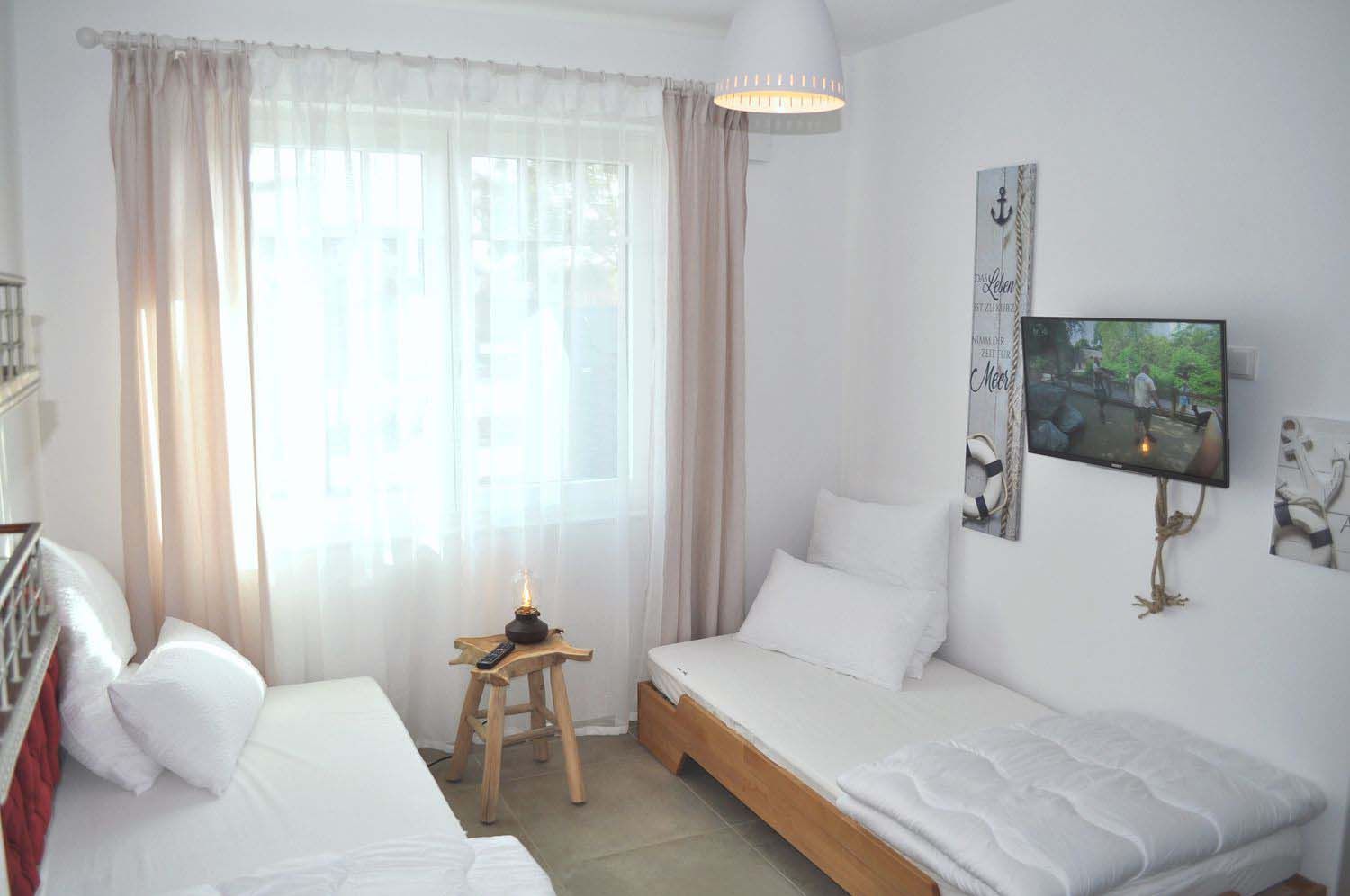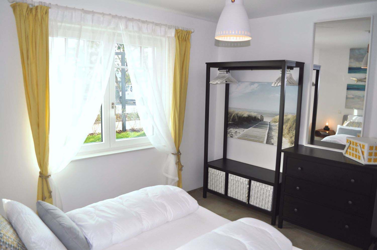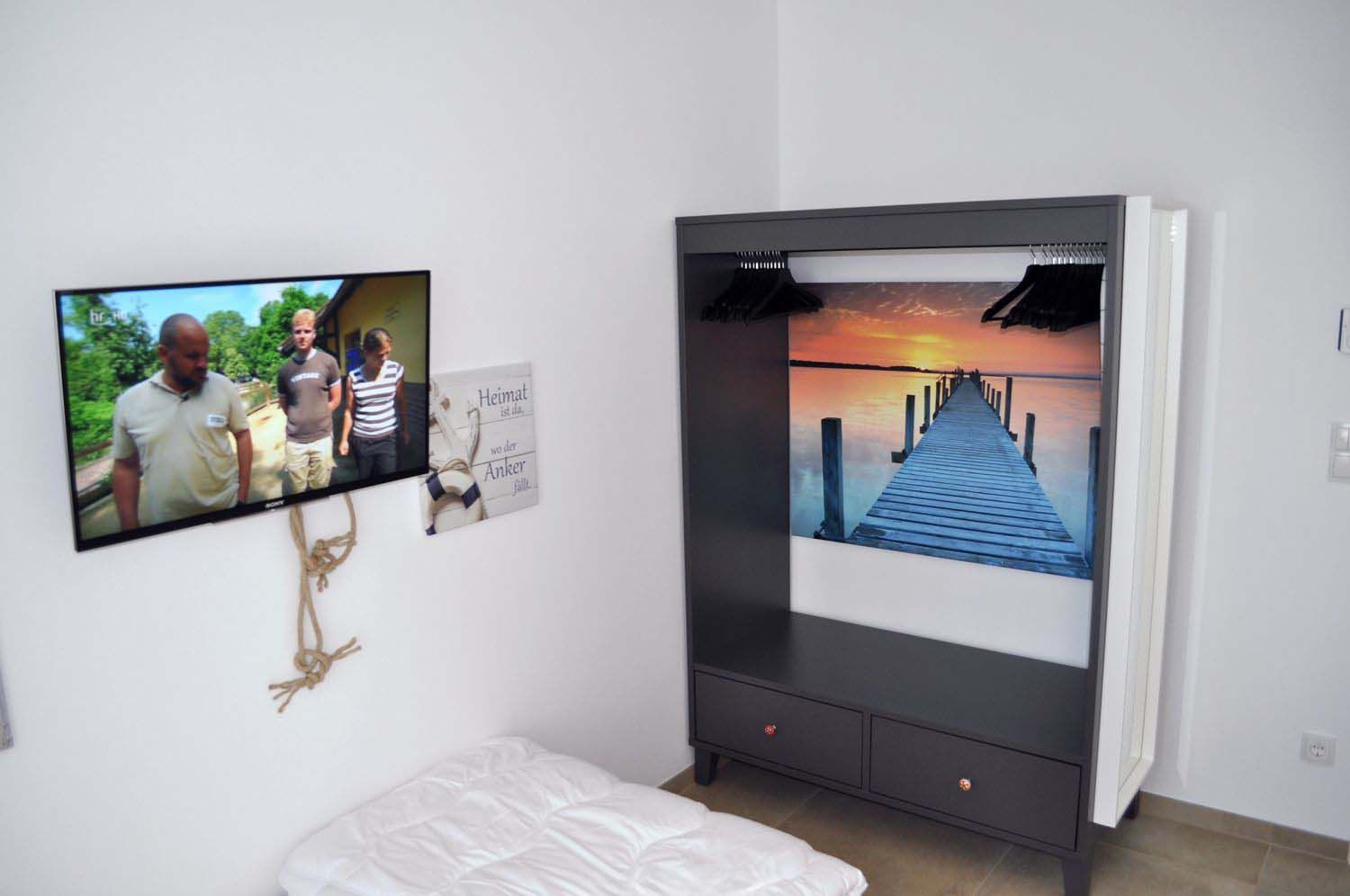 Schlafzimmer 2: 2 Einzelbetten 2,00 x 0,90 m, Einzelbetten können übereinander gestellt werden, elektrische Aussenrollladen, Flachbildschirm schwenkbar, Fussbodenheizung, Kabel-TV, Kleiderschrank, Nachttisch, Nachttischlampe, Regal mit Bücher, Spiegel