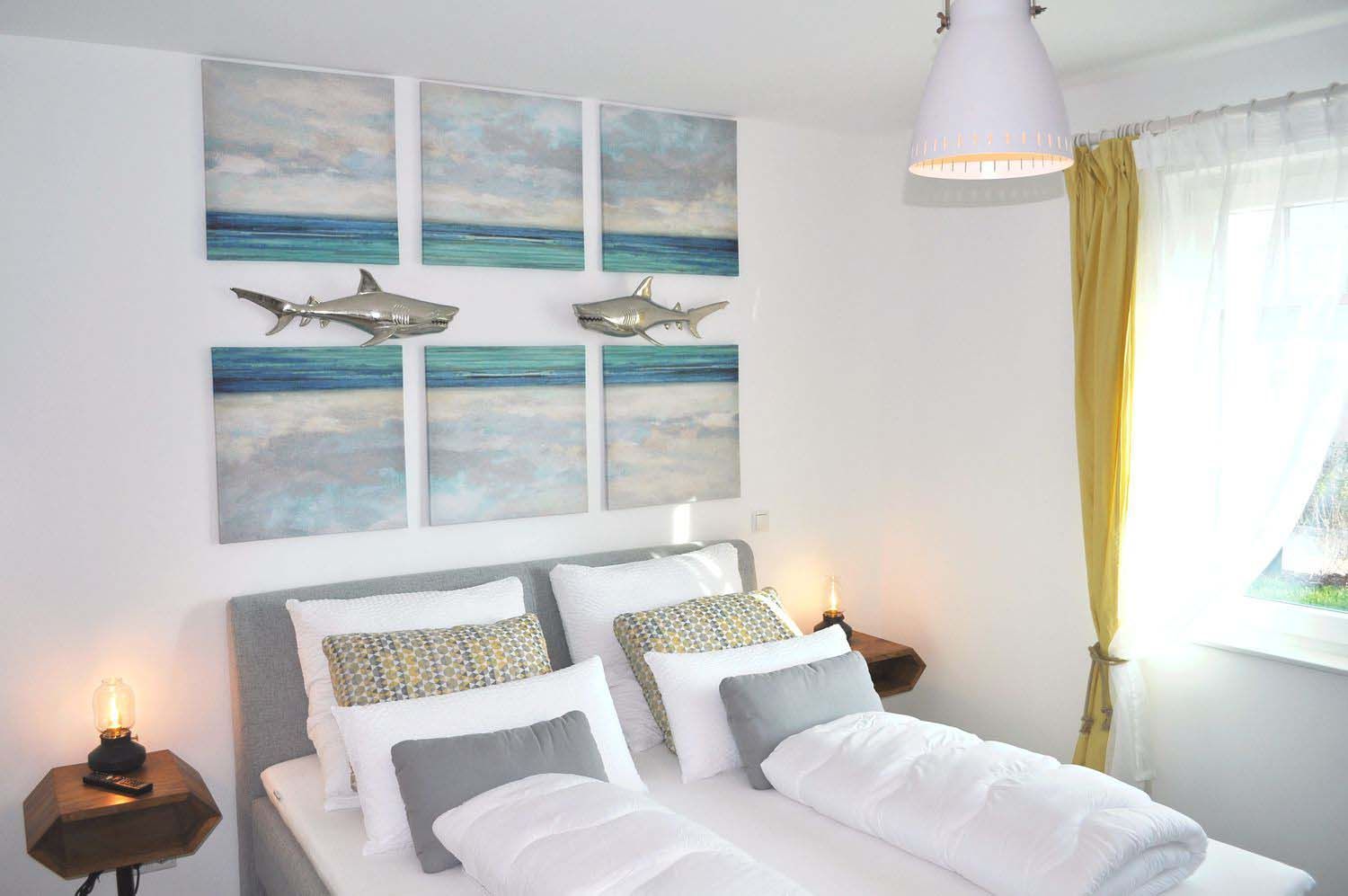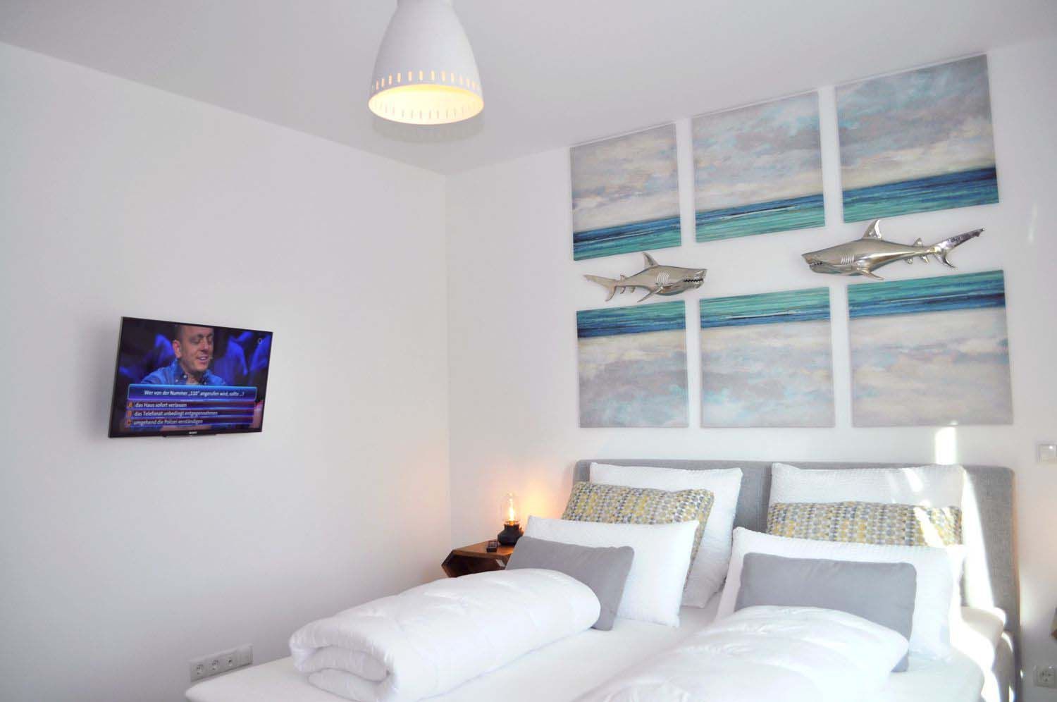 Schlafzimmer 1: 2 Matratzen, 2 Nachttische, 2 Nachttischlampen, Boxspringbett 2,00 x 1,80 m, elektrische Aussenrollladen, Flachbildschirm schwenkbar, Fussbodenheizung, Kabel-TV, Kleiderschrank, Kommode, Spiegel