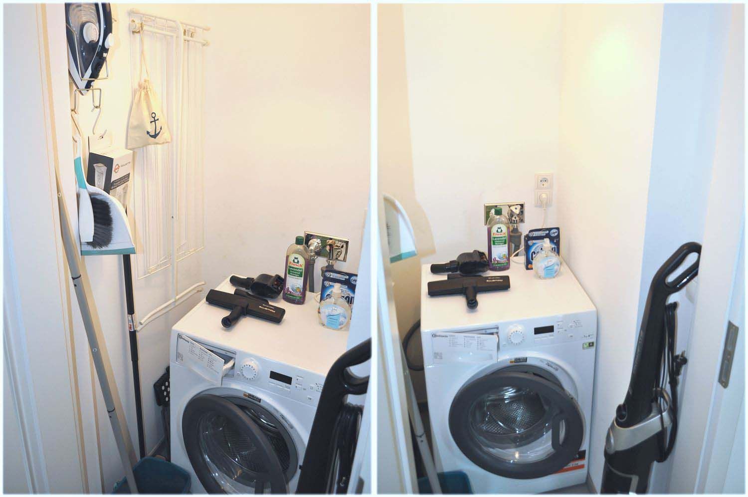Abstellraum: Waschmaschine, Staubsauger, Wäscheständer, Wischmop, Bügeleisen, Klapphocker, Besen, Handfeger