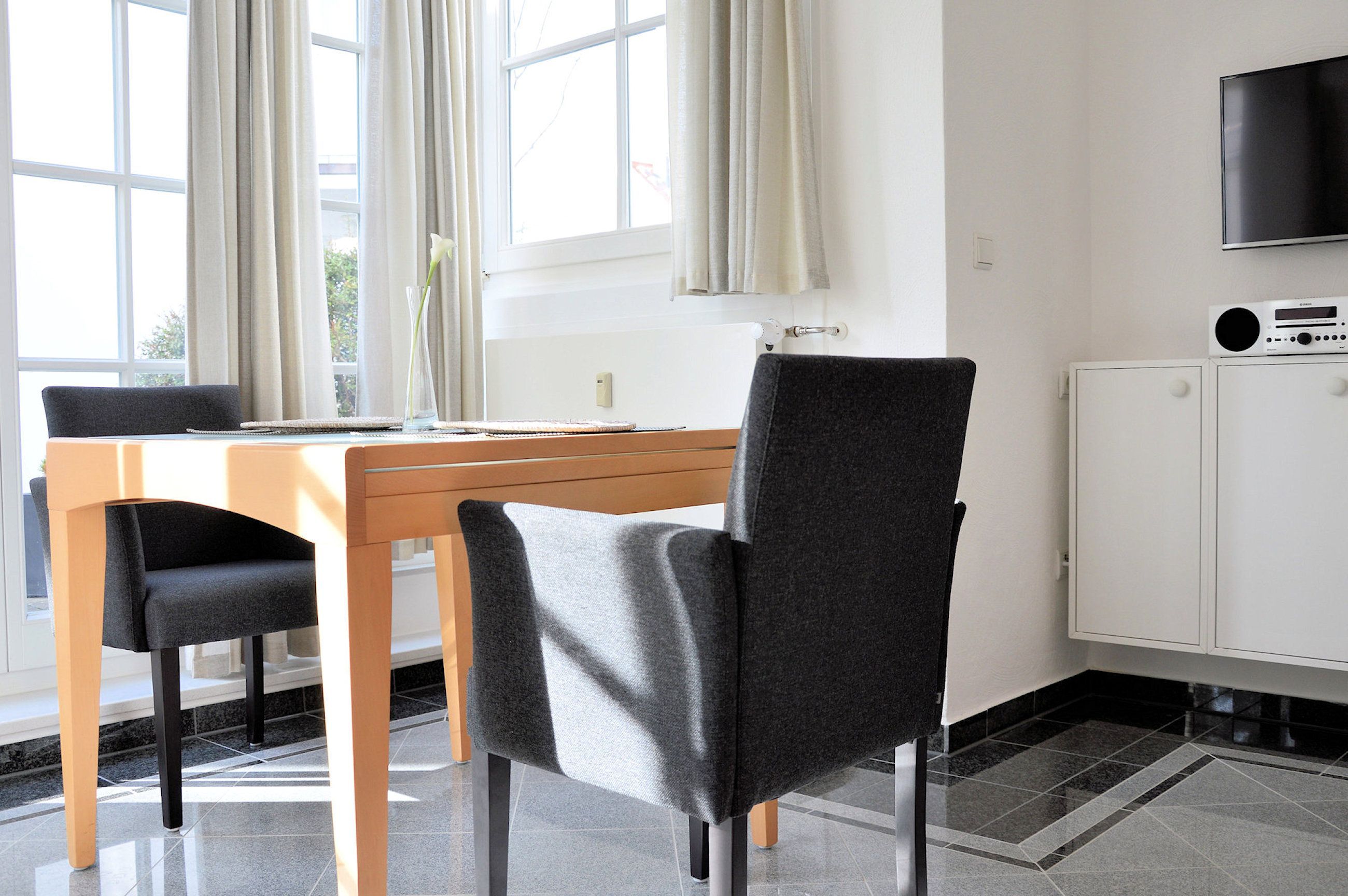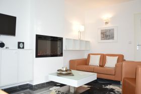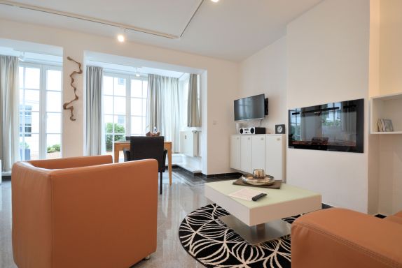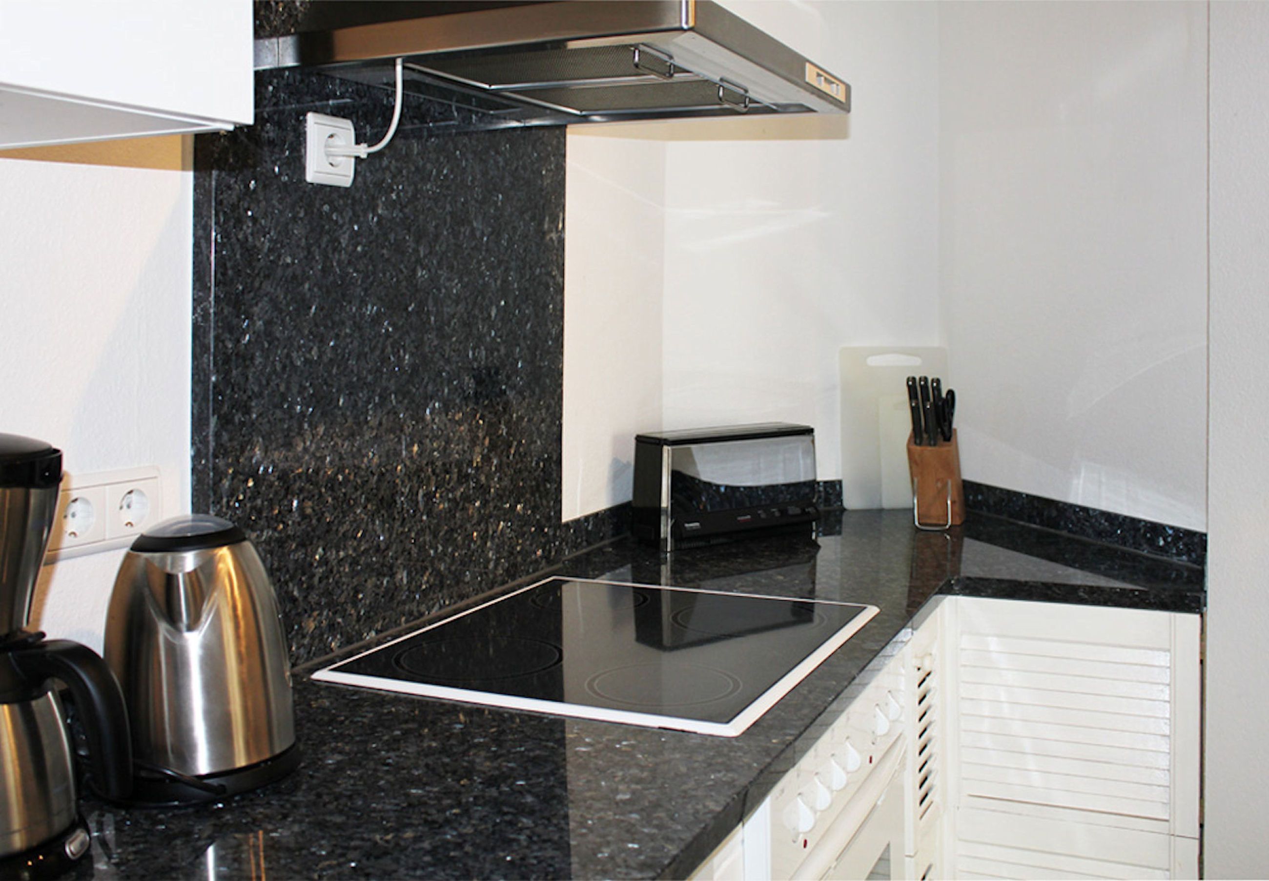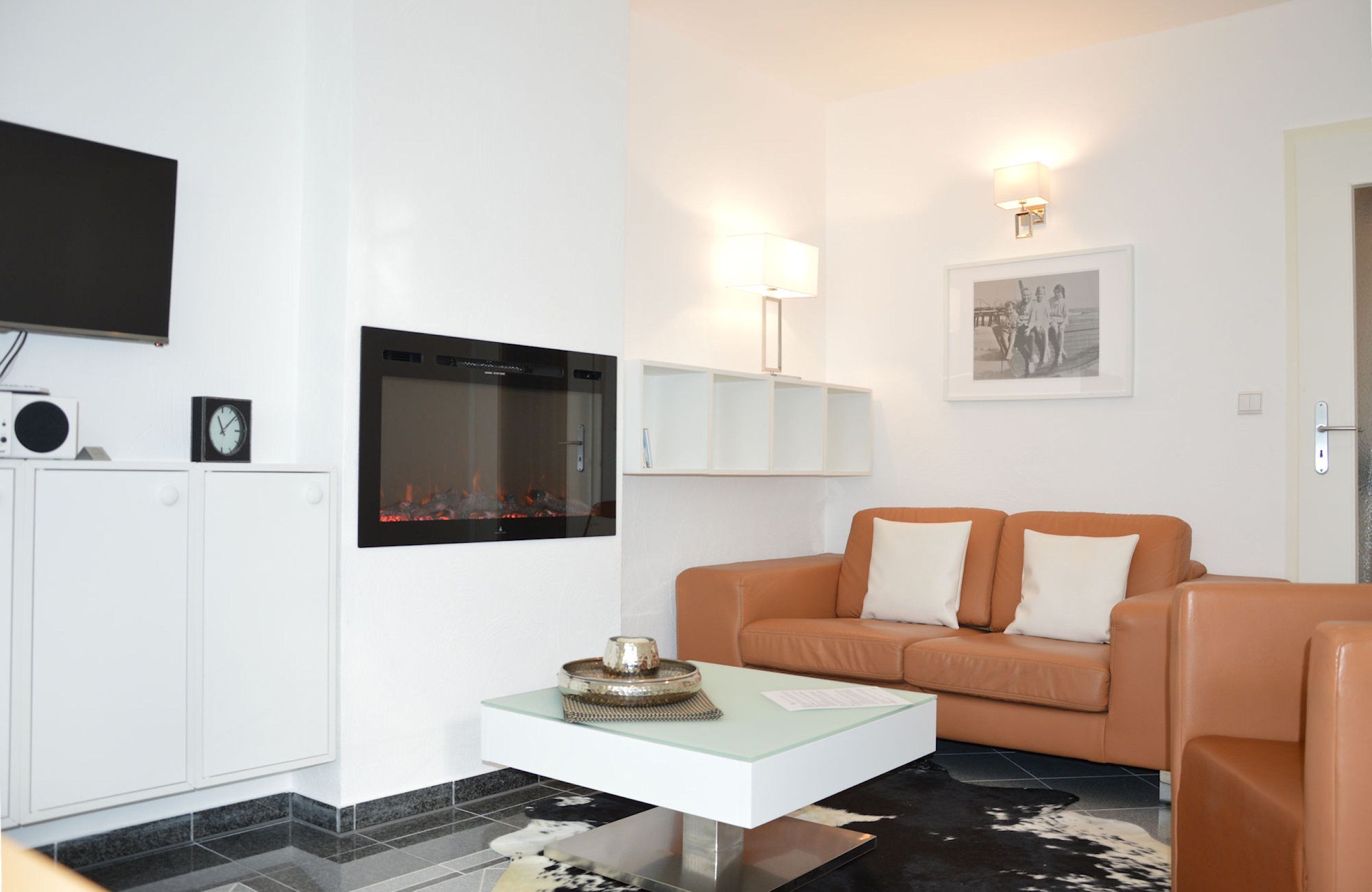 Der helle, großzügig geschnittene Wohn- und Schlafbereich mit 47m² und im Erdgeschoss mit separater Küche, Essplatz, TV und HiFi-Anlage ist elegant möbliert. Der Wohnraum mit Schlaf- und Essbereich ist mit einem Doppelbett ausgestattet, das eine großzügige Liegefläche von 180×200 cm bietet. Auf der Ledercouch mit LED-Kamin (Dekokamin, wärmt nicht) können sie TV oder Musik genießen. Die Wohnung verfügt über einen Schreibtisch, Esstisch und WLAN. Die Küchenzeile ist komplett ausgestattet mit 4-Platten-Cerankochfeld, Backofen, Geschirrspüler, Kühlschrank, Kaffeemaschine, Wasserkocher und Toaster. Ein komfortables Duschbad mit WC und Haartrockner ist ebenfalls vorhanden.