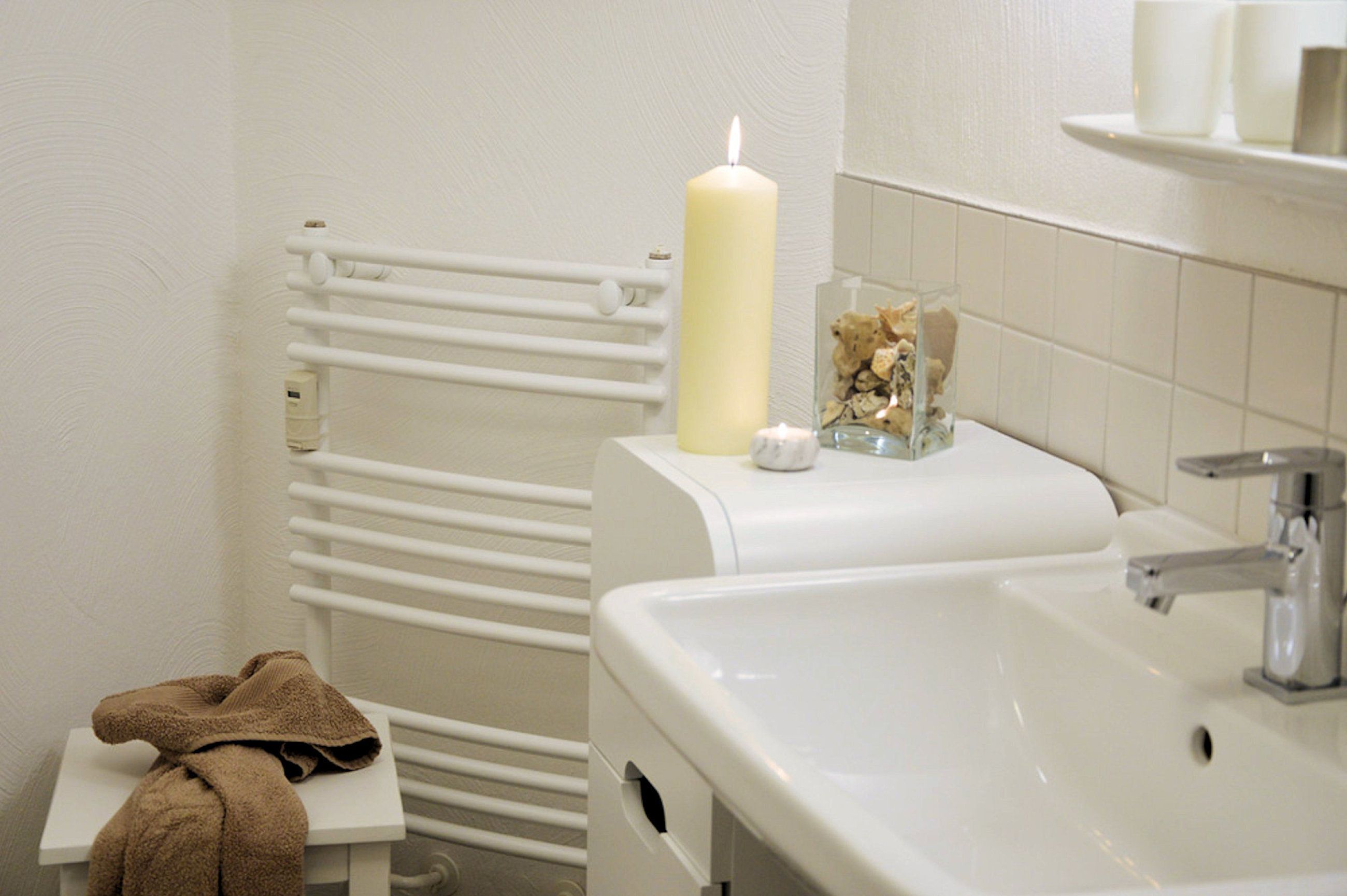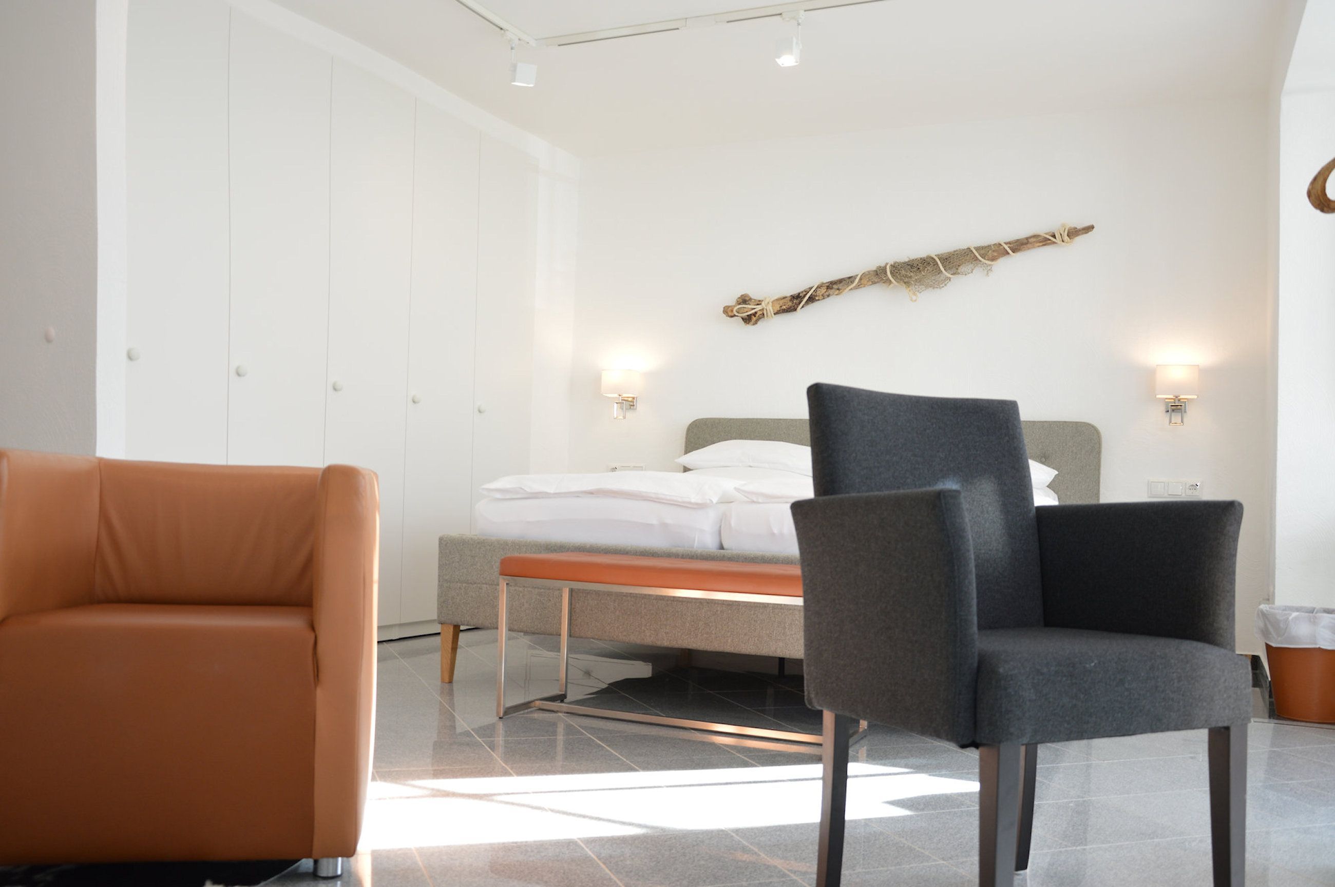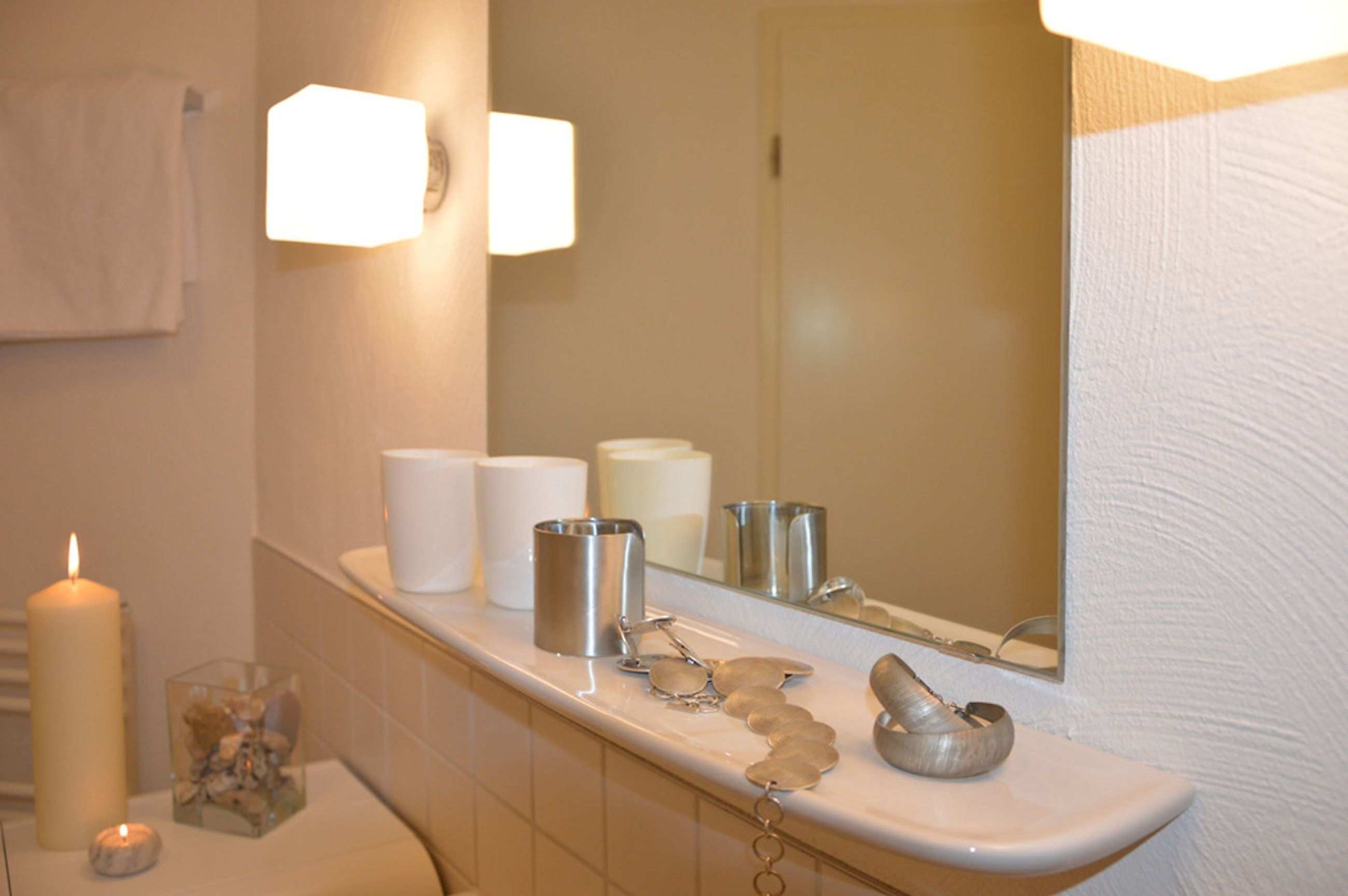 Der helle, großzügig geschnittene Wohn- und Schlafbereich mit 47m² und im Erdgeschoss mit separater Küche, Essplatz, TV und HiFi-Anlage ist elegant möbliert. Der Wohnraum mit Schlaf- und Essbereich ist mit einem Doppelbett ausgestattet, das eine großzügige Liegefläche von 180×200 cm bietet. Auf der Ledercouch mit LED-Kamin (Dekokamin, wärmt nicht) können sie TV oder Musik genießen. Die Wohnung verfügt über einen Schreibtisch, Esstisch und WLAN. Die Küchenzeile ist komplett ausgestattet mit 4-Platten-Cerankochfeld, Backofen, Geschirrspüler, Kühlschrank, Kaffeemaschine, Wasserkocher und Toaster. Ein komfortables Duschbad mit WC und Haartrockner ist ebenfalls vorhanden.