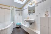 Das Badezimmer verfügt über eine Badewanne, ein WC, ein Waschbecken und reichlich Ablagefläche.