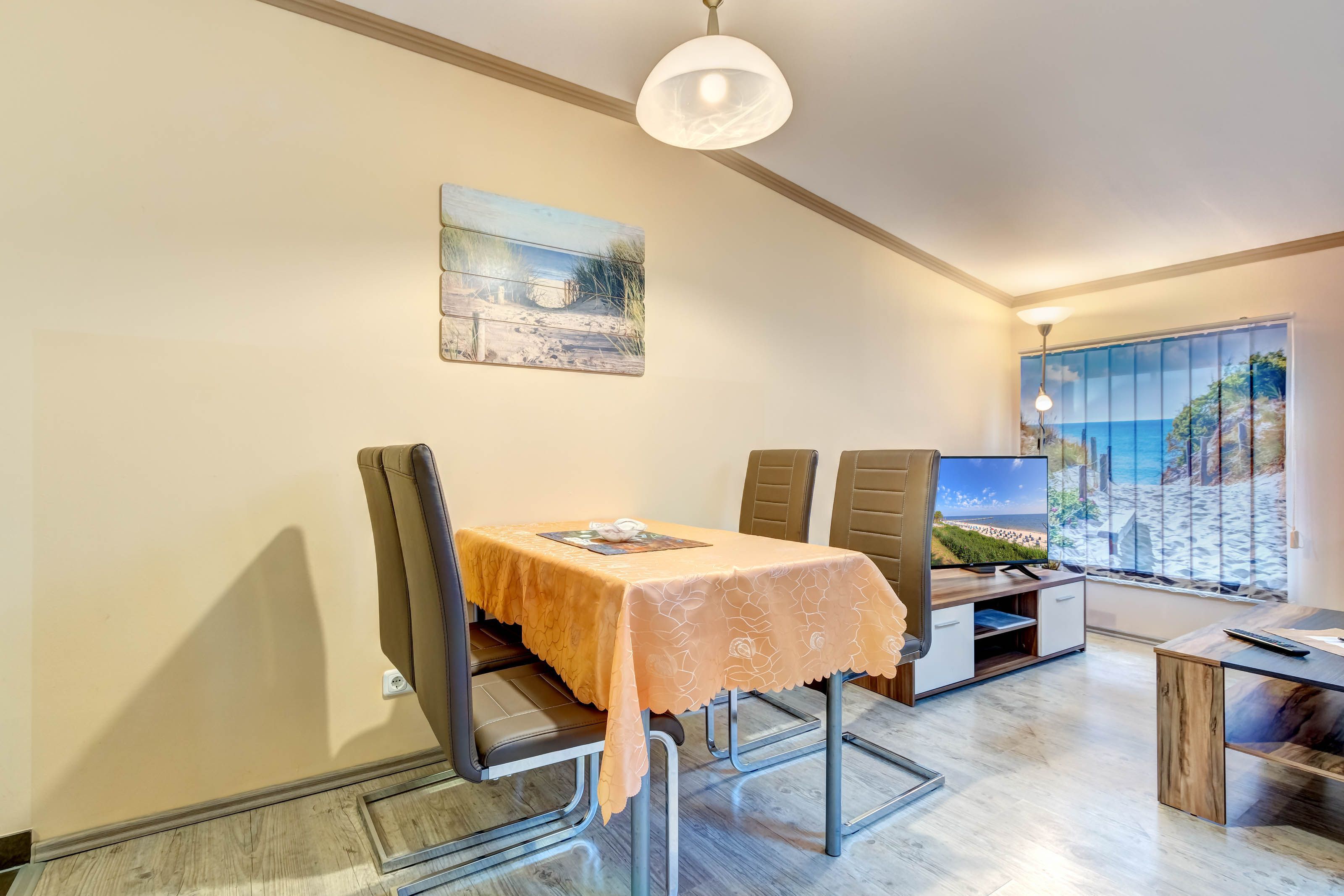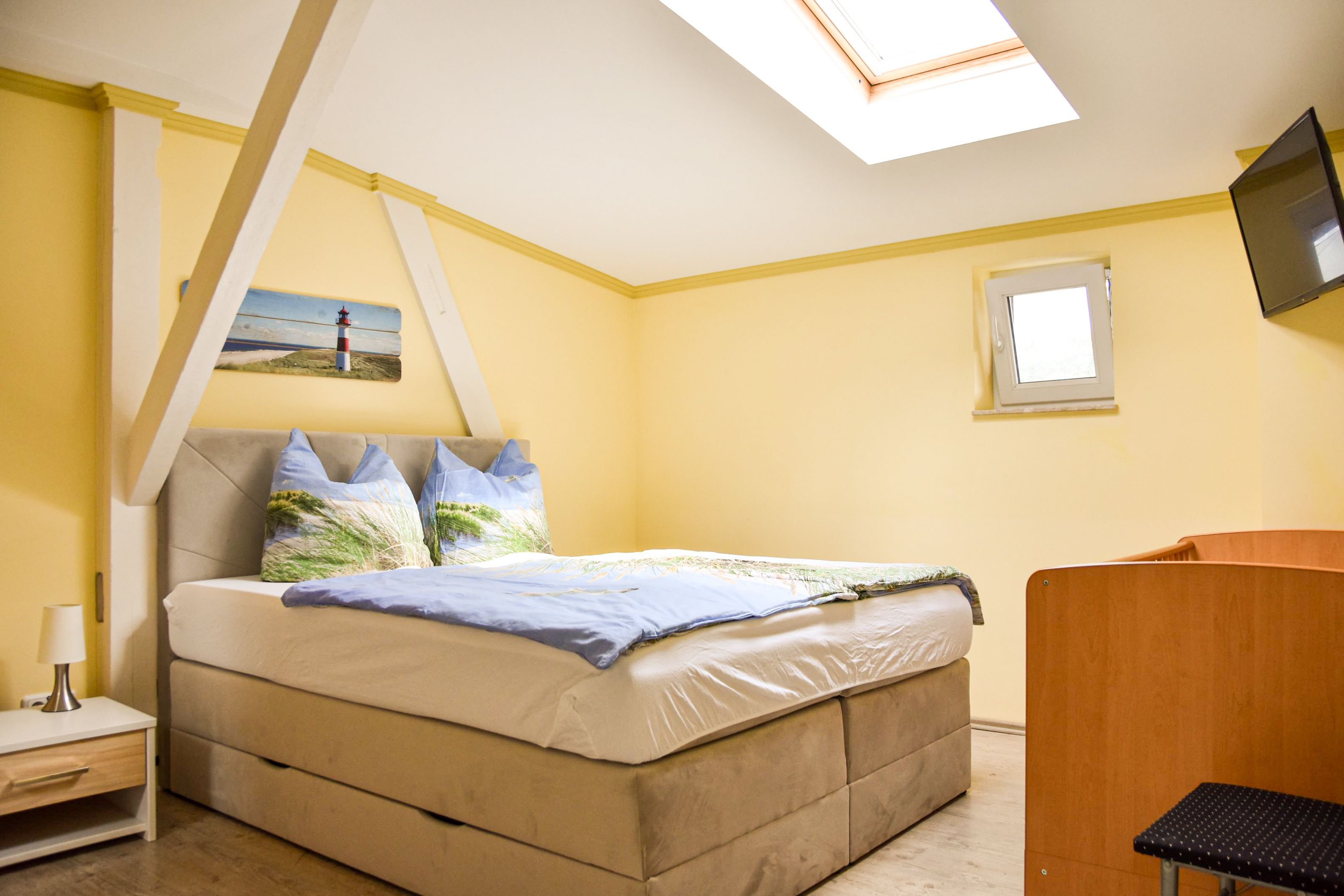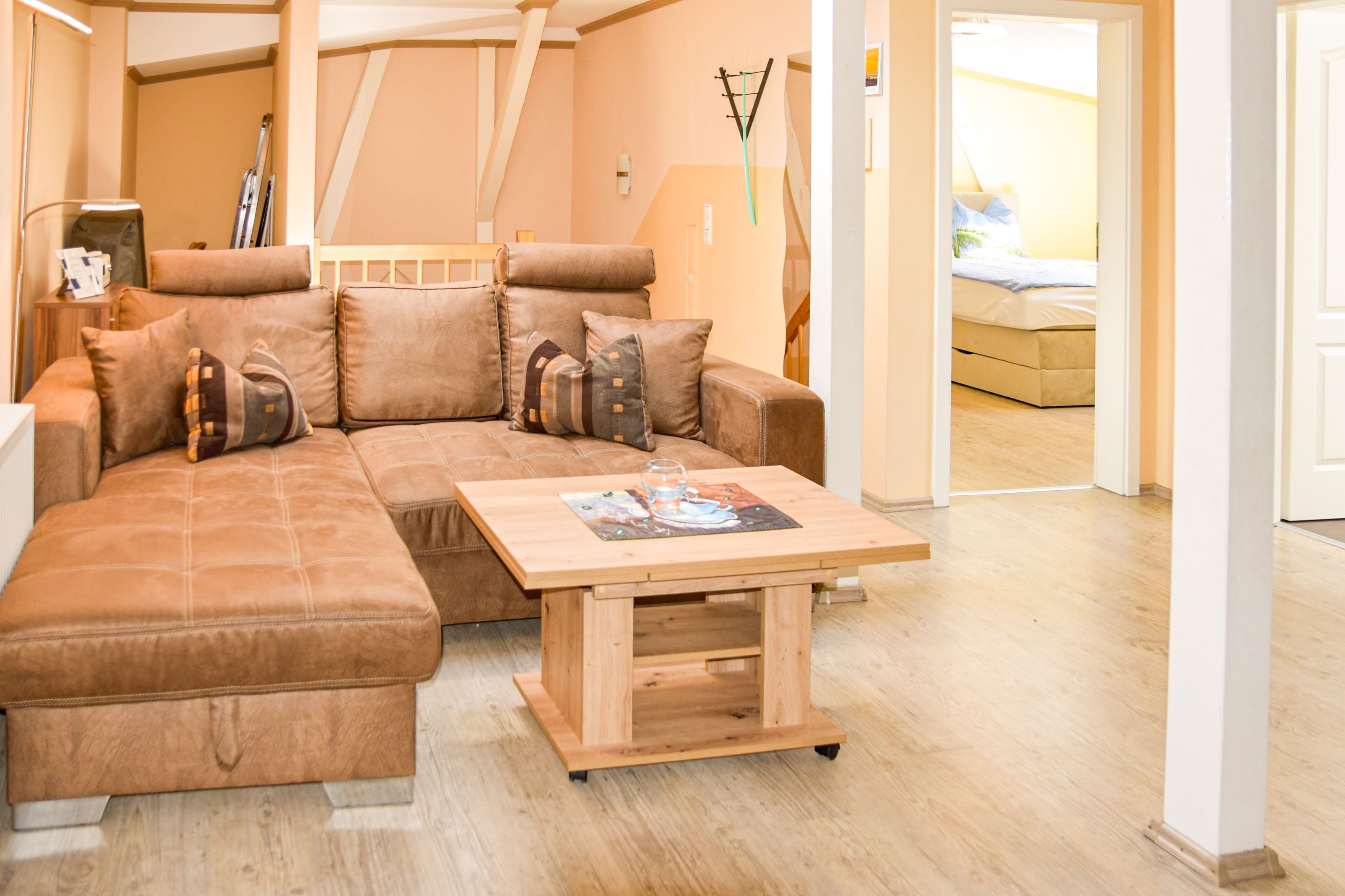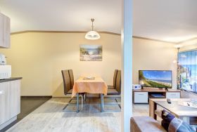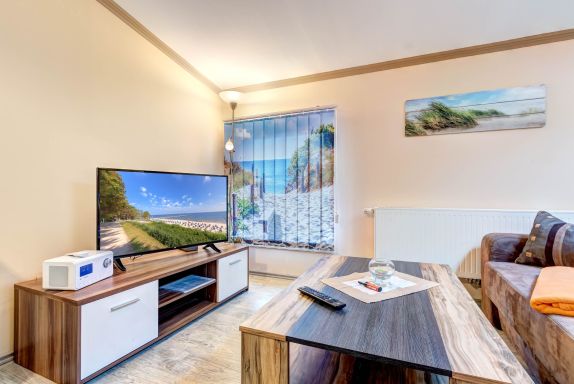 Die gemütliche 2-Raumwohnung für bis zu 4 Personen (plus ein Kleinkind bis 2 Jahre) ist modern eingerichtet und verfügt über ein großes Doppelbett im Schlafzimmer. Bettwäsche und Handtücher können selbst mitgebracht oder gegen Gebühr hinzugebucht werden. Bei Buchung des Wäschepakets sind die Betten bereits bezogen.