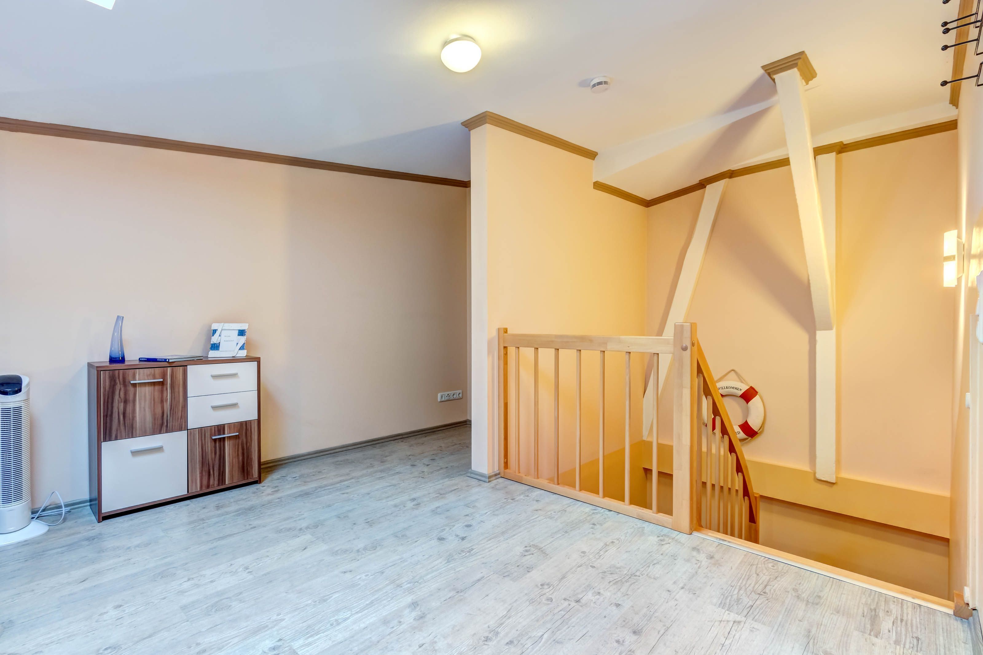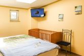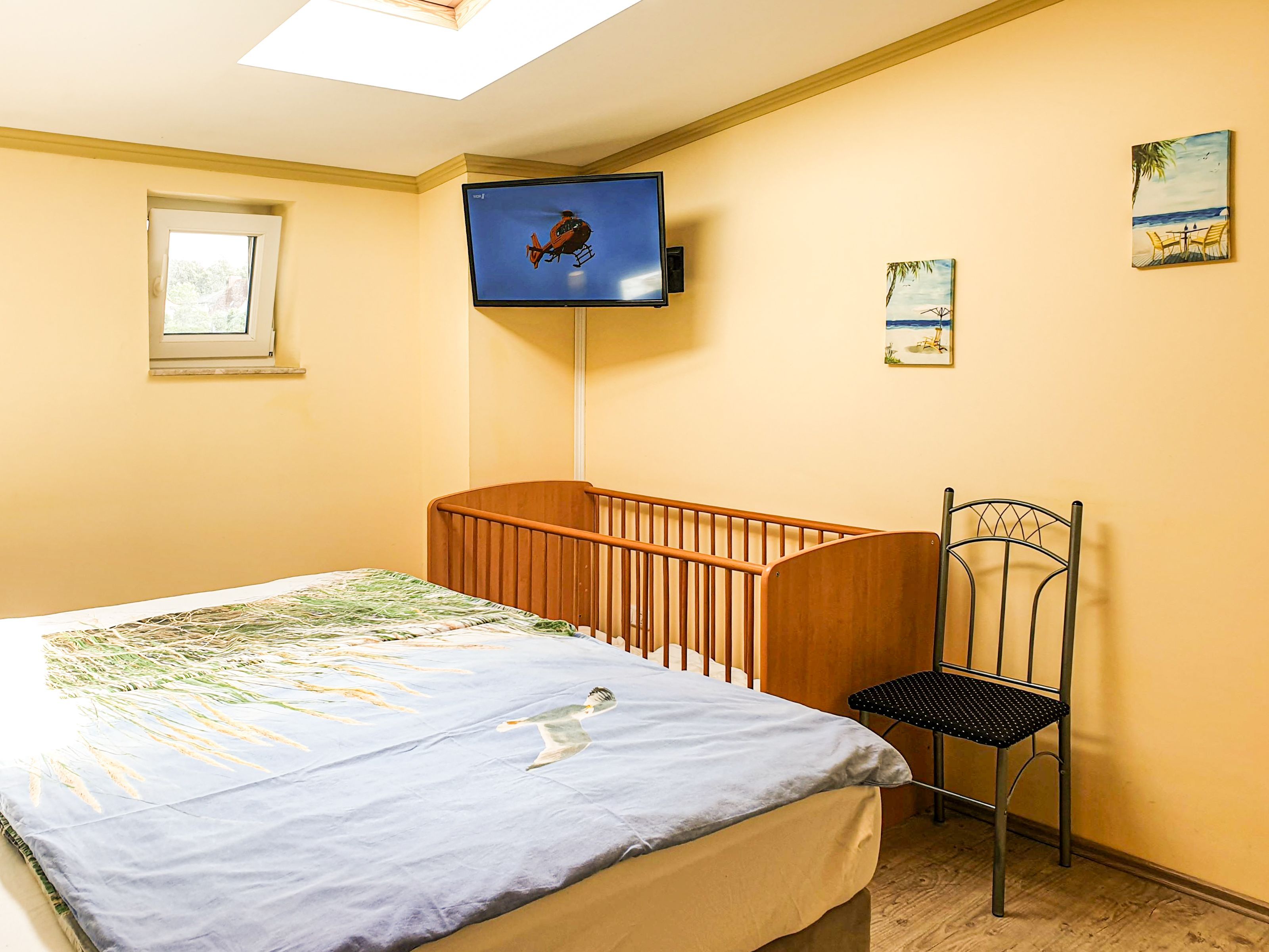 Die Ferienwohnung 01 befindet sich im Obergeschoss auf der linken Seite und bietet auf 57m² ausreichend Platz für bis zu 4 Personen plus Kleinkind. Es erwartet Sie ein großzügiger Wohnraum mit einer offenen, vollständig ausgestatteten Küche, sowie einem Esstisch und eine komfortable Couch. Letztere kann zu einer Schlafcouch ausgezogen werden und bietet Platz für zwei Personen. An kalten Tagen und am Abend können Sie es sich vor dem Flat-TV gemütlich machen. Im separaten Schlafzimmer finden zwei weitere Personen im großen Doppelbett Platz. Dort können Sie auch Ihre Habseligkeiten im Kleiderschrank verstauen. Auch ein Kinderbett und ein weiterer Flat-TV befinden sich im Schlafzimmer.