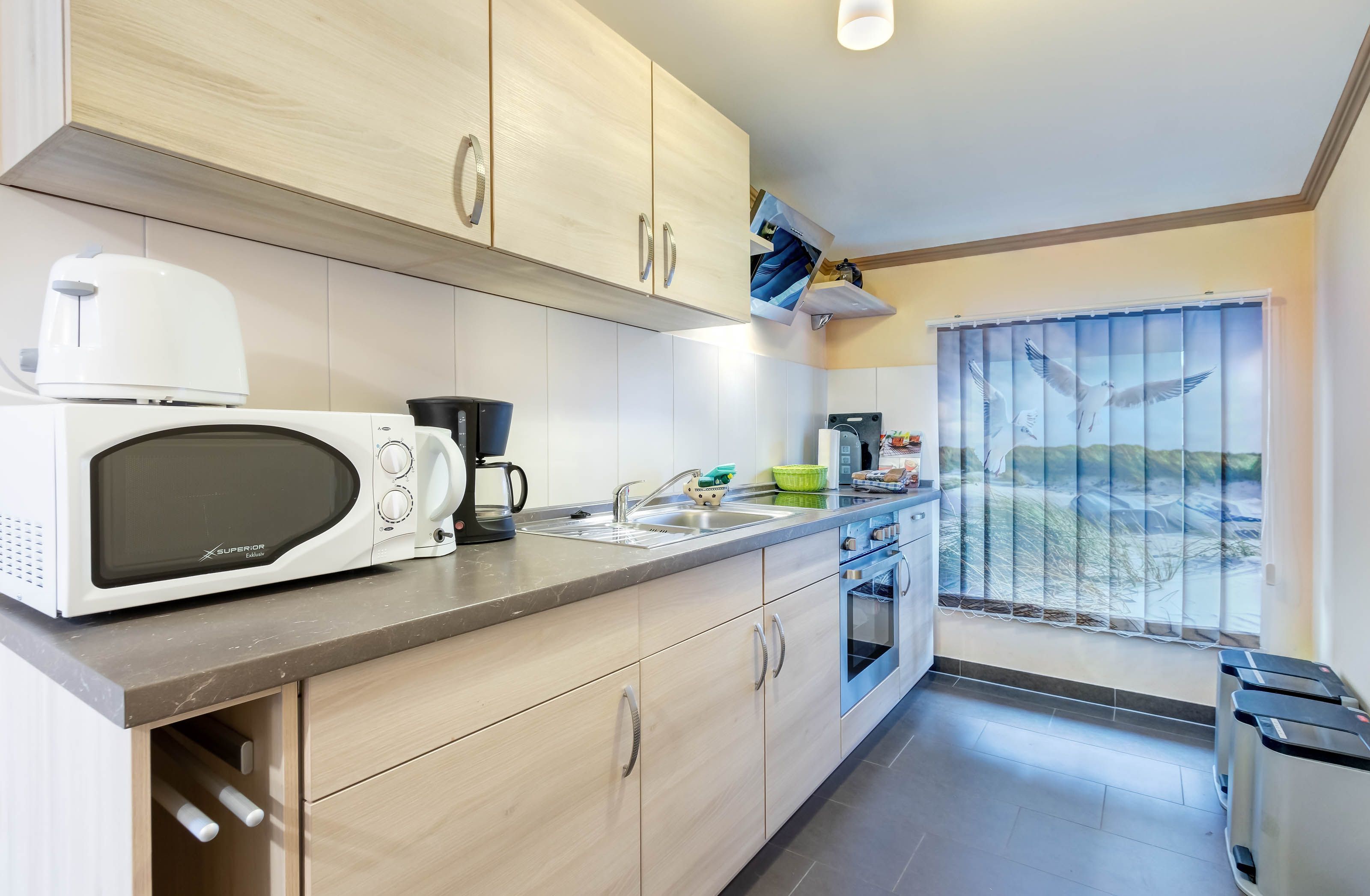 Ein Kinderbett und Hochstuhl stehen kostenfrei zur Verfügung. Die Wohnung ist mit einer Küchenzeile, einer hochwertigen Sitzgarnitur (die auch als Bett genutzt werden kann) sowie modernen Geräten wie Herd, Kühlschrank, Mikrowelle, Toaster, Wasserkocher und Kaffeemaschine ausgestattet.