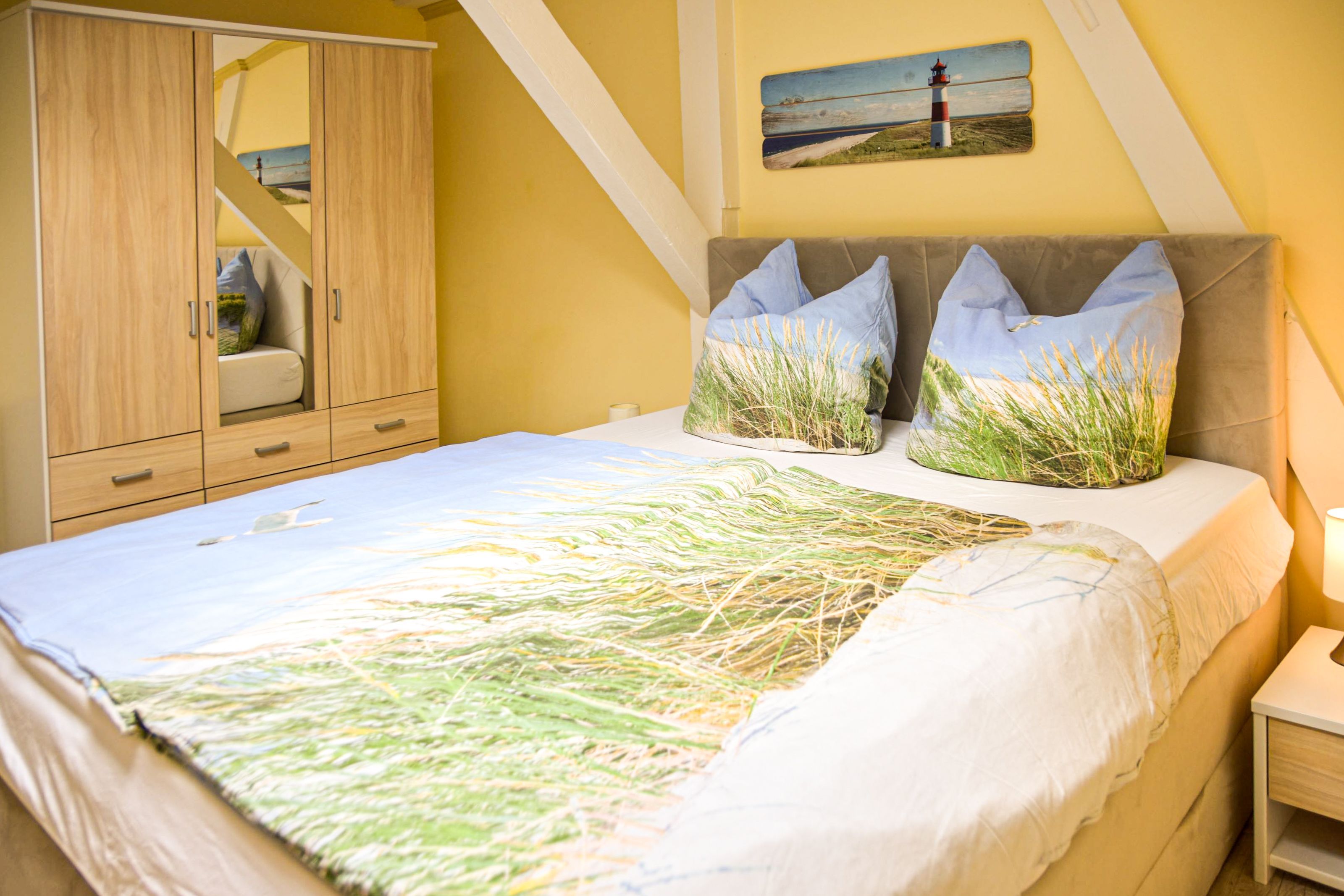 WG01 ist eine Ferienwohnung im Obergeschoss mit 57 m² für bis zu 4 Personen, ggf. zzgl. Kleinkind bis 2 Jahre. Die Wohnung ist mit einem Schlafzimmer mit Doppelbett und mit Schlafsofa im Wohnzimmer ausgestattet. Die Küche ist mit Einbauküche und allen notwendigen elektrischen Geräten ausgestattet. Im Bad befindet sich eine Badewanne.