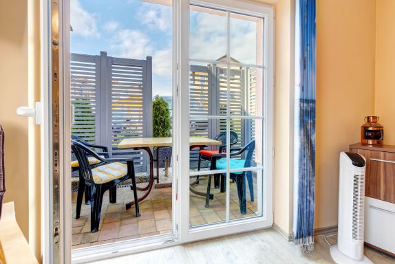 Über das Wohnzimmer erhalten Sie Zutritt zur möblierten Terrasse.