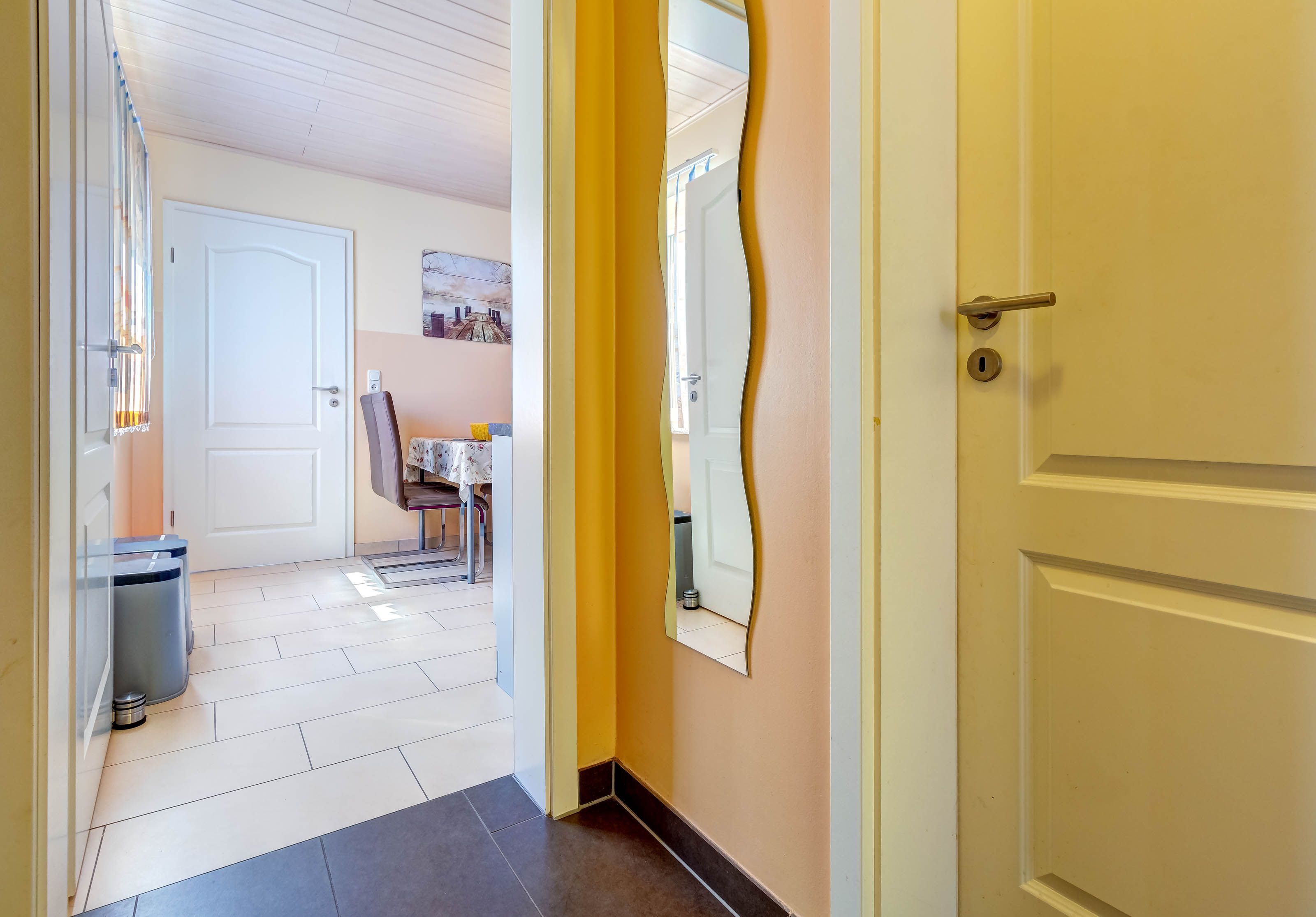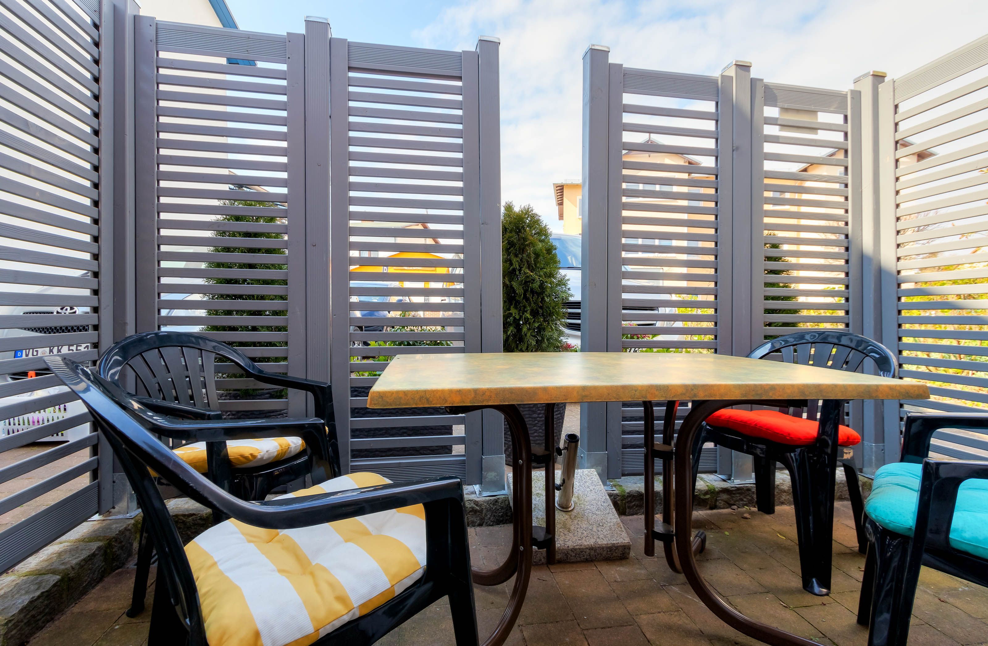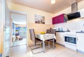 Die Ferienwohnung 04 liegt im Erdgeschoss auf der rechten Seite des Hauses und bietet auf 46m² ausreichend Platz für bis zu 4 Personen plus Kleinkind. Der großzügige Wohnraum empfängt Sie mit einer komfortablen Couch, einem Flat-TV und ein Radio. Die Couch kann ausgezogen werden und bietet zwei Personen bequem Platz. Vom Wohnraum aus können Sie auf Ihre private Terrasse treten, wo Sie ein Tisch und vier Stühle erwarten. Über eine kleine Treppe mit drei Stufen gelangen Sie in die voll ausgestattete Küche mit Esstisch.