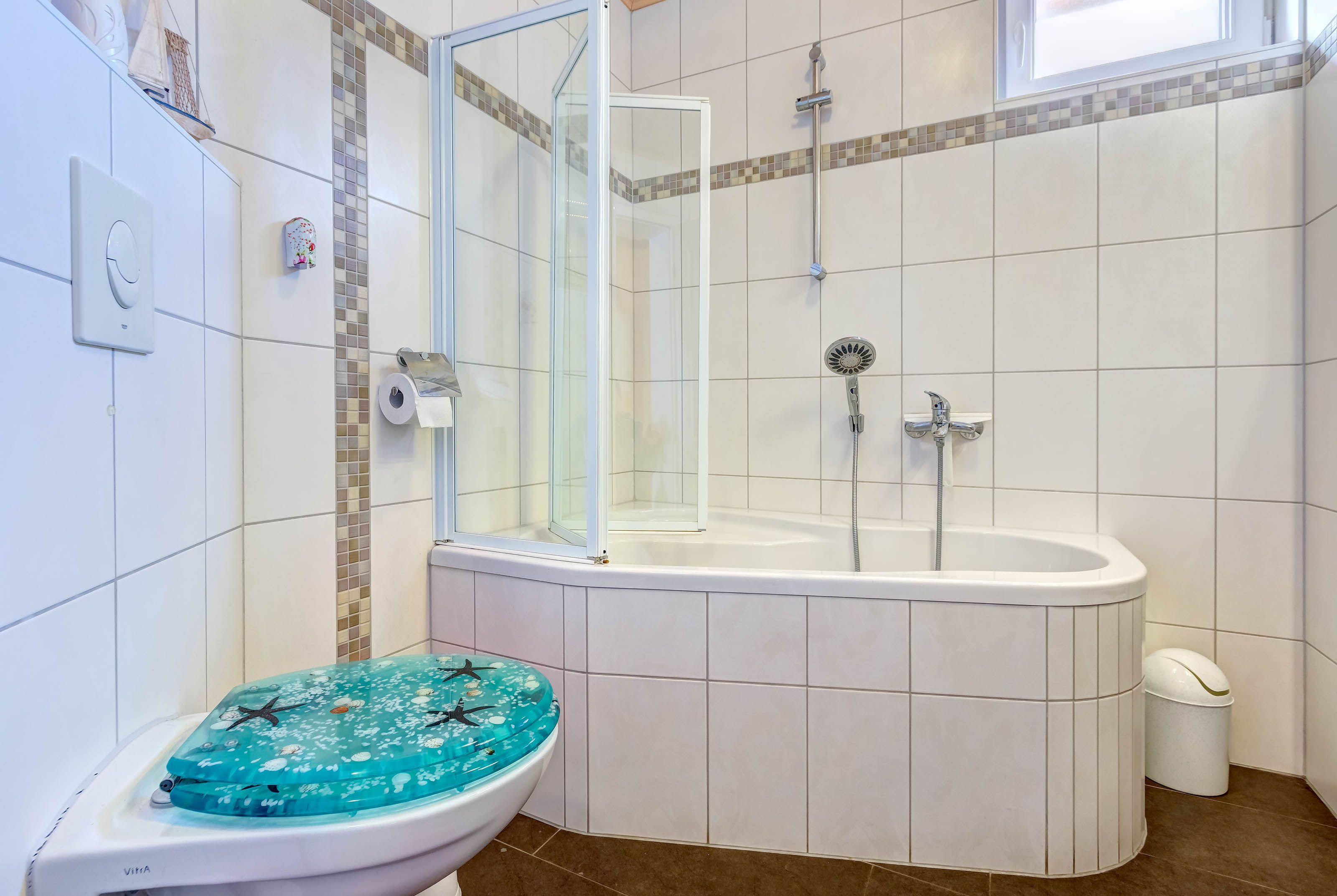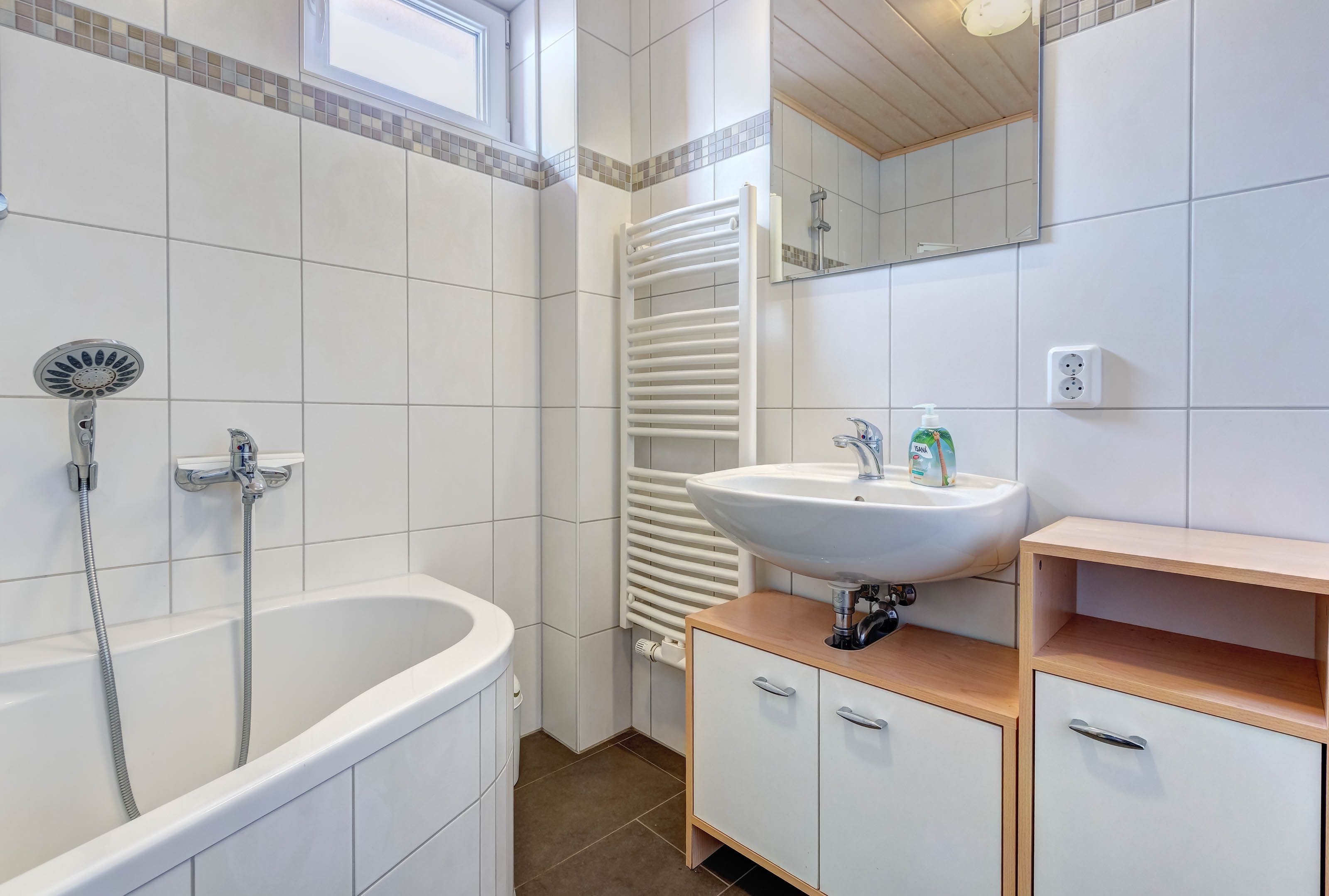 Das Badezimmer, mit kleinem Fenster, verfügt über eine Dusch-Badewanne, ein WC, ein Waschbecken, sowie reichlich Ablagefläche und zwei kleine Schränke.