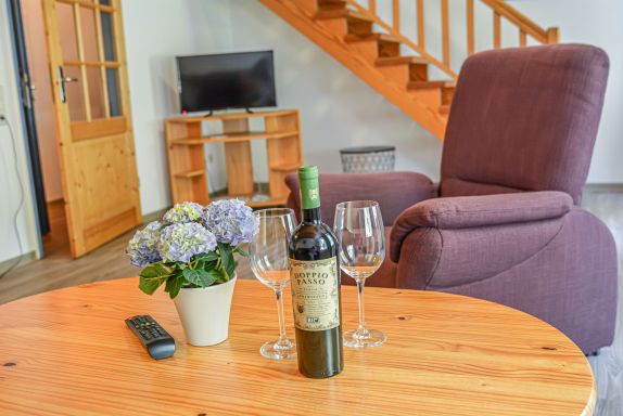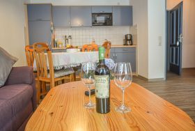 Die Ferienwohnung besteht aus einem Wohnzimmer mit Küche und Esstisch. Oben befinden sich das Schlafzimmer mit drei Betten und dem Bad (Gesamtgröße ca. 53 qm). Die Fußböden wurden mit hochwertigen Vinylboden ausgelegt.