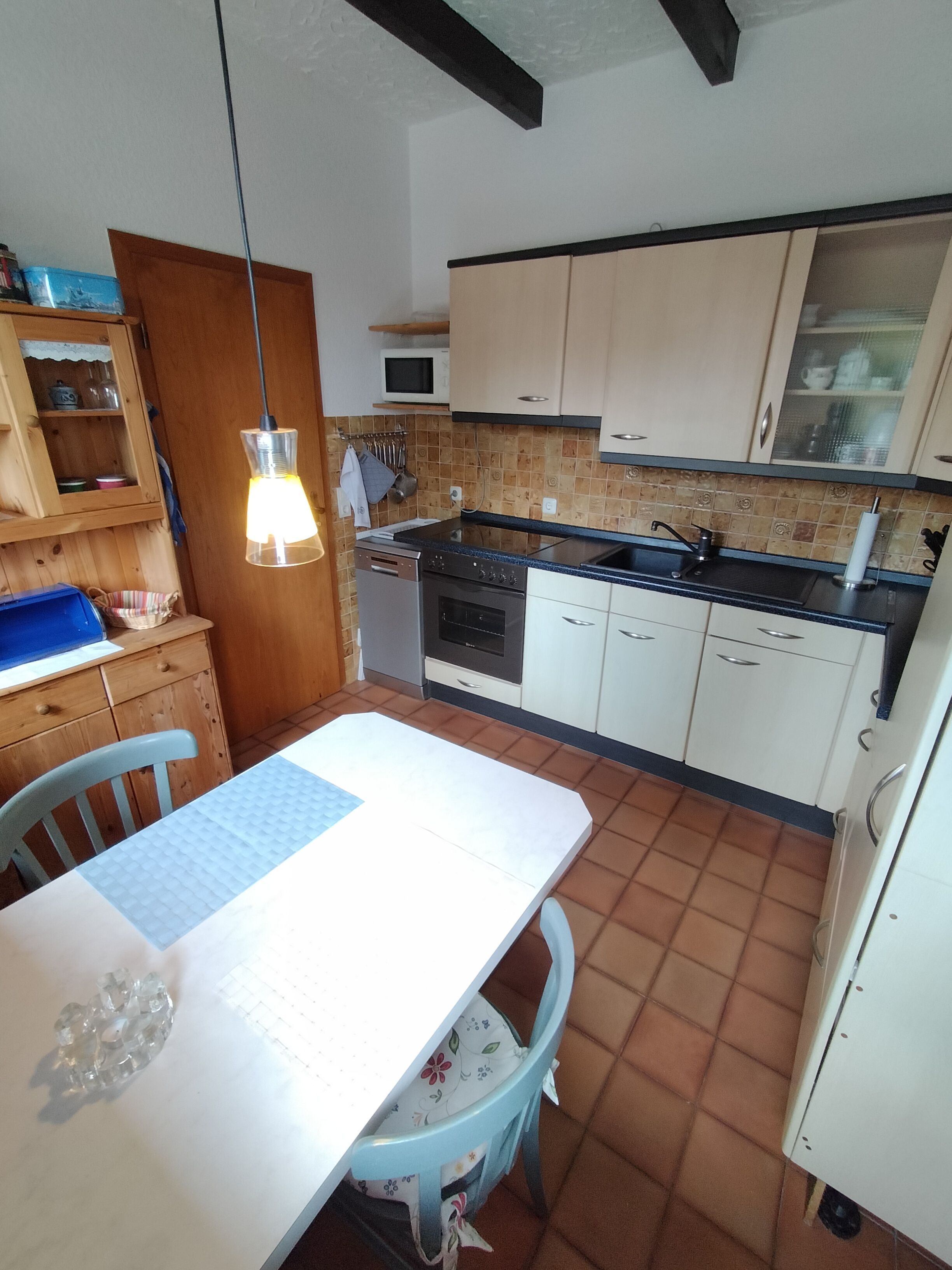 Mikrowelle, Kaffeemaschine, Toaster, Wasserkocher, Mixer sowie viele andere Küchengeräte und Geschirr sind vorhanden.