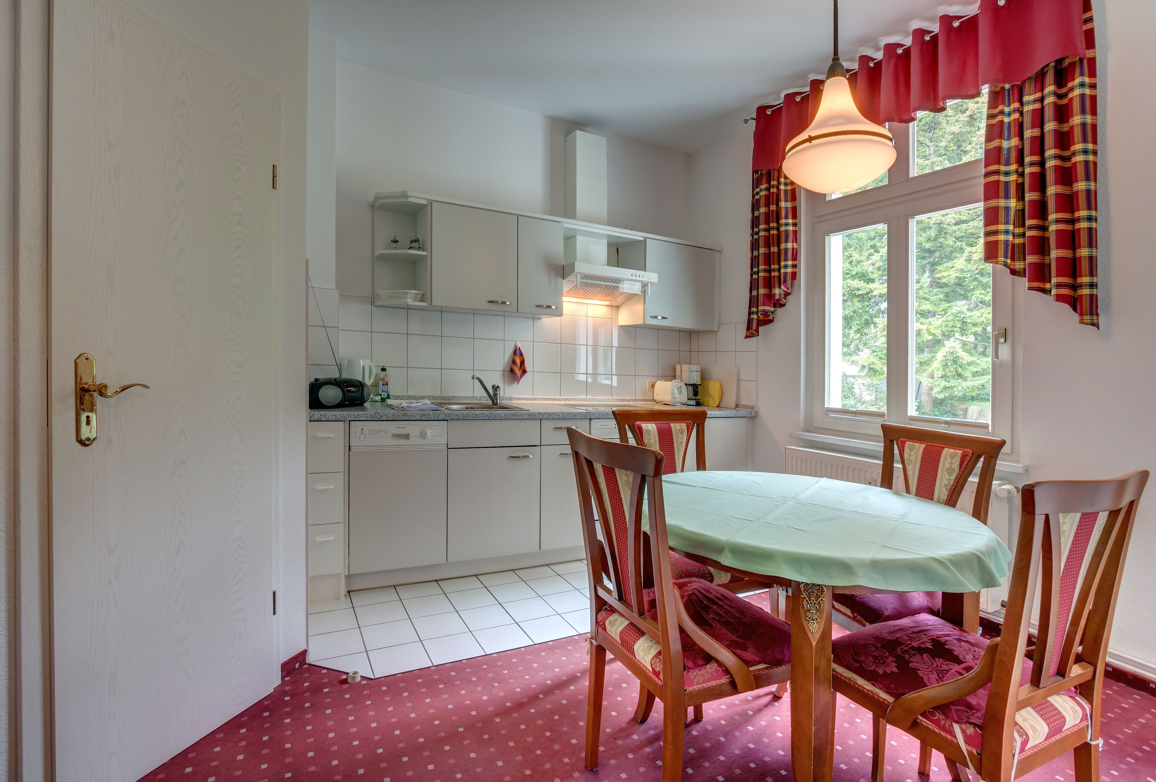 Sie ist mit einer komplett eingerichteten Küchenzeile ausgestattet. Sie finden hier u.a. Herd, Kühlschrank und Kaffeemaschine sowie Wasserkocher.