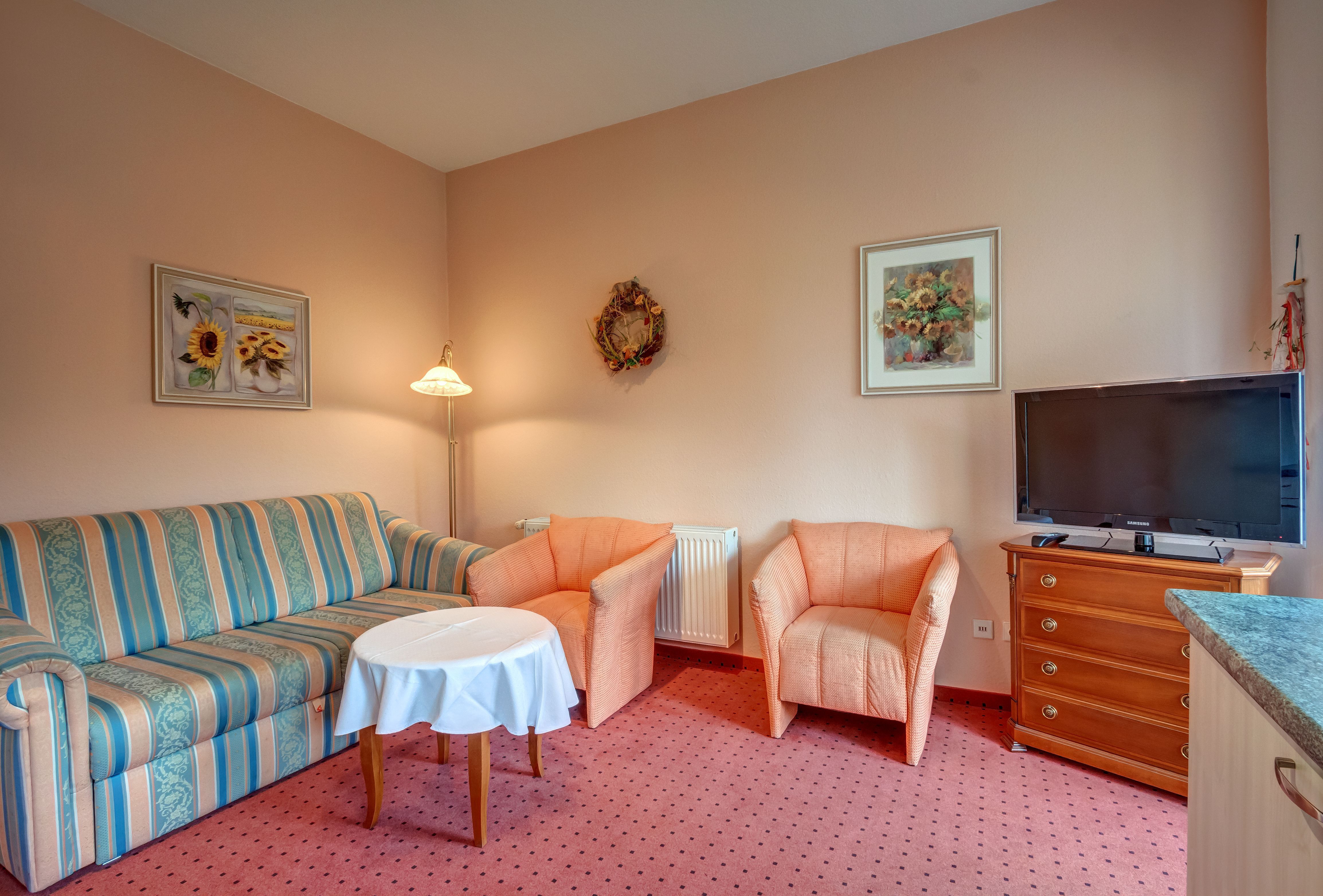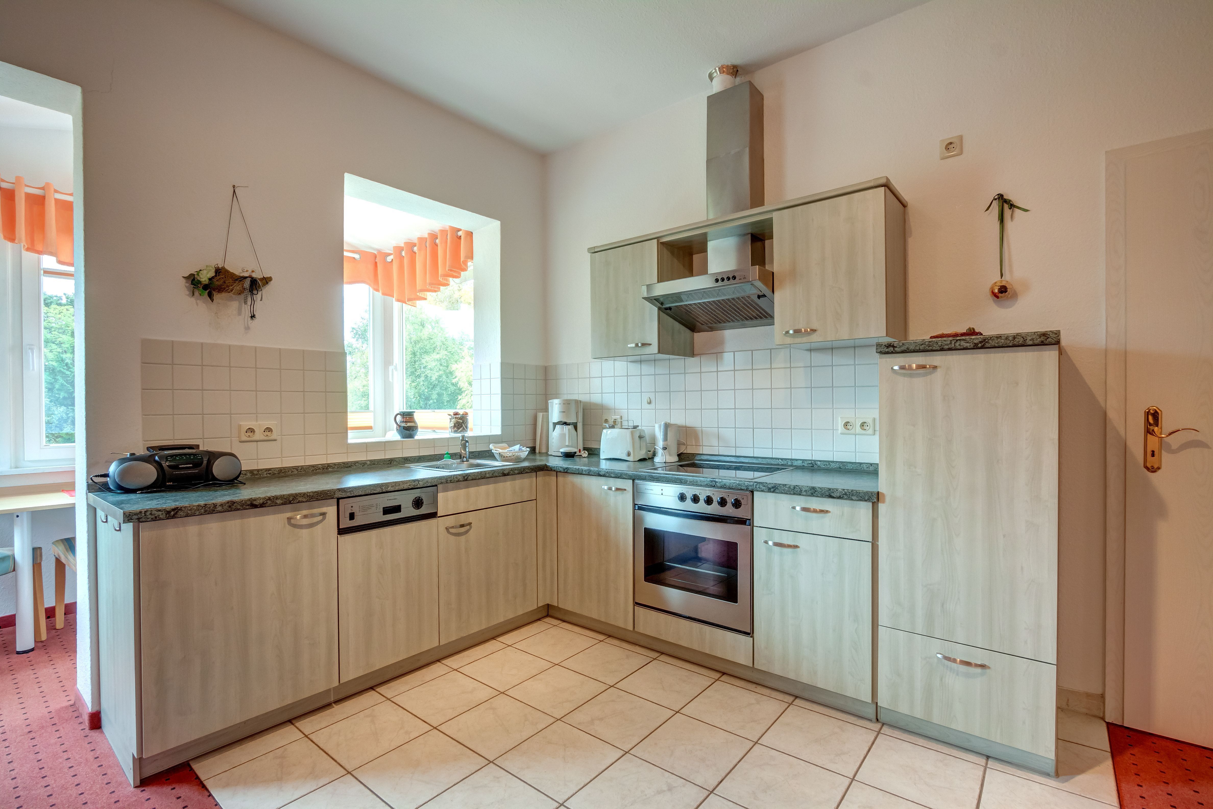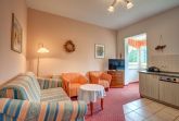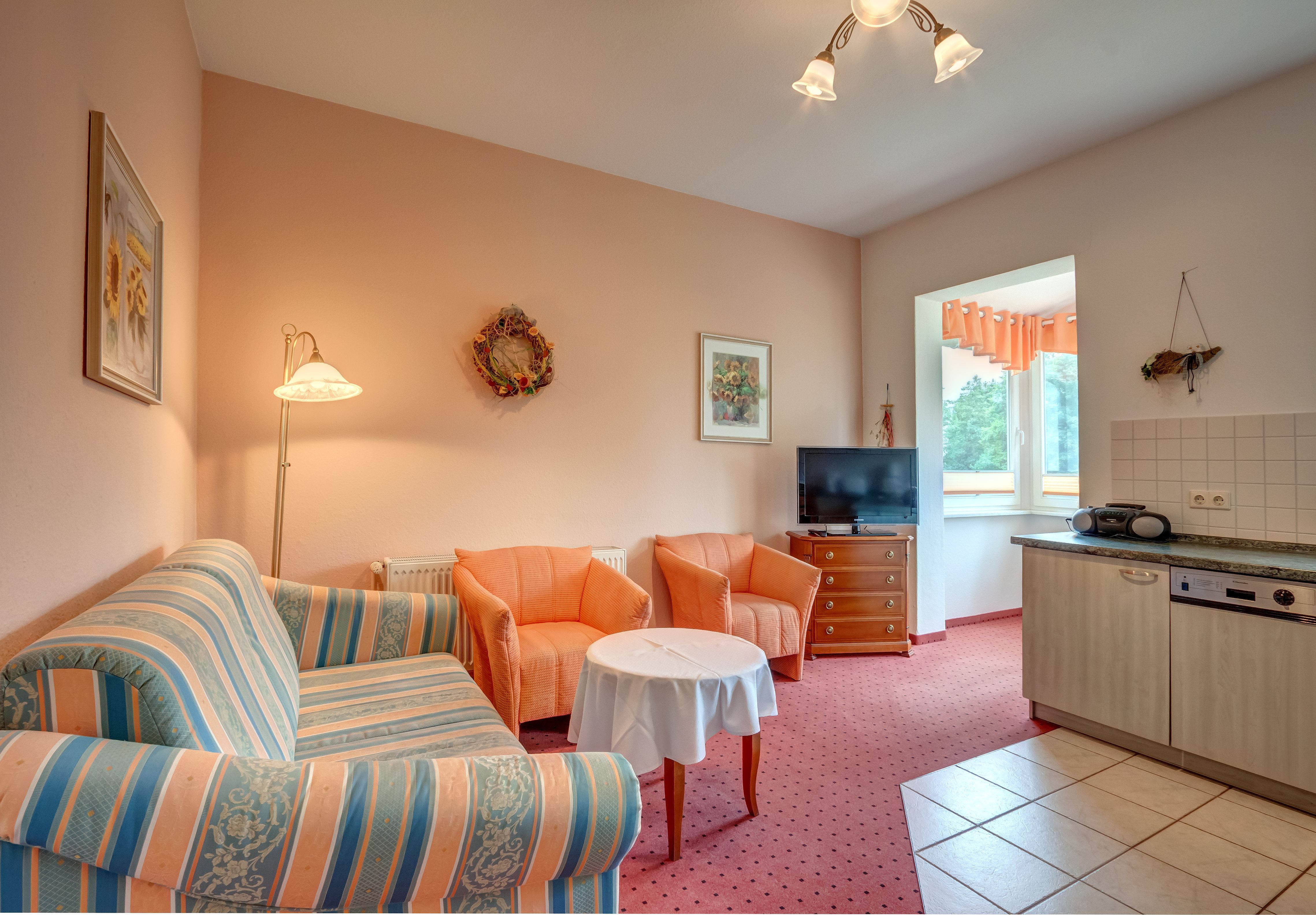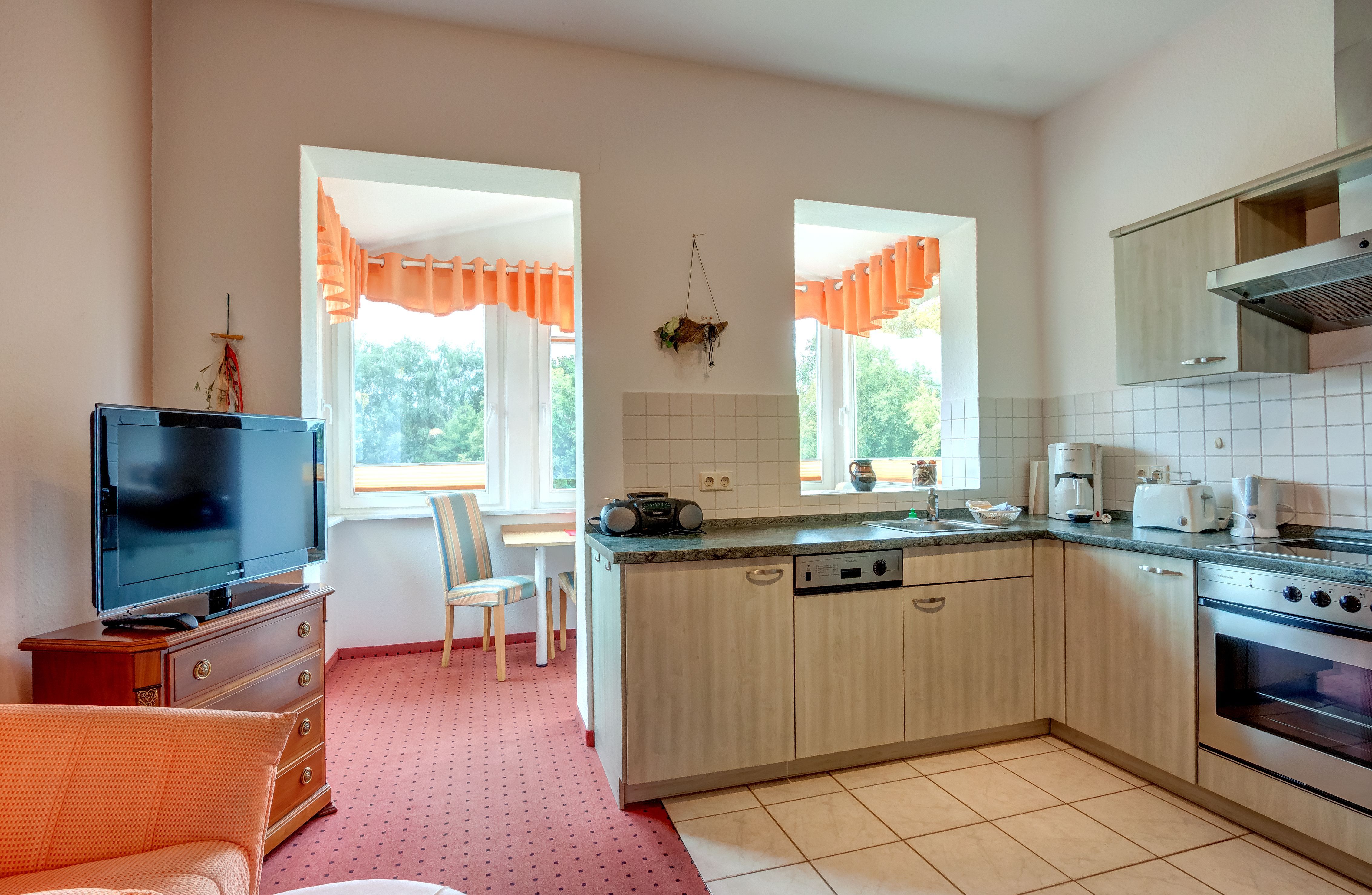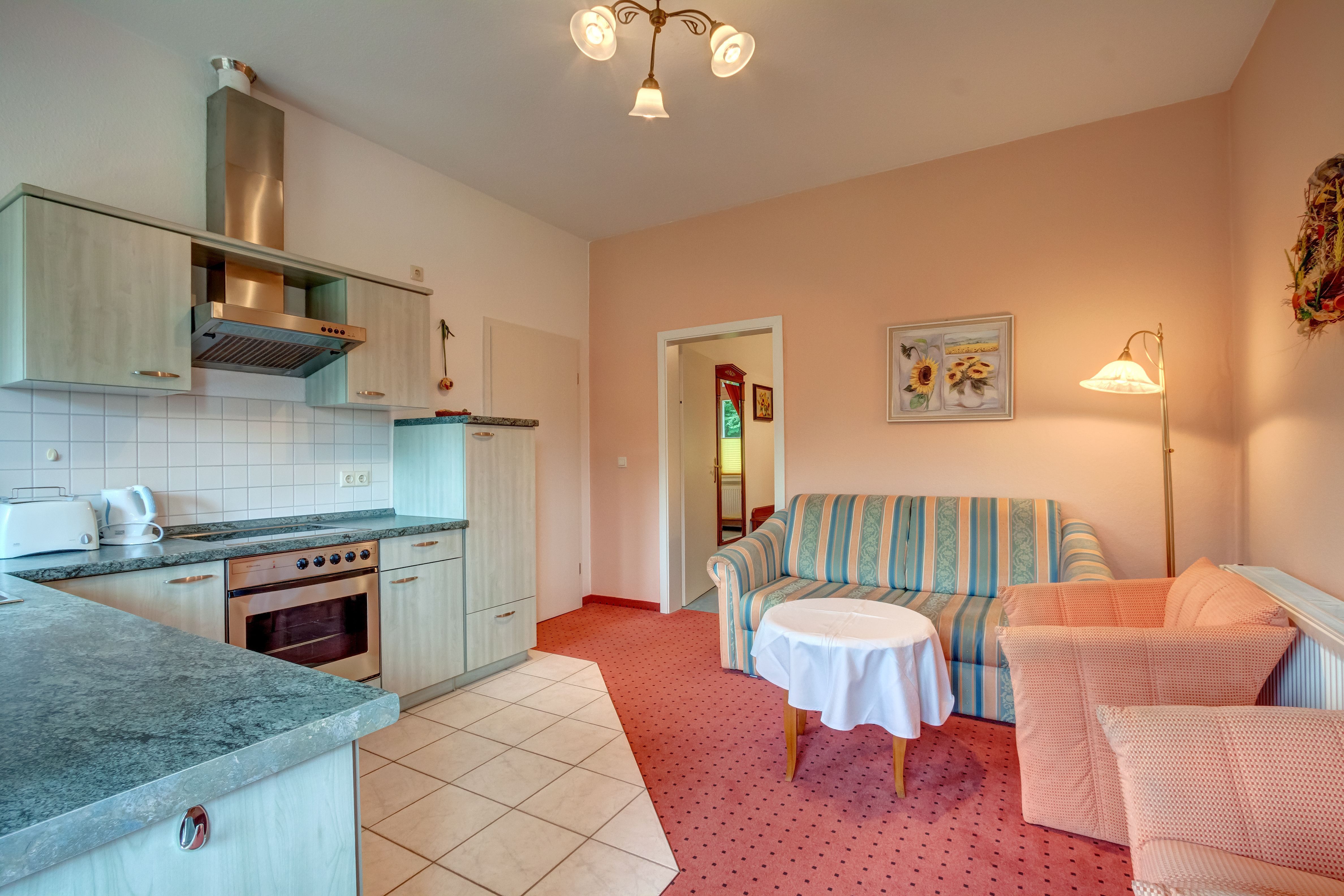 Geräumige 2-Raumwohnung mit separaten Schlafzimmer, Wohnraum mit offener Küche und verglaster Veranda. Ein Schlafsofa bietet die Möglichkeit zur Aufbettung für eine weitere Person. Das Badezimmer mit Fenster, Dusche und WC bietet genügend Platz für alle.