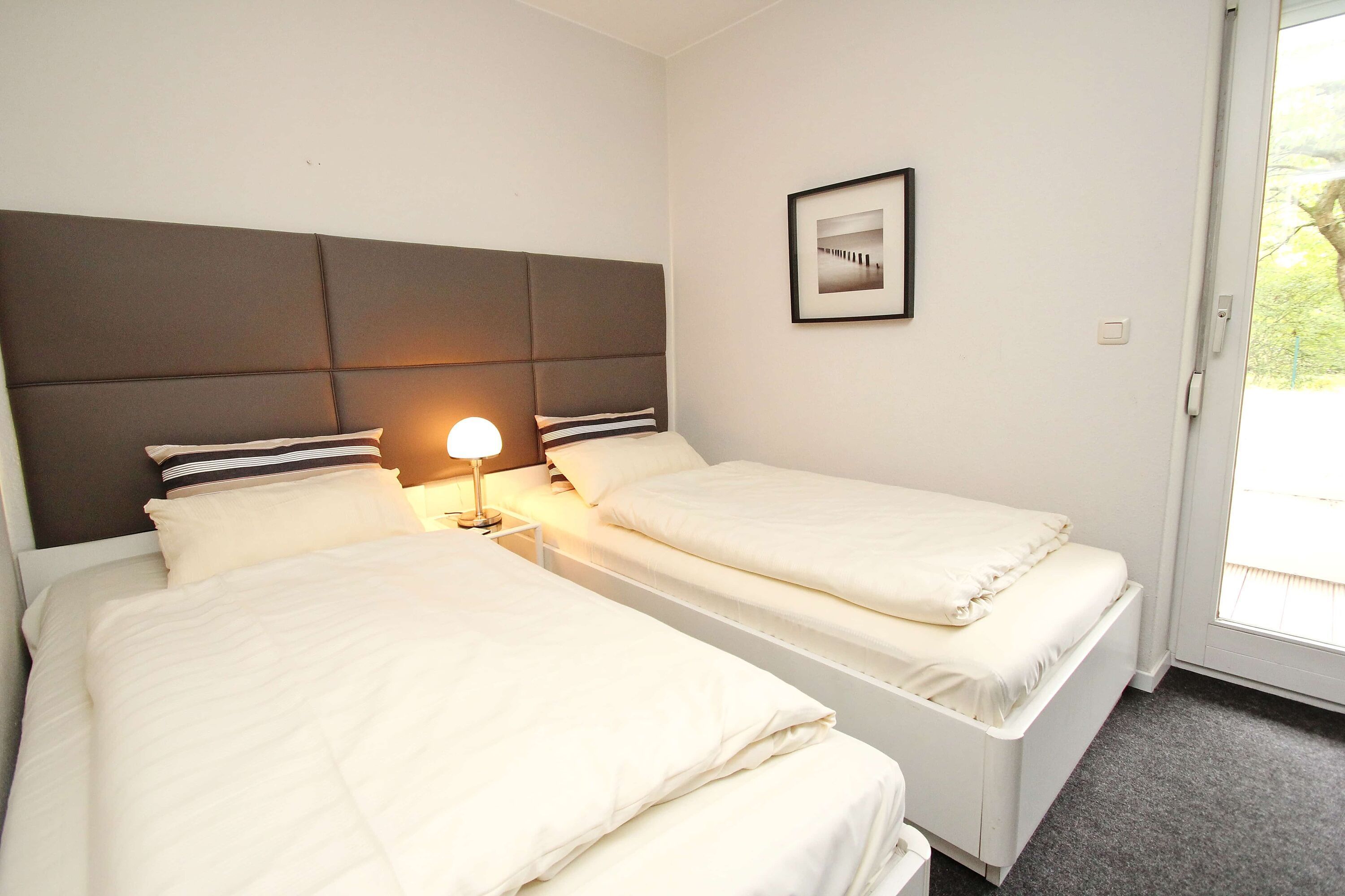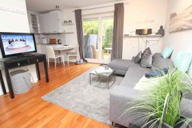 Dieses moderne und komfortable Appartement liegt in einer ruhigen, exklusiven Wohnanlage in der Kaiserallee. Die sehr schöne Einrichtung im Wohnzimmer, mit Zugang zur Terrasse, besteht aus einer gemütlichen Sitz-/Schlafcouch (120 cm x 200 cm) mit einem kleinen Tisch. Die offene Küche ist mit einer praktischen Essecke und einer Anrichte ausgestattet. Das Schlafzimmer, ebenfalls mit Terrasse, erreichen Sie vom Wohnzimmer. Hier befinden sich zwei bequeme Einzelbetten (je 100 cm x 200 cm) und ein Kleiderschrank. Das Bad, auch abgehend vom Wohnraum, ist neuwertig und ansprechend. Die individuellen Accessoires verleihen dieser Wohnung eine behagliche Atmosphäre zum Wohlfühlen. Beide Terrassen laden zum Relaxen ein und bieten einen Blick in die Gartenanlage.