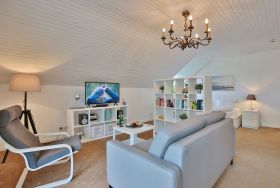 Die offene Küchenzeile bietet Backofen, Mikrowelle, Geschirrspülmaschine, Kühlschrank mit Tiefkühlfach, Kaffeemaschine, Mikrowelle, Wasserkocher und Toaster. Die Essecke verbindet die offene Küche mit dem großzügigen Wohn -und Schafbereich.