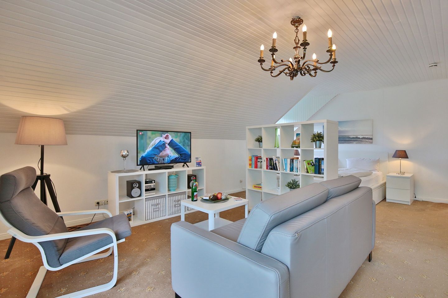 Der Wohn- / Schlafraum ist mit einem Doppelbett ( 1,80 m x 2,00 m, einzelne Matratzen ), Kleiderschrank, einer gemütlichen Leder-Couchgarnitur, Hi-Fi Anlage, Flachbild- TV und Außenjalousien ausgestattet.