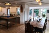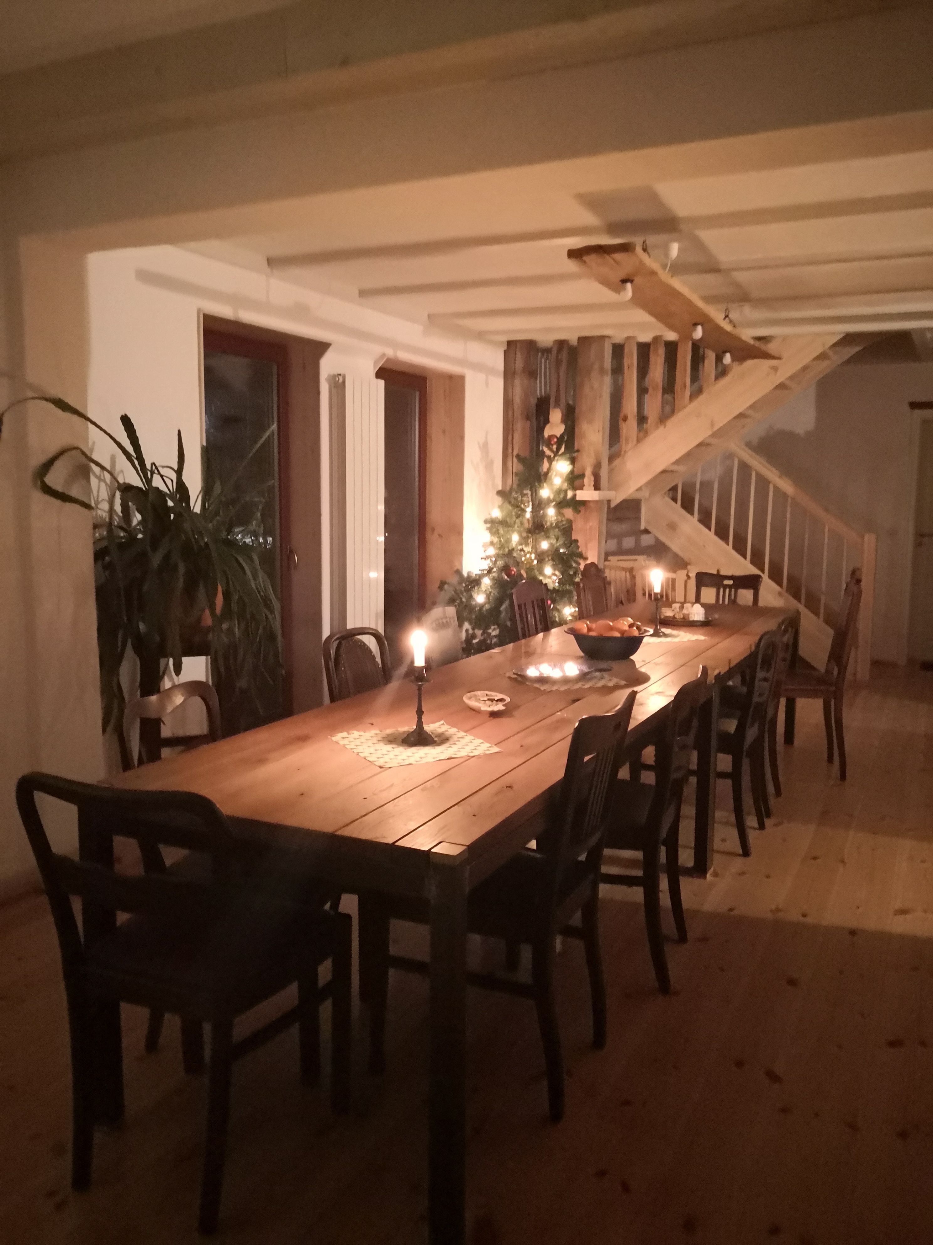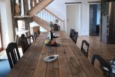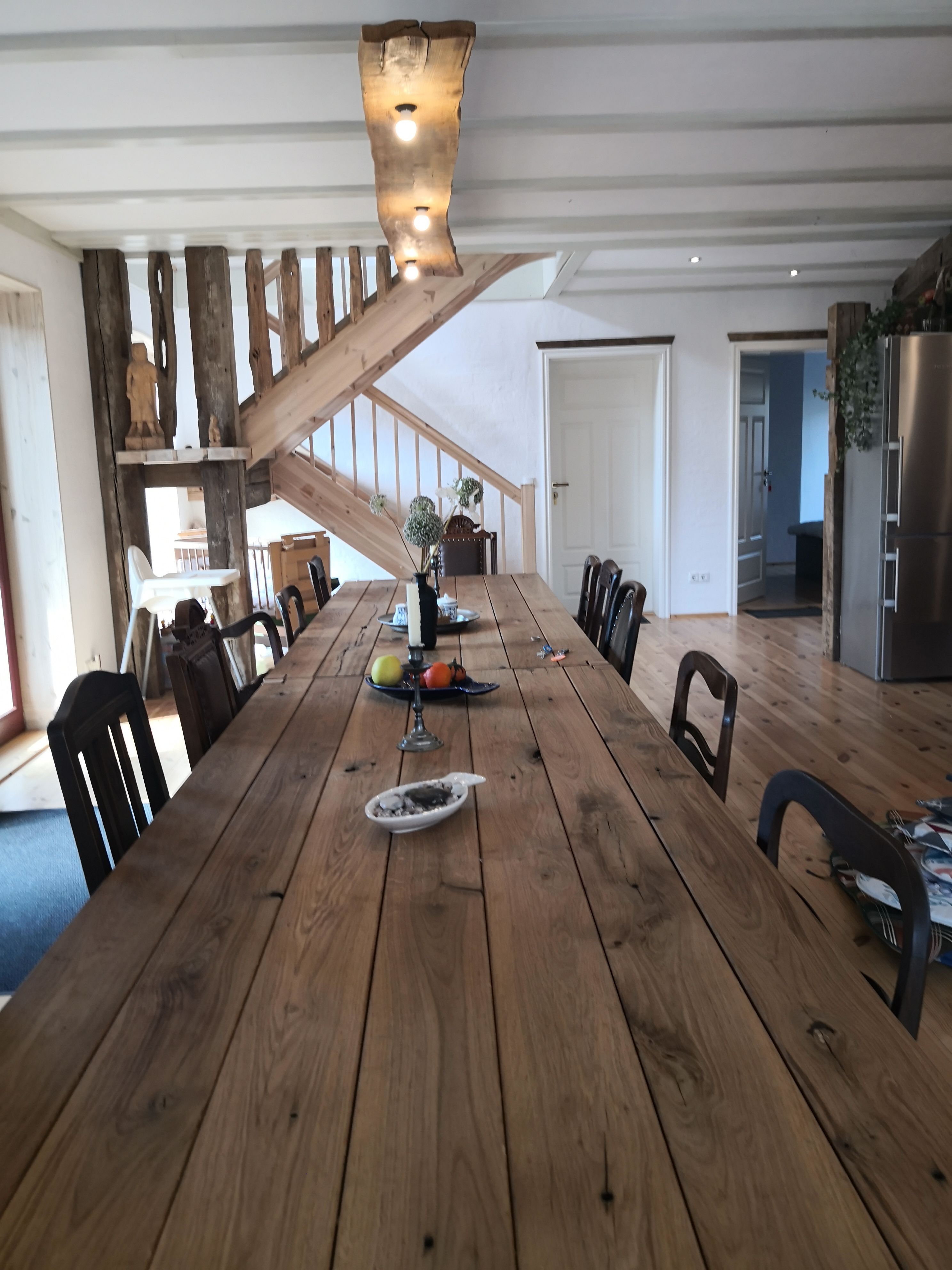 In der Wohnküche gibt es einen großen , massiven Esstisch für 12 Personen, der auch verlängert werden kann.