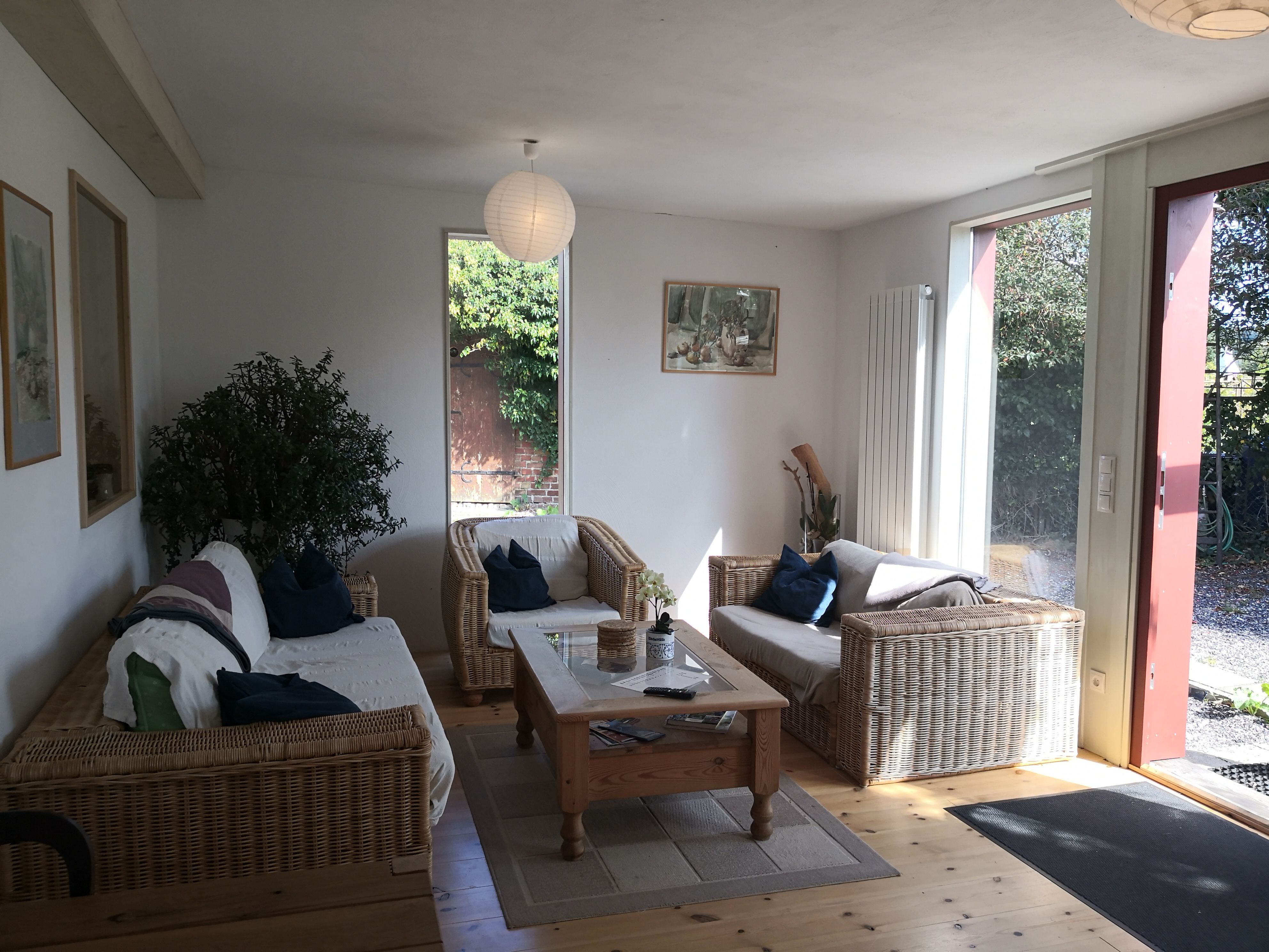 Im Gemeinschaftsraum befinden sich ein gemütliches Sofa, ein Fernseher mit Satellitenanschluss sowie Zugang zum Obstgarten.