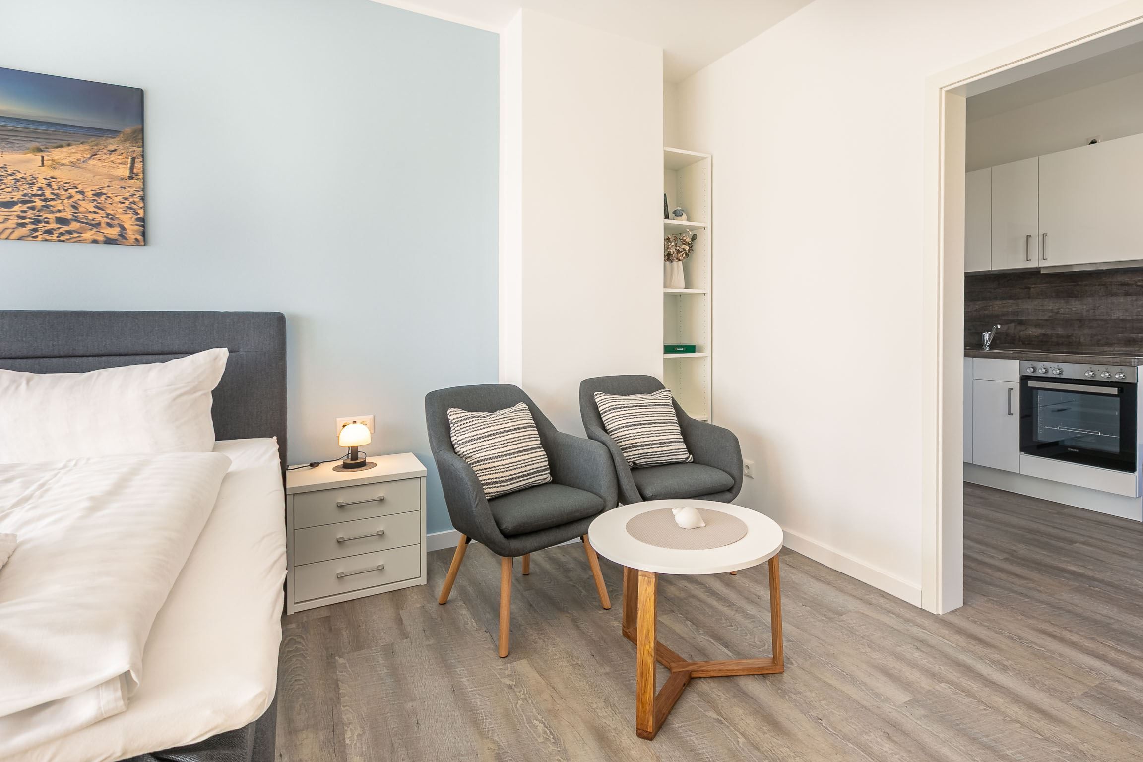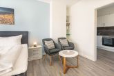Wohn-/Schlafzimmer mit Doppelbett (180x200cm, Boxspring), 2 Sesseln, Esstisch für 2 Personen, SMART-TV (Sat) und Radio. Direkter Zugang zum möblierten Wintergarten. Offene Küche mit Backofen, Mikrowelle, Geschirrspüler und Kühlschrank mit Gefrierfach.