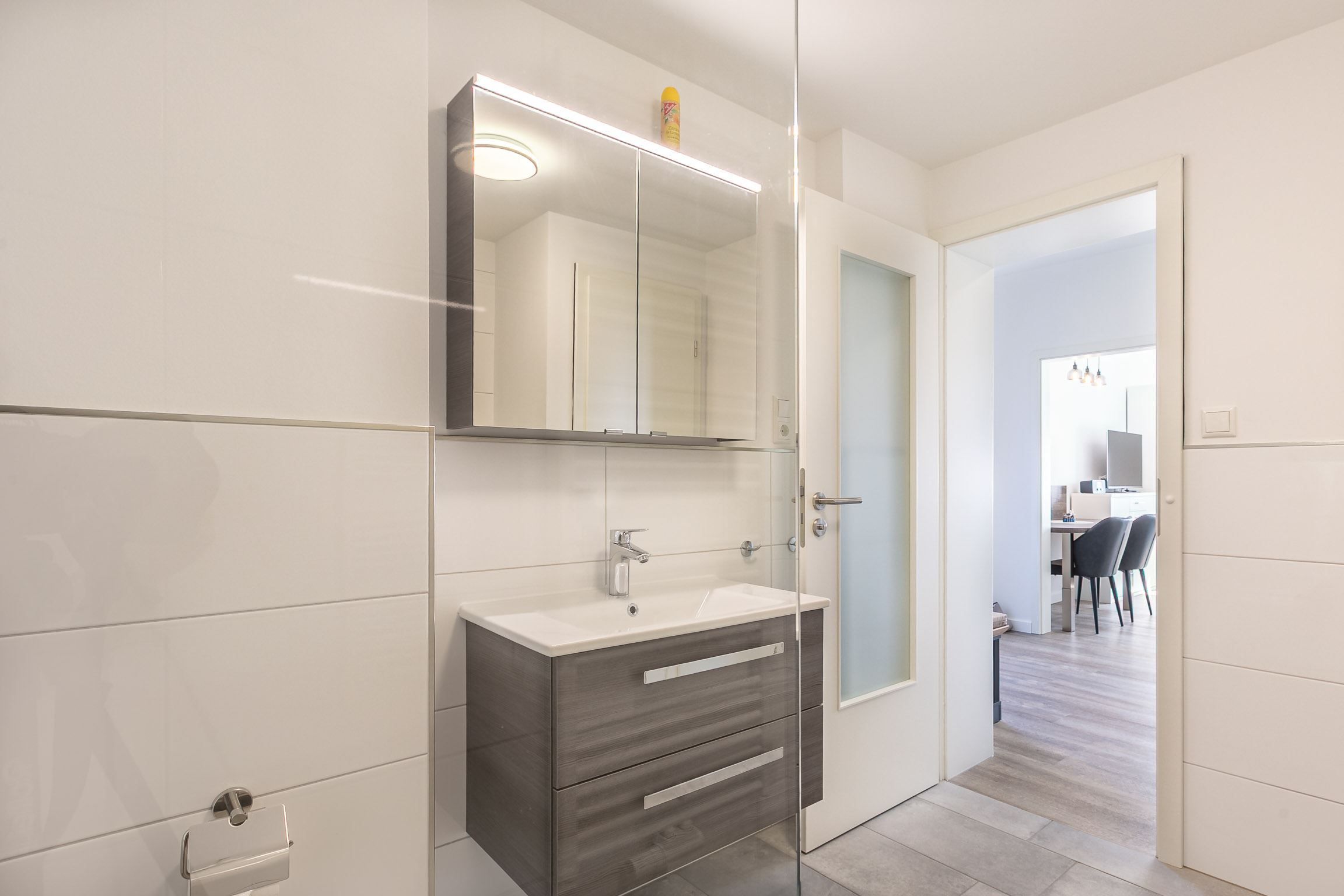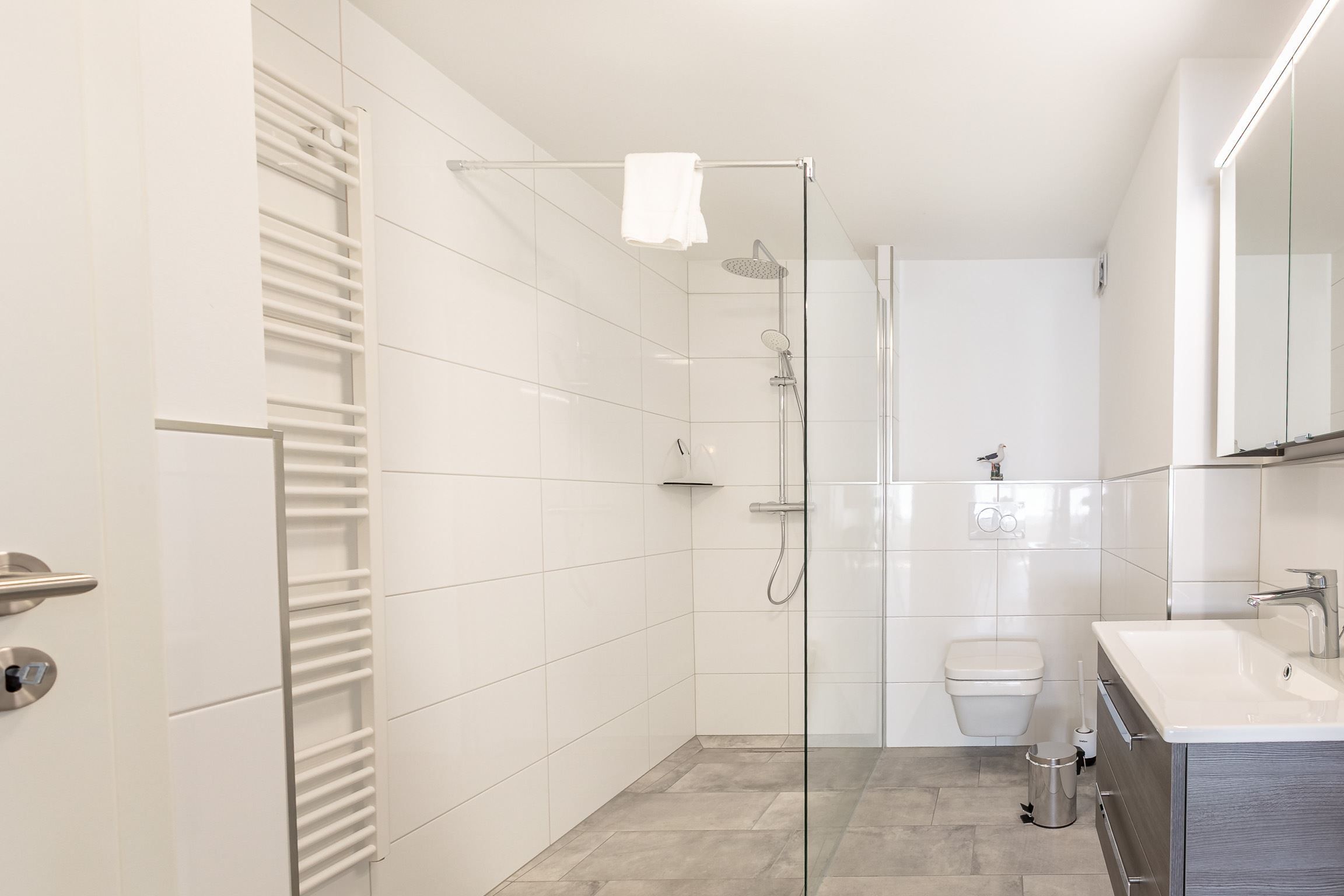 Badezimmer (Duschbad) mit bodengleicher Regen-Dusche, WC, Handtuchwärmer und Föhn.
