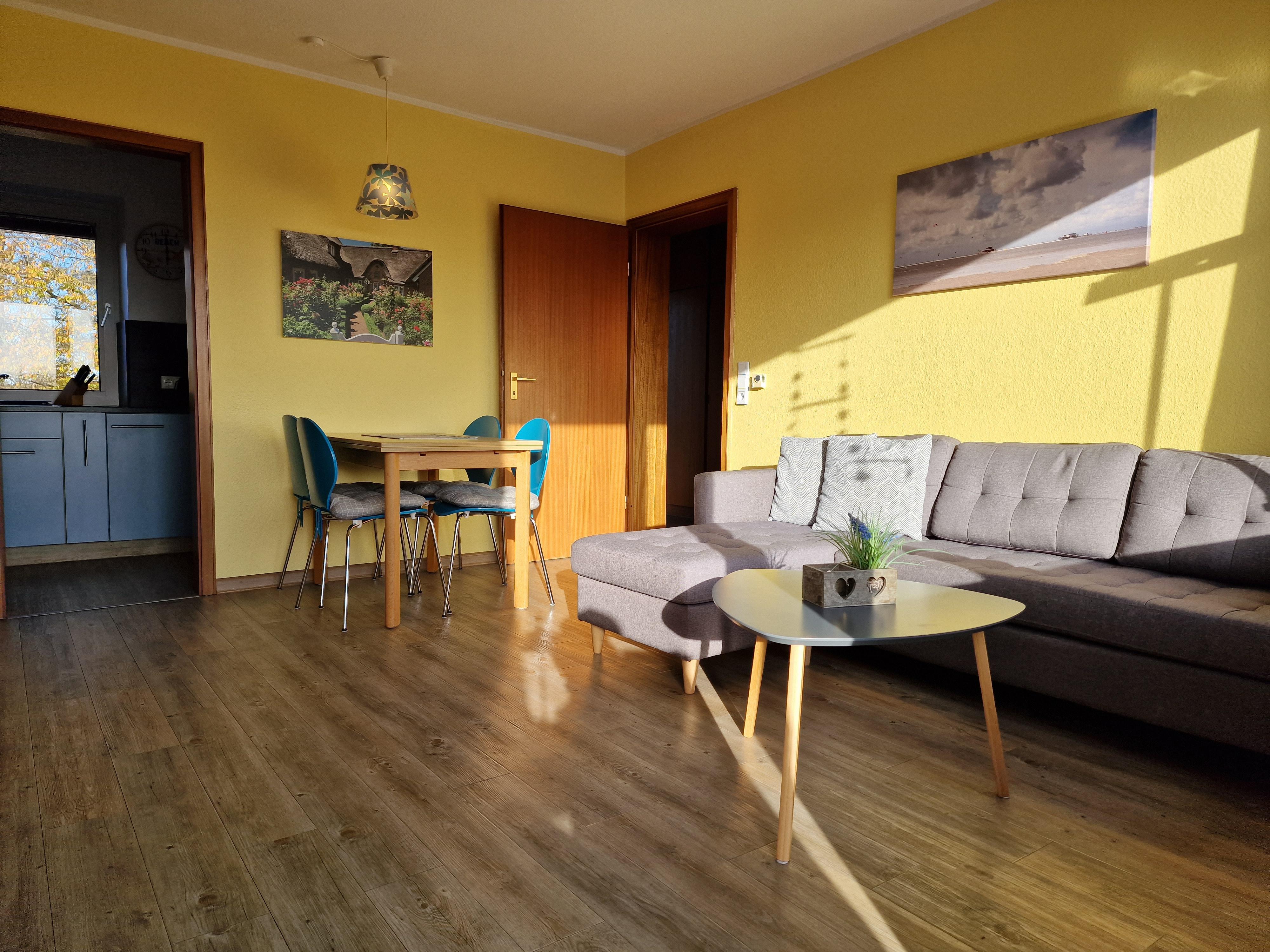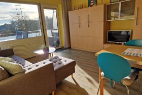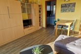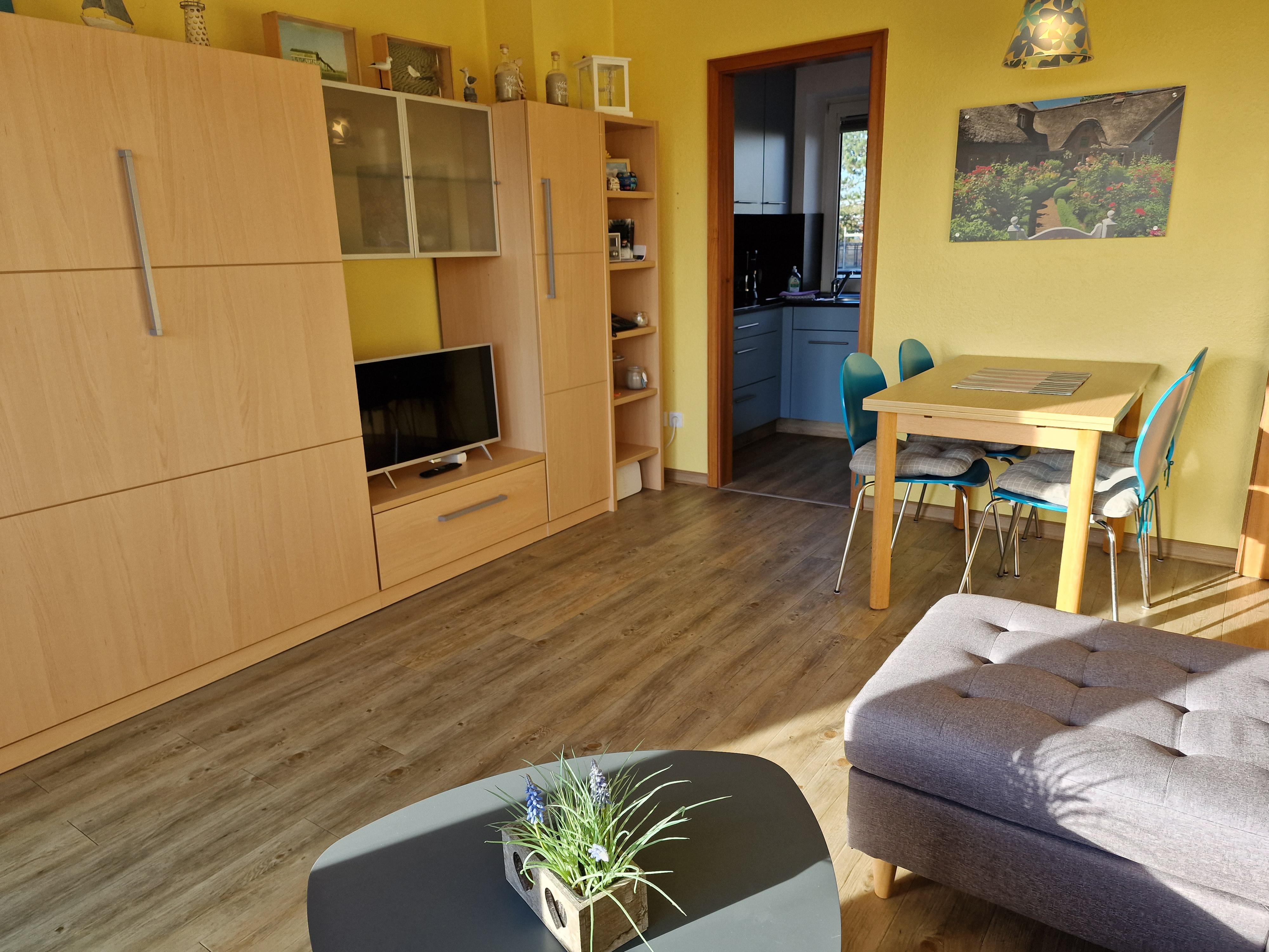 Wohnzimmer:Couch, Couchtisch, 2 Sessel, Beistelltisch, Stehlampe, Kleiderschrank, 2 Einzelschrankbetten, Tischlampe, TV-Tisch, Kabel-TV, Telefon, Kofferradio mit CD-Player, E-Heizung, Esstisch, 4 Stühle