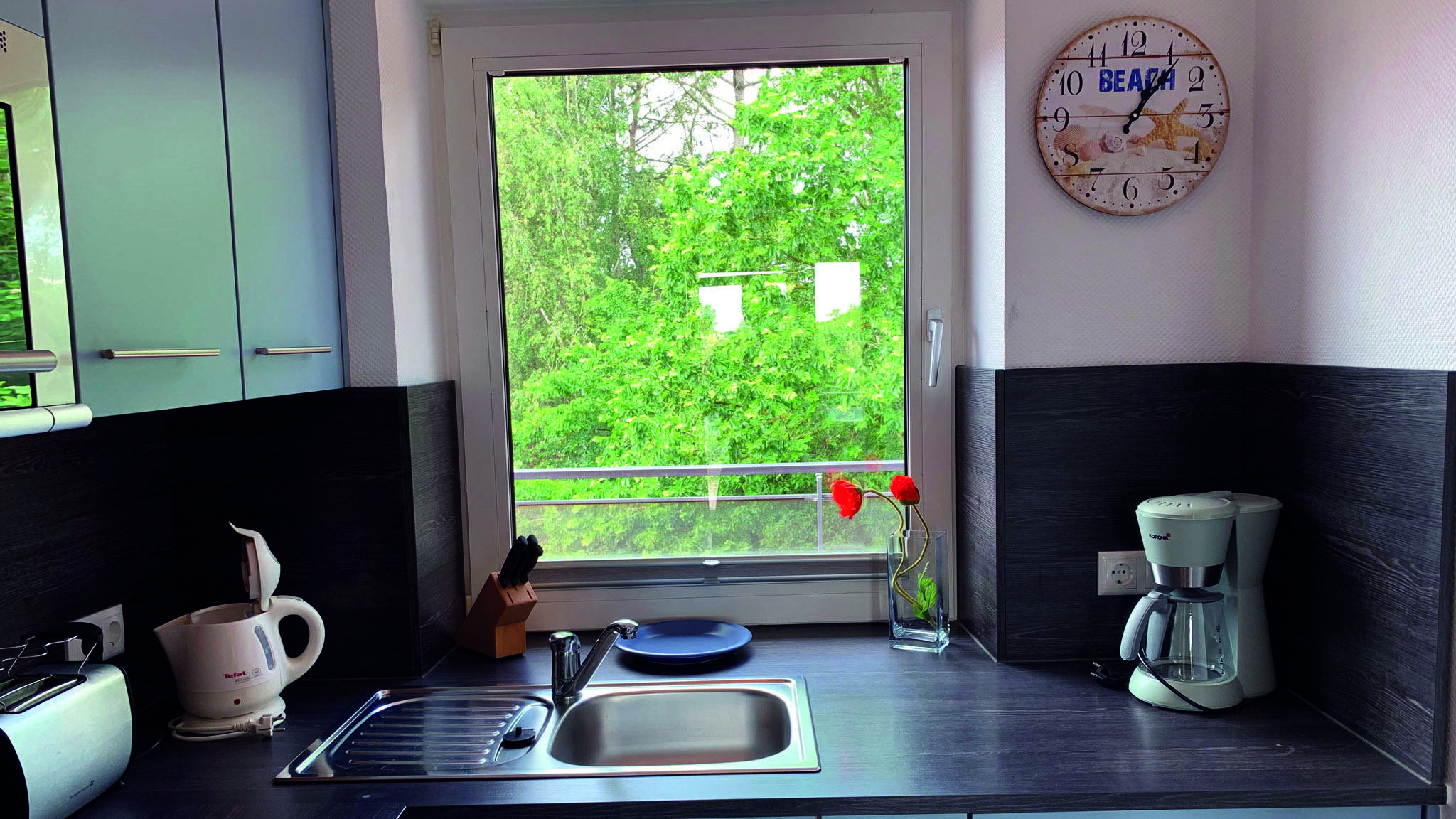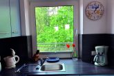 Küche:Einbauküche, 4 Plattenherd, Dunstabzugshaube, Kühlschrank, Kaffeemaschine, Wasserkocher, Toaster, Mixstab, Geschirr, Kochtöpfe