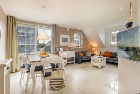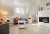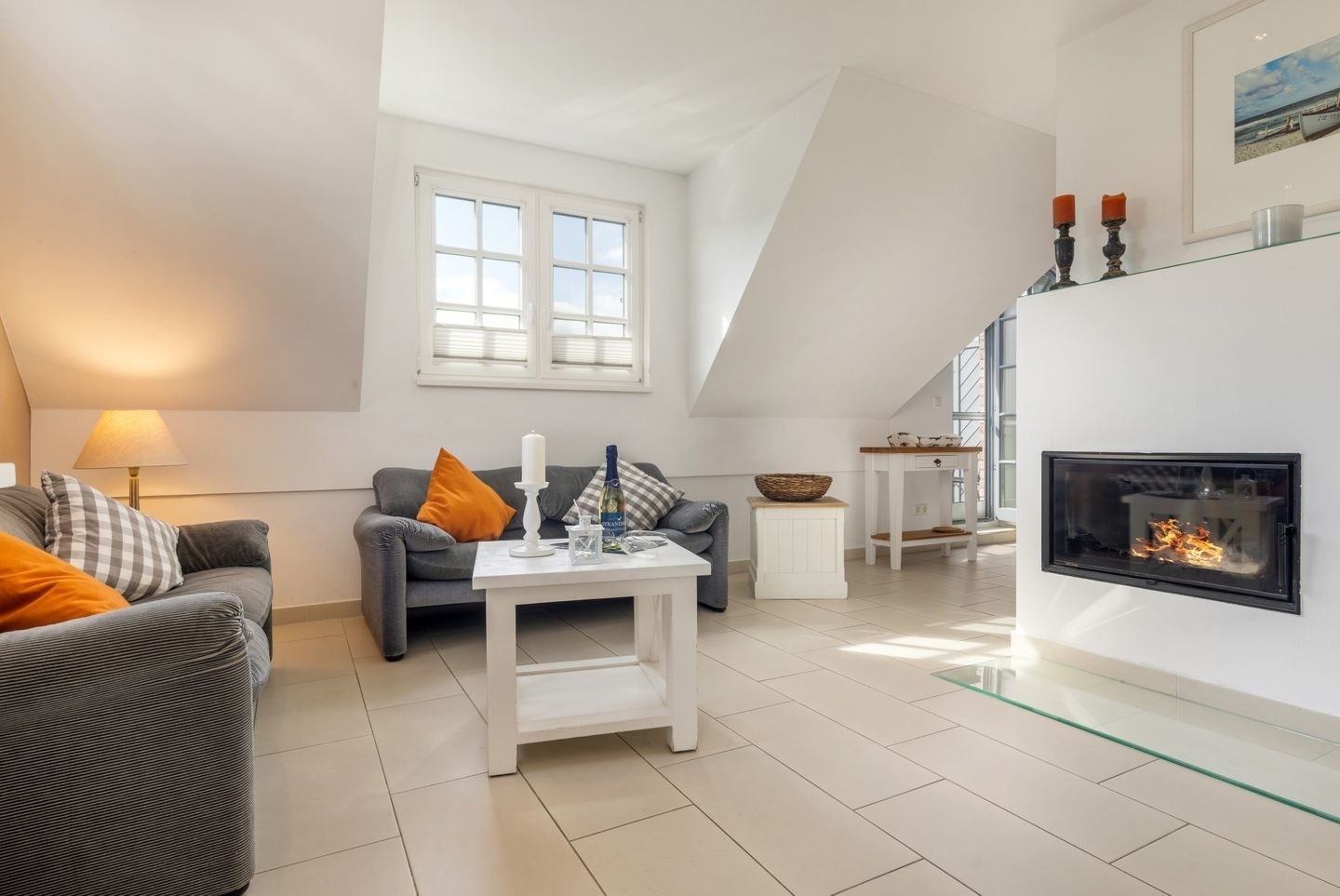 Die Maisonette-Wohnung bietet reichlich Platz für bis zu vier Personen und verfügt über eine moderne und hochwertige Ausstattung. Im großen und lichtdurchfluteten Wohnraum können Sie gemütliche Abende vor dem Kamin verbringen. Die geschmackvolle Einrichtung und die offene, moderne Küche lassen keine Wünsche offen. Vom Wohnbereich aus gelangen Sie auf zwei möblierte Balkone in Süd- und Westausrichtung, auf denen Sie die Sonnenstunden von Zingst in vollen Zügen genießen können. Angrenzend befindet sich ein Schlafzimmer mit einem komfortablen Doppelbett und einem Flatscreen-TV. Ein Duschbad steht Ihnen hier ebenfalls zur Verfügung.