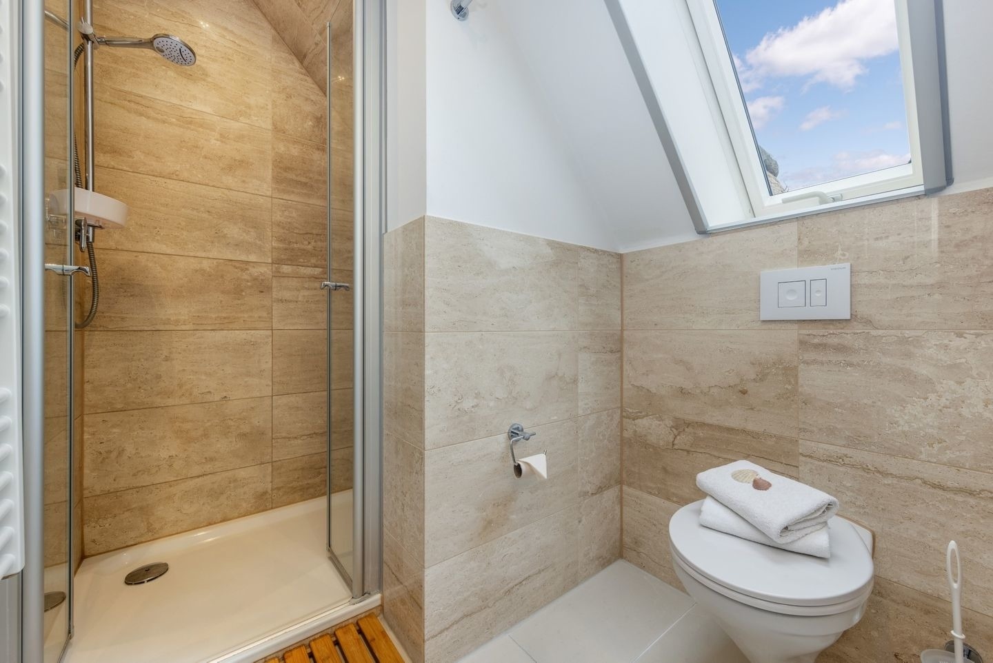 Im Obergeschoss erwartet Sie ein weiteres gemütliches Schlafzimmer mit Doppelbett und Flatscreen-TV sowie ein weiteres Badezimmer mit Dusche und WC.