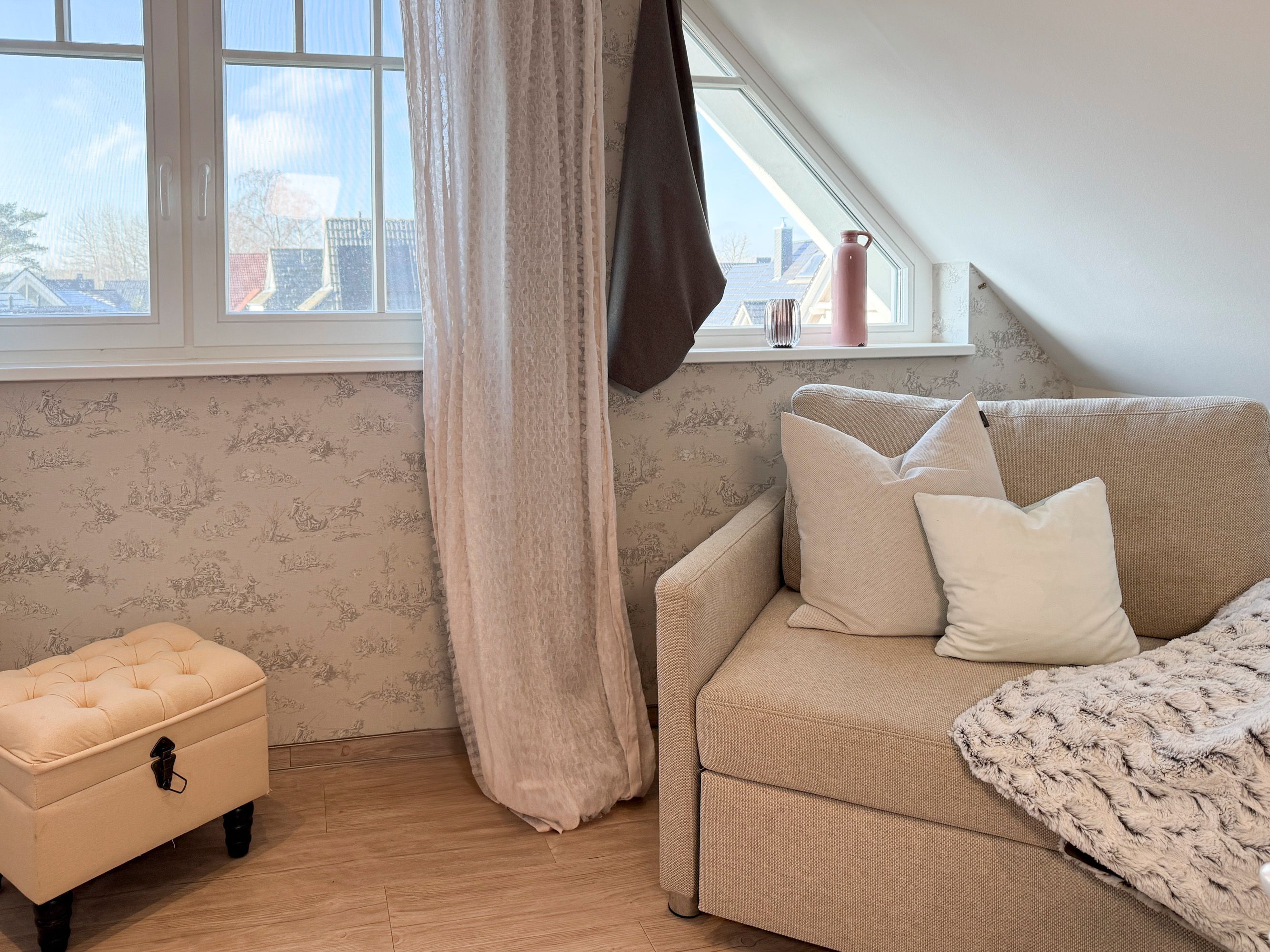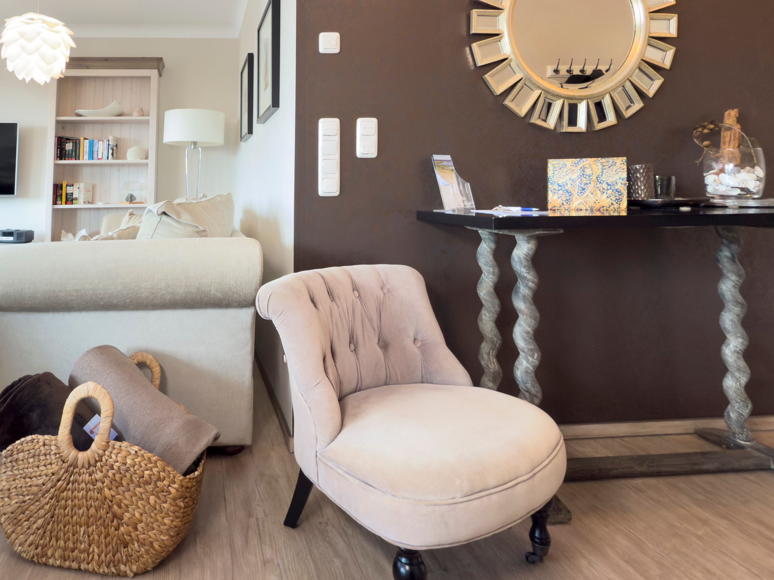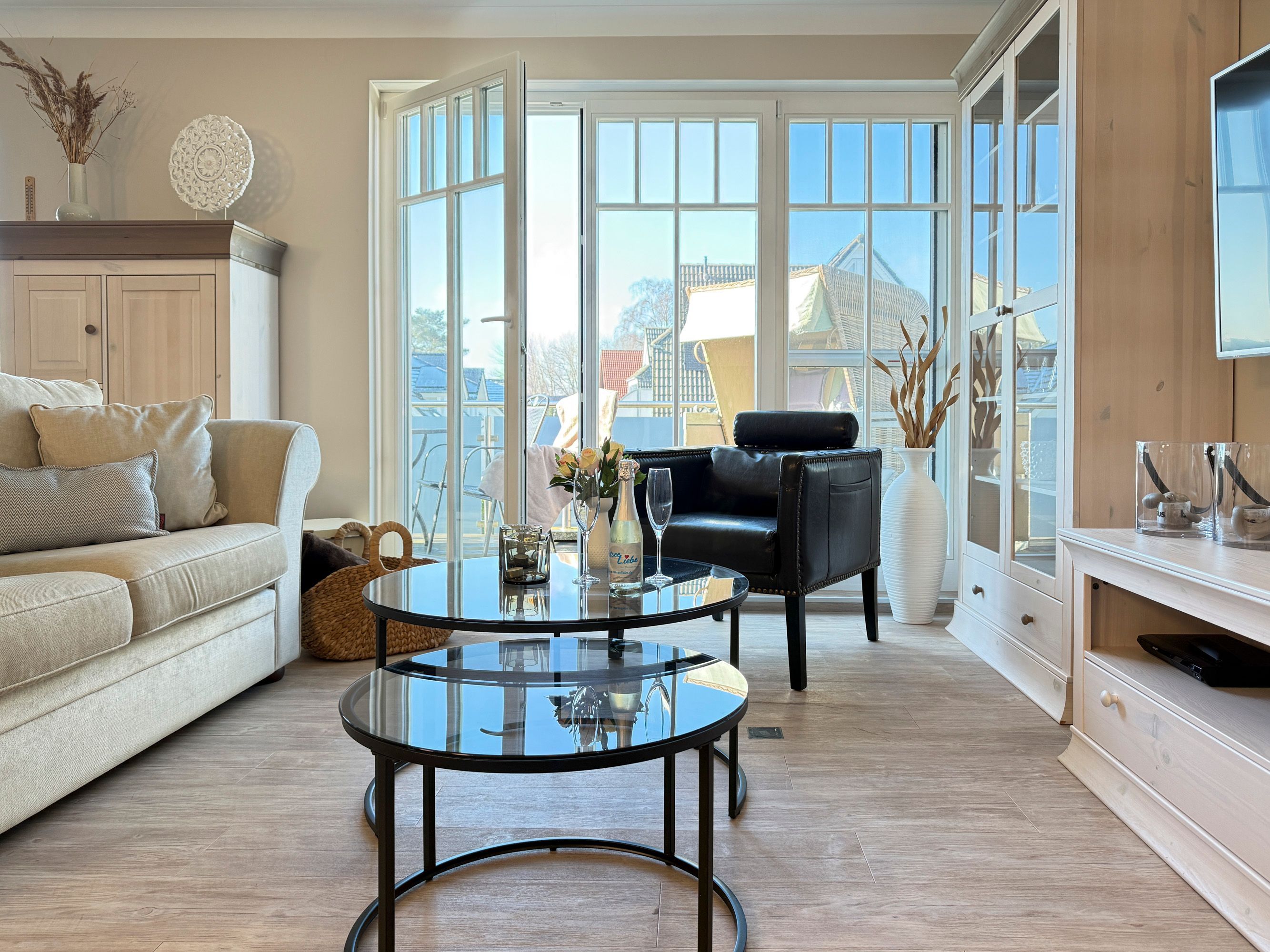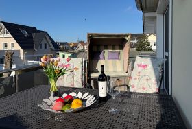 • Wohnbereich mit Balkon: Möbliert mit einem Strandkorb für maritimes Flair