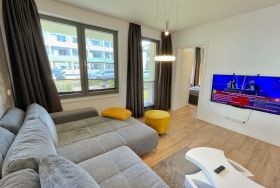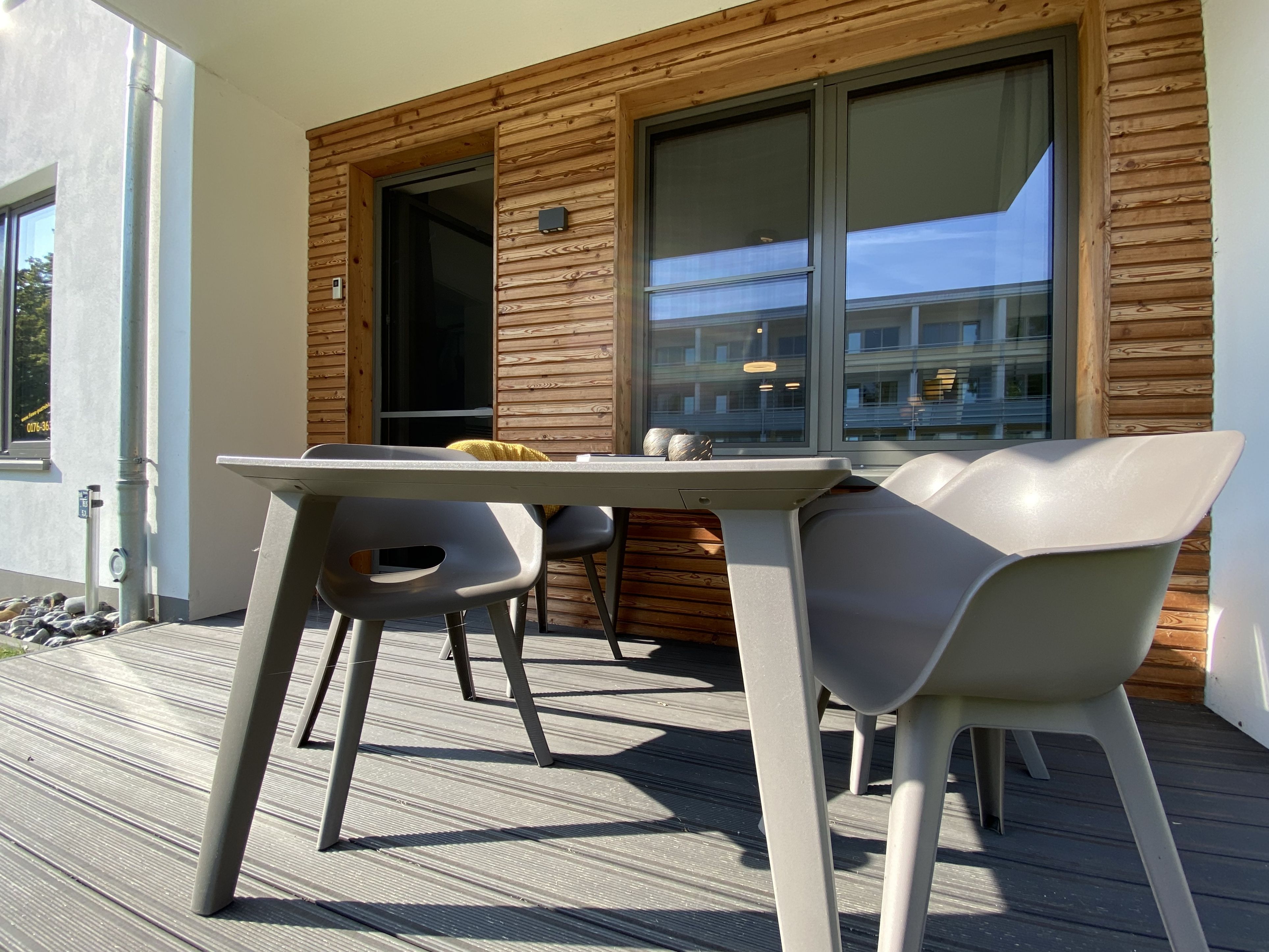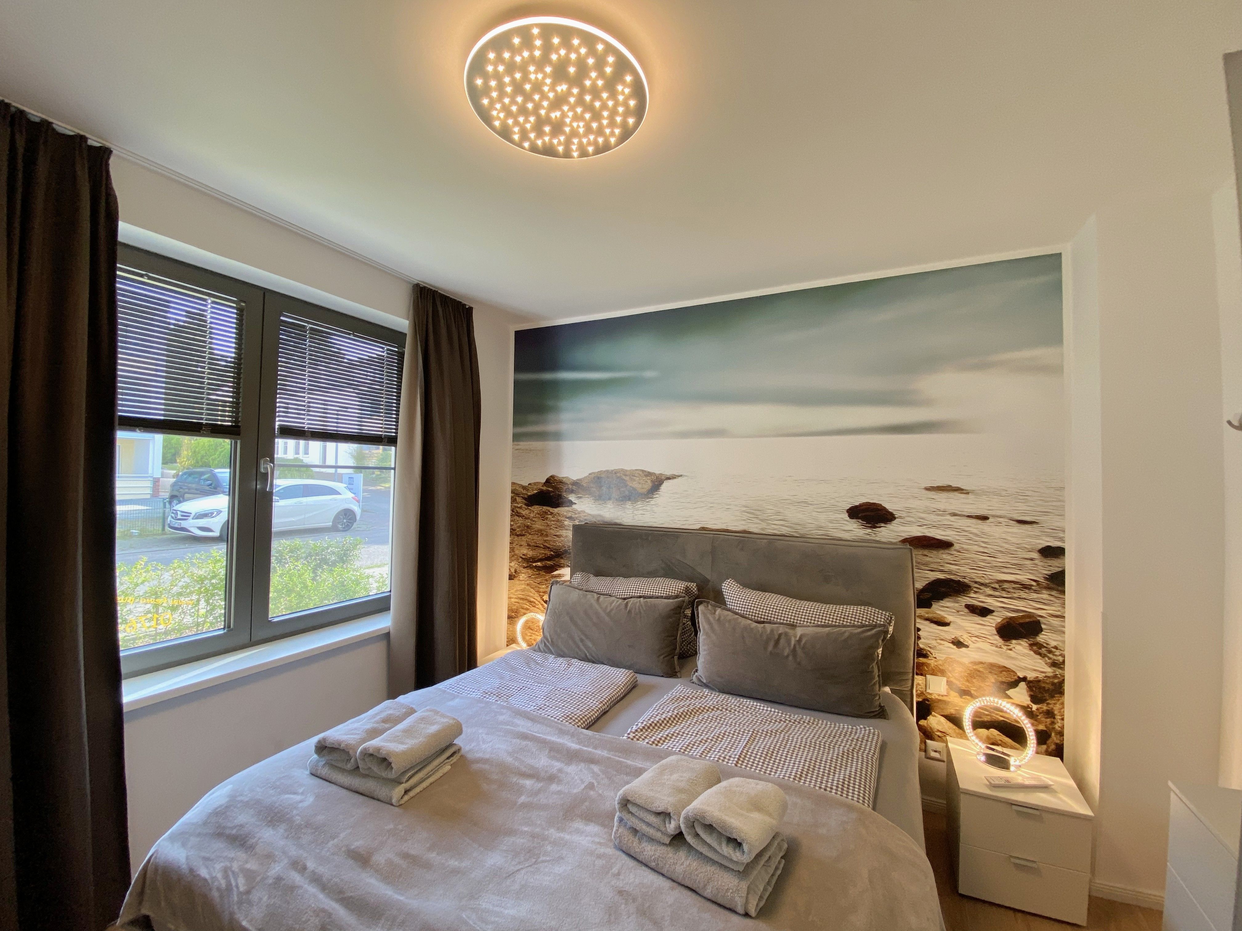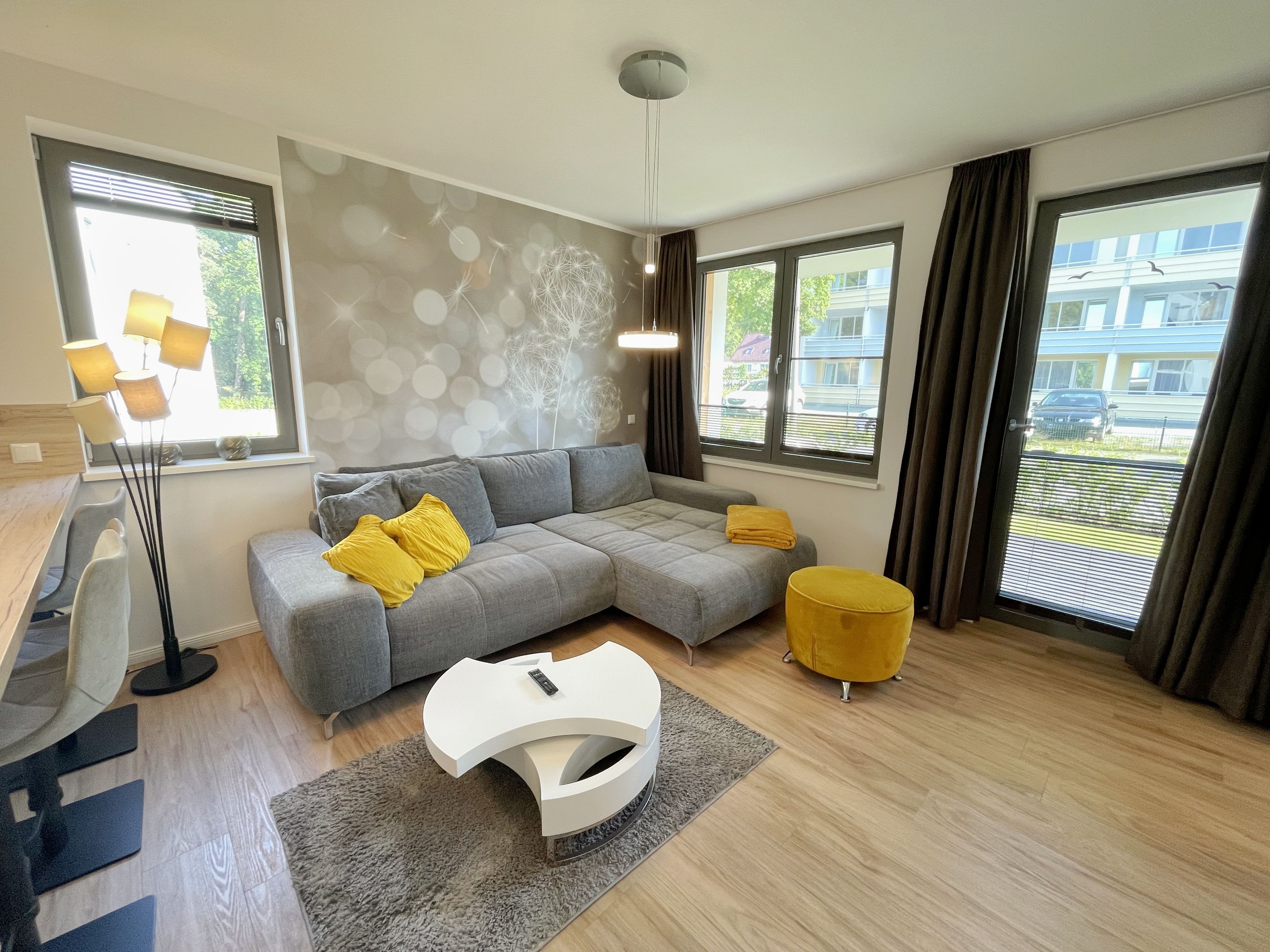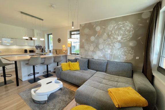 Unsere exklusiv eingerichtete Nicht-Raucher-Ferienwohnung (Nr. 12) Pusteblume befindet sich im Erdgeschoss der Villa Carlota. Sie bietet Ihnen mit Ihren ca. 52 qm Platz für max. 2 bis 4 Erwachsene. Mit viel Liebe ins Detail und geschmackvoll eingerichtet, bietet unsere Ferienwohnung in allen Jahreszeiten einen perfekten Wohlfühlcharakter. Im Sommer kühlt die Ost Lage, im Winter sorgt die Fußbodenheizung für warme Füße. Im Wohnbereich befindet sich eine große und bequeme Couch, die mit einfachen Handgriffen zu einer großzügigen Schlafcouch (1,45m x 2,25m) umgewandelt werden kann. Mit der weichen Bettauflage (Topper), die die Couch fast zu einem gleichwertigen Bett umwandelt, ist auch bequemes Übernachten für 2 Erwachsene möglich. Ein DAB-Radio, eine Musikanlage sowie ein Smart-TV runden den technischen Bereich ab. Von hier gelangen Sie auf Ihre bestuhlte Terrasse (Osten), wo Sie sich morgens vom Klang der Möwen wecken lassen können. Die angrenzende hochwertige Küchenzeile ist mit allem ausgestattet, was benötigt wird wie ein Geschirrspüler, ein Induktionskochfeld, ein Kühlschrank mit Gefrierfach, ein Backofen, eine Mikrowelle, ein Toaster, einen Wasserkocher, eine Kaffeemaschine SENSEO Duo (Pad-Maschine + Filter), ein Eierkocher, ein Mixer sowie viele kleine Küchenhelfer, die auch das Kuchen backen ermöglichen. Am Küchentresen finden bis zu 4 Personen Platz, wo Sie auch für notwendige Home-Office-Tätigkeiten genügend Steckdosen für Ihren Laptop, finden. Das große und gemütliche Boxspringbett ( 1,80m x 2,00m) in Komfort-Höhe im Schlafzimmer verschafft Ihnen entspannte Träume. Insektenschutzgitter sowie ein großer Kleiderschrank, Nachttischablagen mit Beleuchtung, ein Smart-TV und ein Sideboard runden den Raum ab. Das innenliegende Bad ist mit einer ebenerdigen Dusche, einem Waschtisch mit Spiegel, einen Handtuchheizkörper, einen Fön, ein Kosmetikspiegel, ein WC, einer Waschmaschine ausgestattet. Reinigungsutensilien sowie ein Wäschetrockner und Staubsauger stehen für Sie bereit. Für unsere kleinen Gäste ist ein Kinderreisebett (ohne Zusatzmatratze/ ohne Bett Inlett) inklusive. Ein kleiner, stubenreiner und gut erzogener 4-beiner ist gegen eine Gebühr ein gern gesehener Gast. Von Ihrem extrabreiten (4m) Tiefgaragen-Stellplatz (Nr.82, Einfahrtshöhe 2,15m) gelangen Sie durch den Fahrstuhl bequem zu Ihrer Wohnung. Ihre Fahrräder können Sie im zur Wohnung gehörenden Keller (Nr.12) sicher abstellen. Die Erstausstattung eines Wäschepaketes (komplette Bettwäsche, 1 Duschhandtuch, 2 kleine Handtücher) können Sie bis 14 Tage vor Anreise gegen einen Aufpreis dazu buchen oder durch eigene ergänzen. Ab 2 gebuchten Paketen erhalten Sie einmalig 1 Geschirrhandtuch und 1 Duschvorleger hinzu.