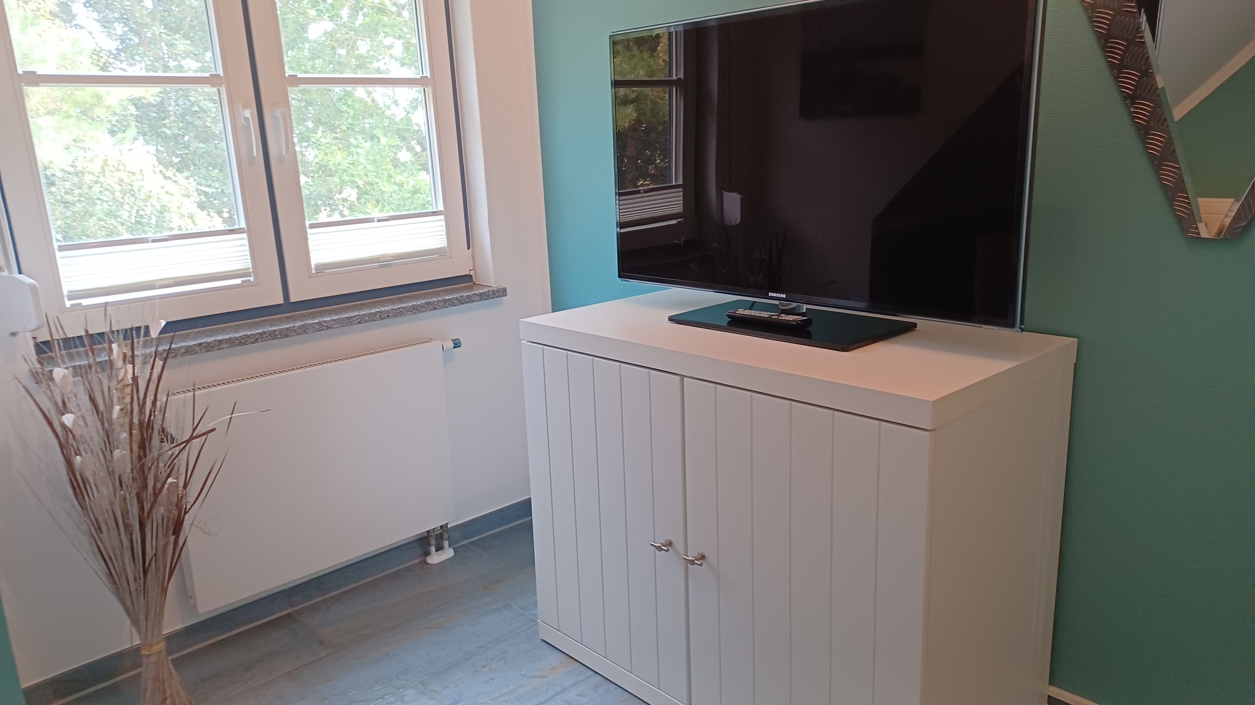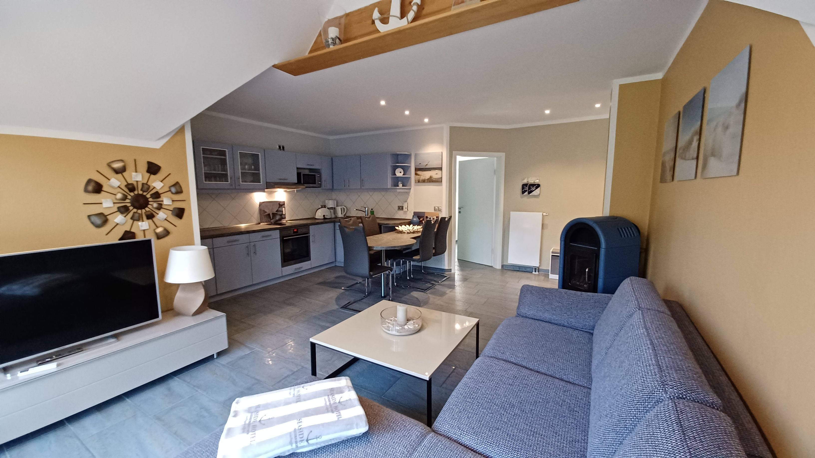 Die Wohnung wurde mit viel Liebe zum Detail von den Vermietern eingerichtet. Das Wohnzimmer verfügt über eine gemütliche Couch , SAT- TV und einen Kamin. Im Schlafzimmer befindet sich ein Doppelbett 1,80 x 2,00 cm (mit getrennten Matratzen) und viel Stauraum. Im 2. Schlafzimmer befindet sich ein Bett 0,90 x 2,00 m (ausziehbar). Auch bei der Küchenausstattung wurde auf jedes Detail geachtet, damit die Gäste sich rundum Wohlfühlen können. Zur Ausstattung gehören alle notwendigen Küchenutensilien und laden mit dem Essplatz zum gemeinsamen kochen ein. Die Küchenzeile wurde mit Kaffeemaschine, Wasserkocher, Kühlschrank mit Gefrierfach, Mikrowelle, Geschirrspüler und Herd mit Cerankochfeld sowie einem Backofen ausgestattet. Das moderne Badezimmer wurde mit einer ebenerdigen Dusche und Fön ausgestattet. Alle Räume der Ferienwohnung sind mit Fliegengasen und einer Aussenjalousie ausgestattet. Die Wohnung ist eine Nichtraucherwohnung. Für unsere Gäste steht ein kostenloses WLAN bereit. Die Bettwäsche und Handtücher können bei der Zimmervermittlung dazu gebucht werden - ein Paket 19,50 € (1 Badetuch, 1 Handtuch, 1 Kopfkissen, 1 Bezug und 1 Spannbettlaken).