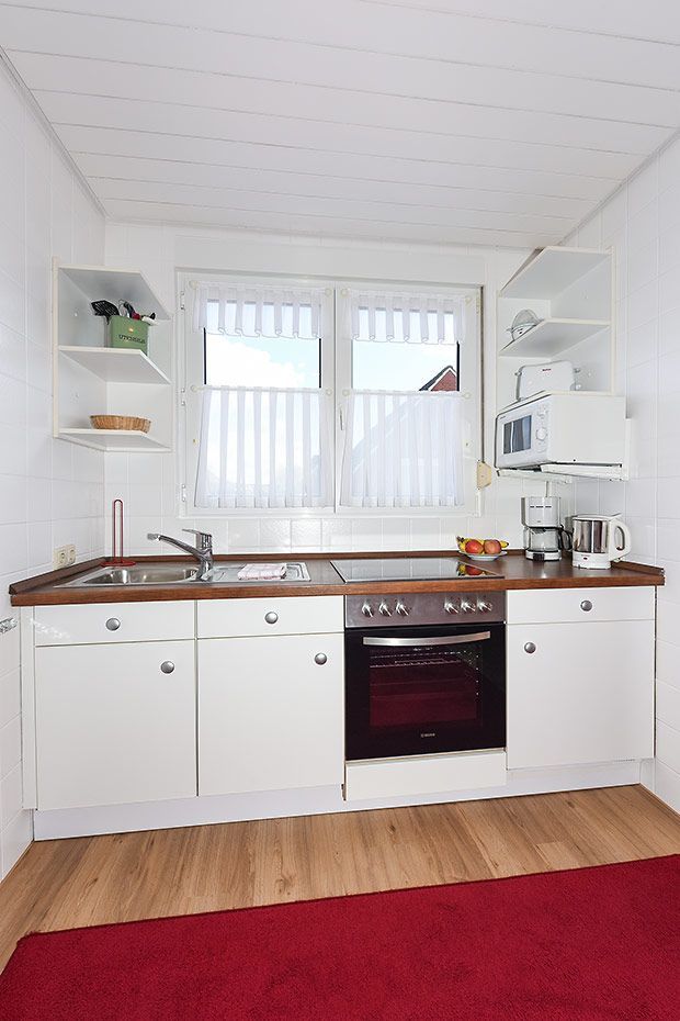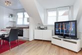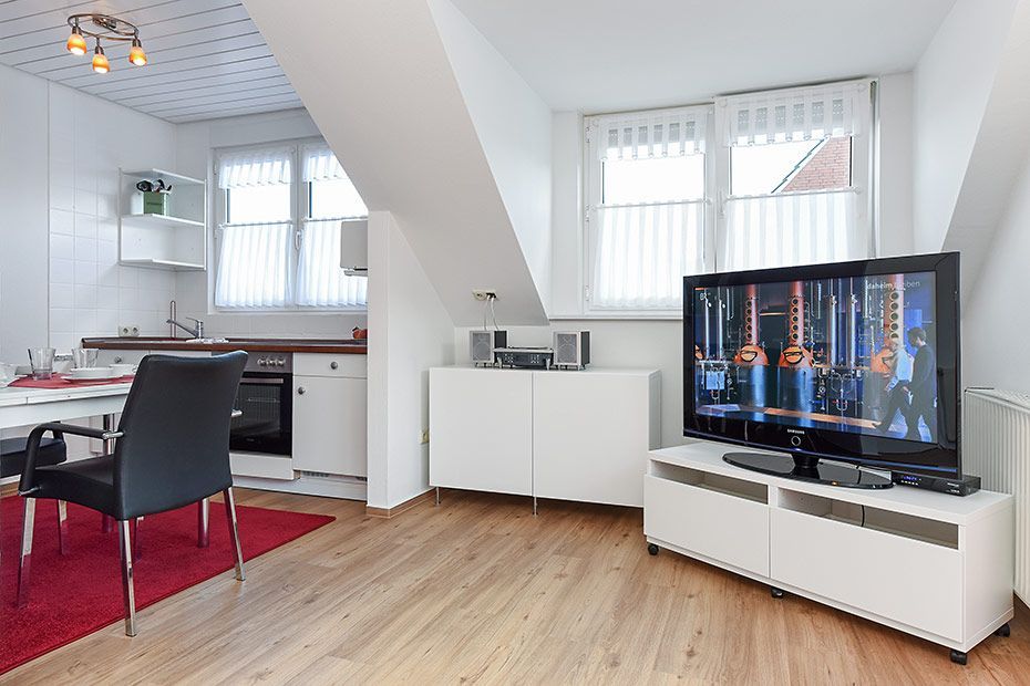 Größe ca. 50 Quadratmeter, Wohnraum mit integrierter Küche, Schlafzimmer, Badezimmer mit Dusche, Waschtisch und WC, Obergeschoss, Balkon, optimal für 1 bis 2 Personen.