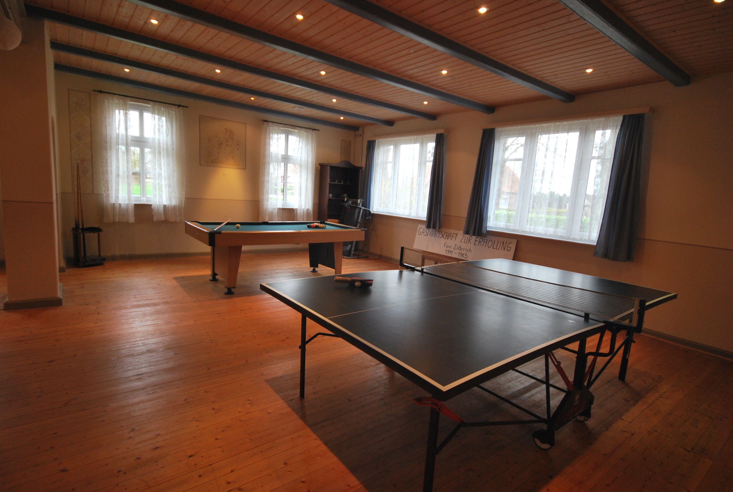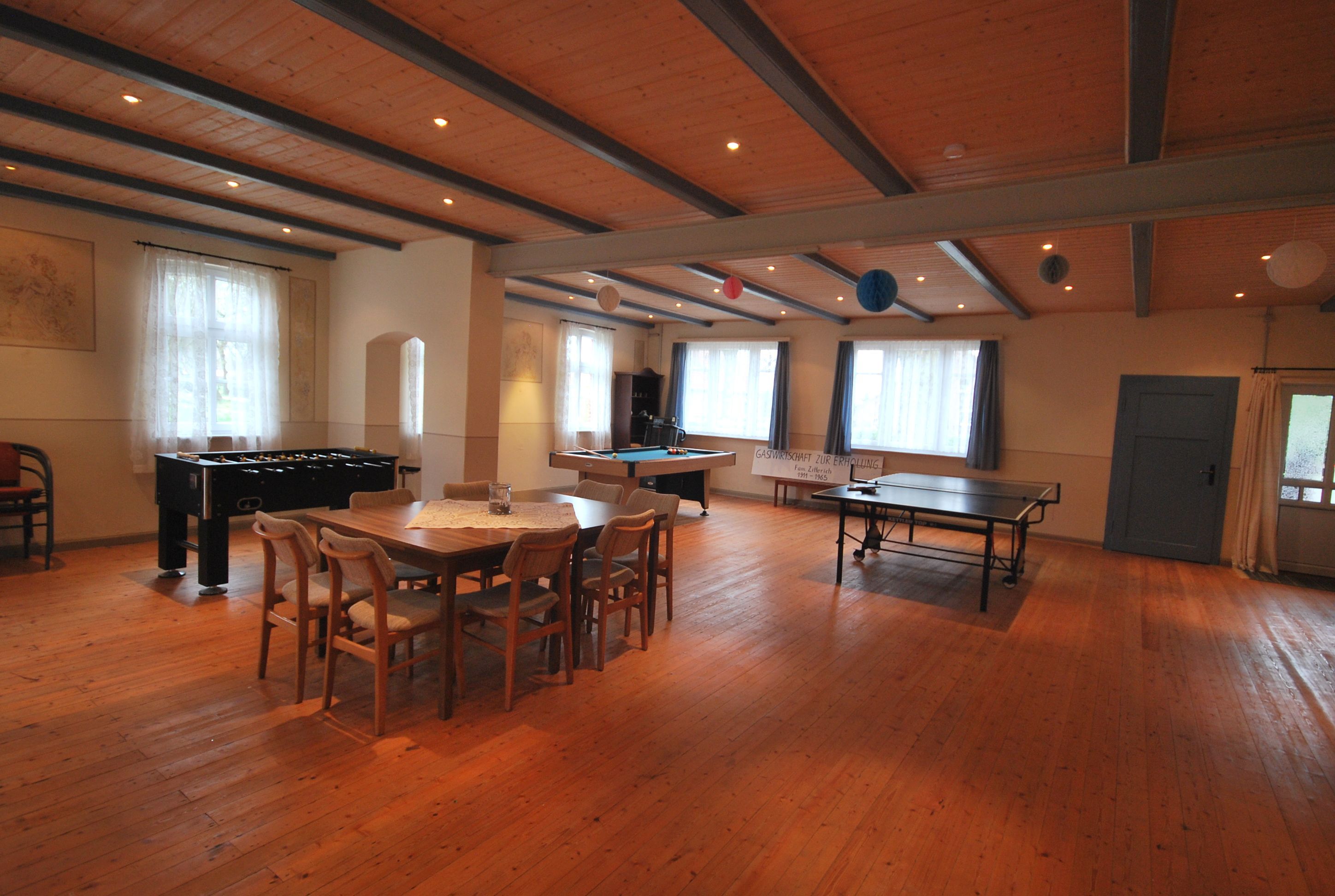 Zum Ferienhaus gehört auch ein ehemaliger Saal, der fast 100 m² umfasst, denn im Jahre 1902 wurde das Haus erbaut und als Bauernhof und Gaststätte geführt. Heute haben Sie ebenfalls die Möglichkeit, hier gemütliche Abende zu verbringen mit Gesellschaftsspielen, Billard oder einem Tischfußballkicker.