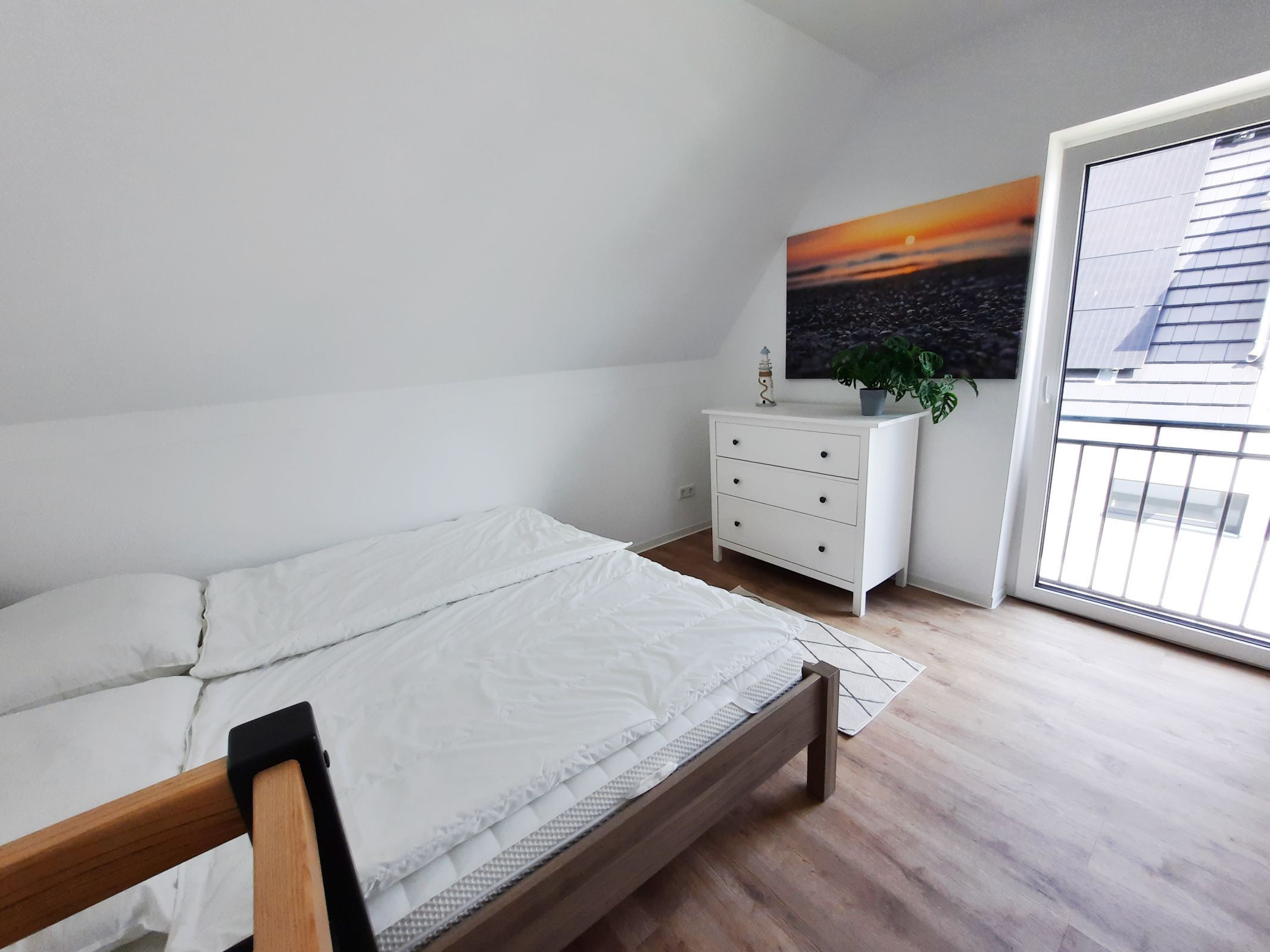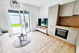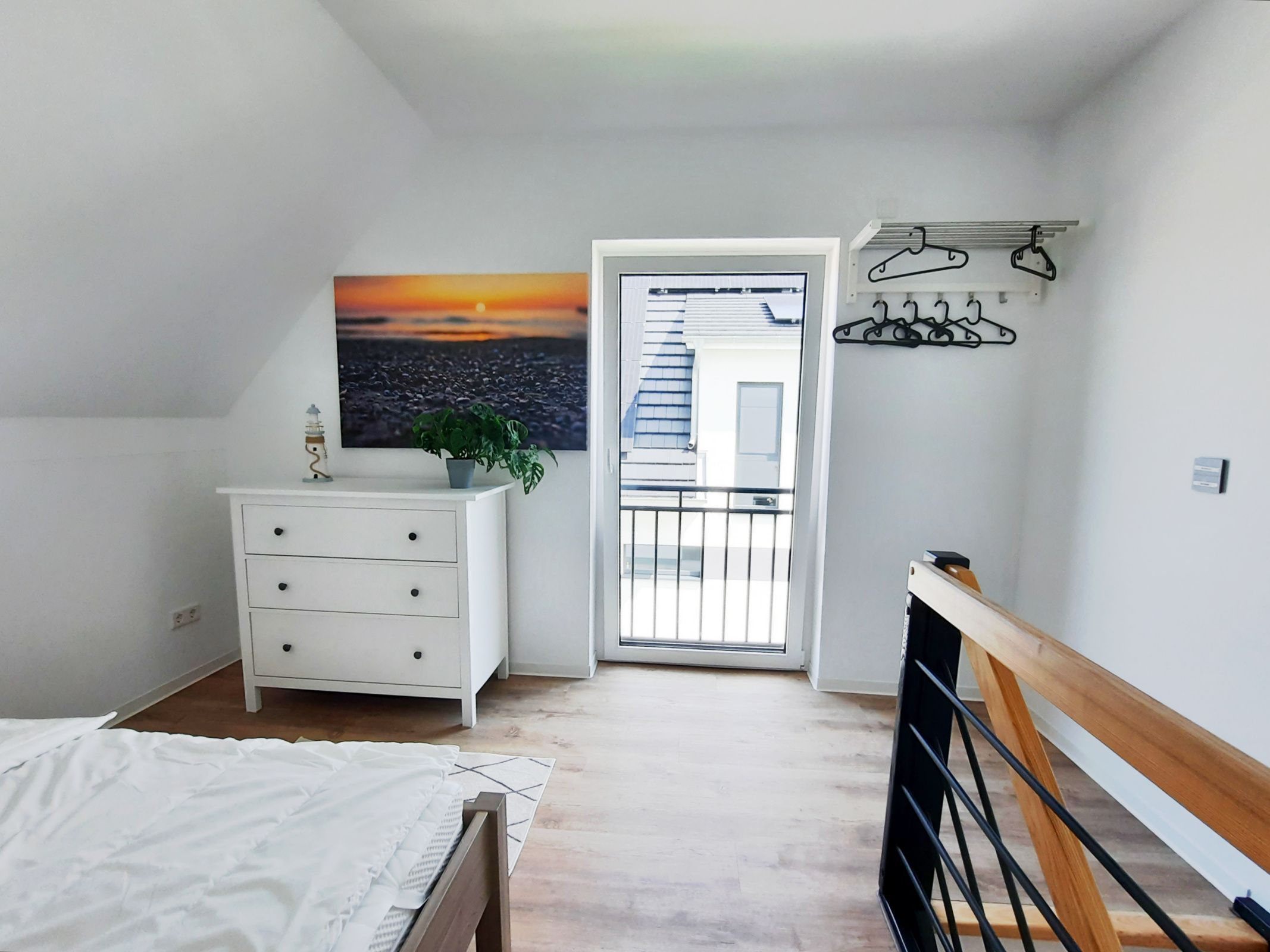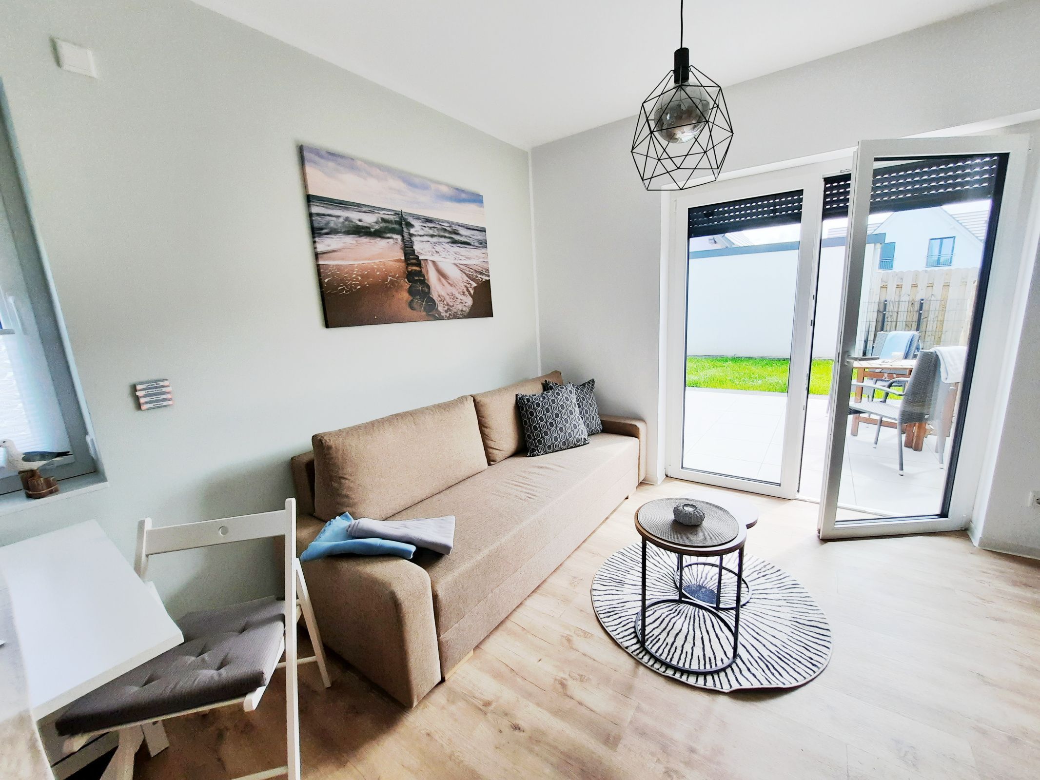 In dieser modernen, neu gebauten Ferienwohnung fühlen Sie sich der Ostsee ganz nah. Nur 600 Meter vom Strand heißt Sie die Unterkunft auf 2 Etagen willkommen. Im Wohnzimmer befindet sich eine ausklappbare Couch, ein Flachbild-TV und ein Ess-Tisch mit 2-3 Stühlen. Die offene Küche ist mit einem Geschirrspüler, einem Kühlschrank mit Gefrierfach, einer Kaffeemaschine und einem Wasserkocher ausgestattet. Das Bad mit Fenster verfügt über eine ebenerdige Dusche und ein WC. Über eine Treppe gelangen Sie zum offenen Schlafzimmer. Darin befinden sich eine Kommode und ein Doppelbett mit einer breiten Matratze (180x200 cm). Die sonnige Terrasse ist mit Gartenmöbeln ausgestattet. Ihre mitgebrachten Fahrräder können Sie im Fahrradständer abstellen. Zur Ferienwohnung gehört außerdem ein PKW-Stellplatz. Die Unterkunft ist mit Außenjalousien zum Abdunkeln und im Erdgeschoss mit einer Fußbodenheizung ausgestattet.