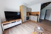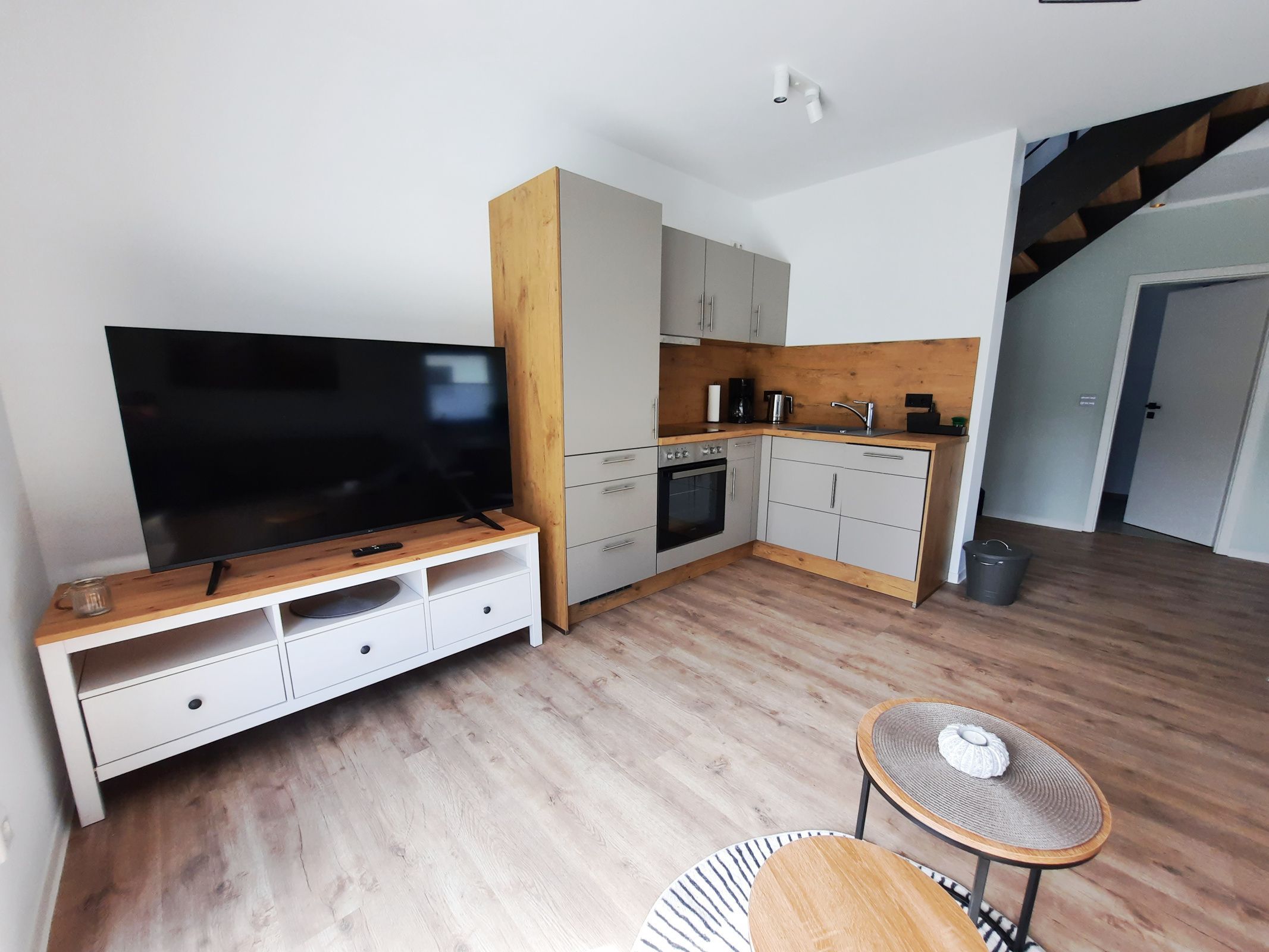 Im Wohnzimmer befindet sich eine ausklappbare Couch, ein Flachbild-TV und ein Ess-Tisch mit 2-3 Stühlen.