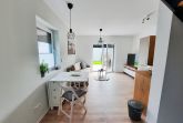 Die offene Küche ist mit einem Geschirrspüler, einem Kühlschrank mit Gefrierfach, einer Kaffeemaschine und einem Wasserkocher ausgestattet.