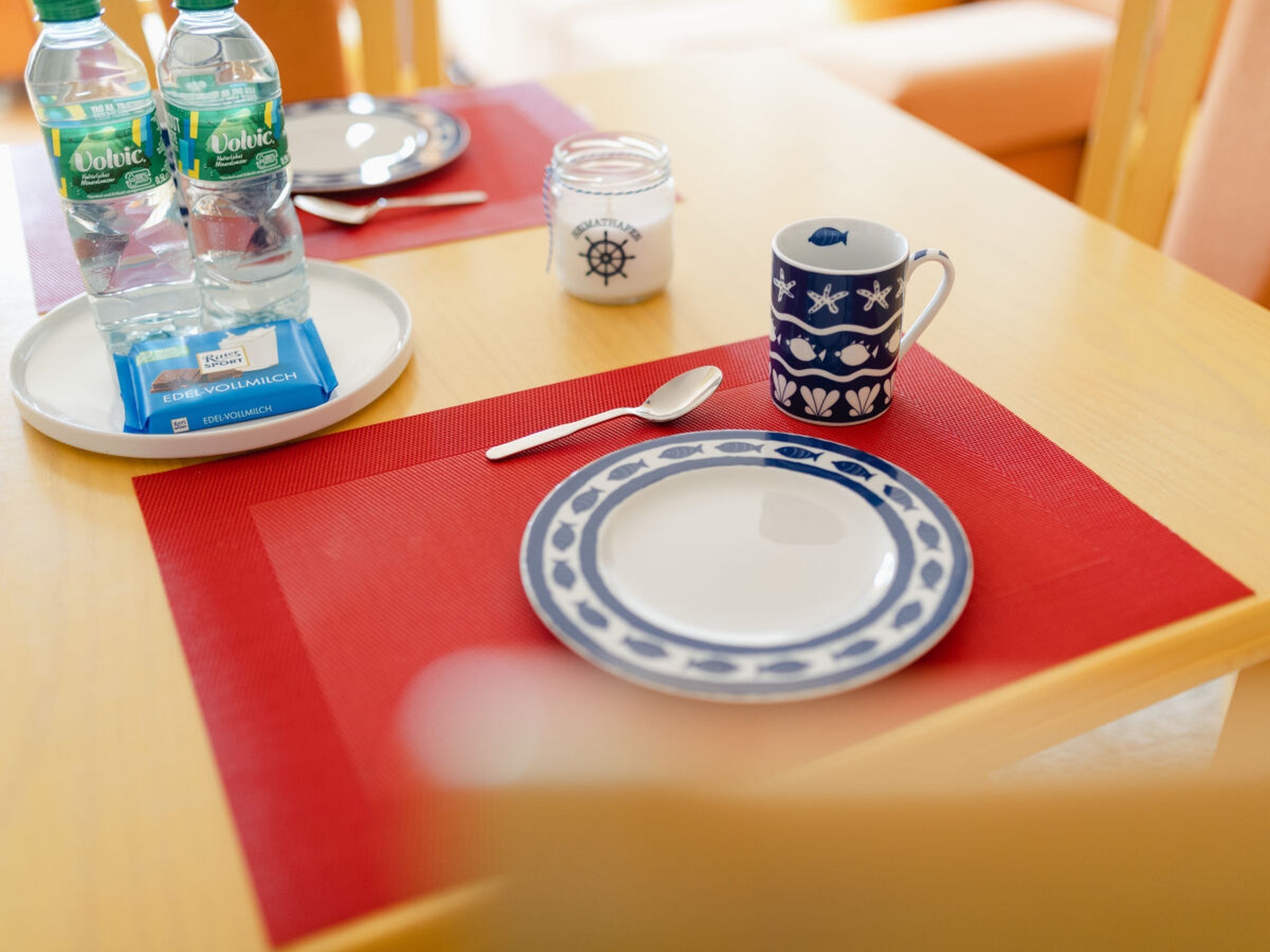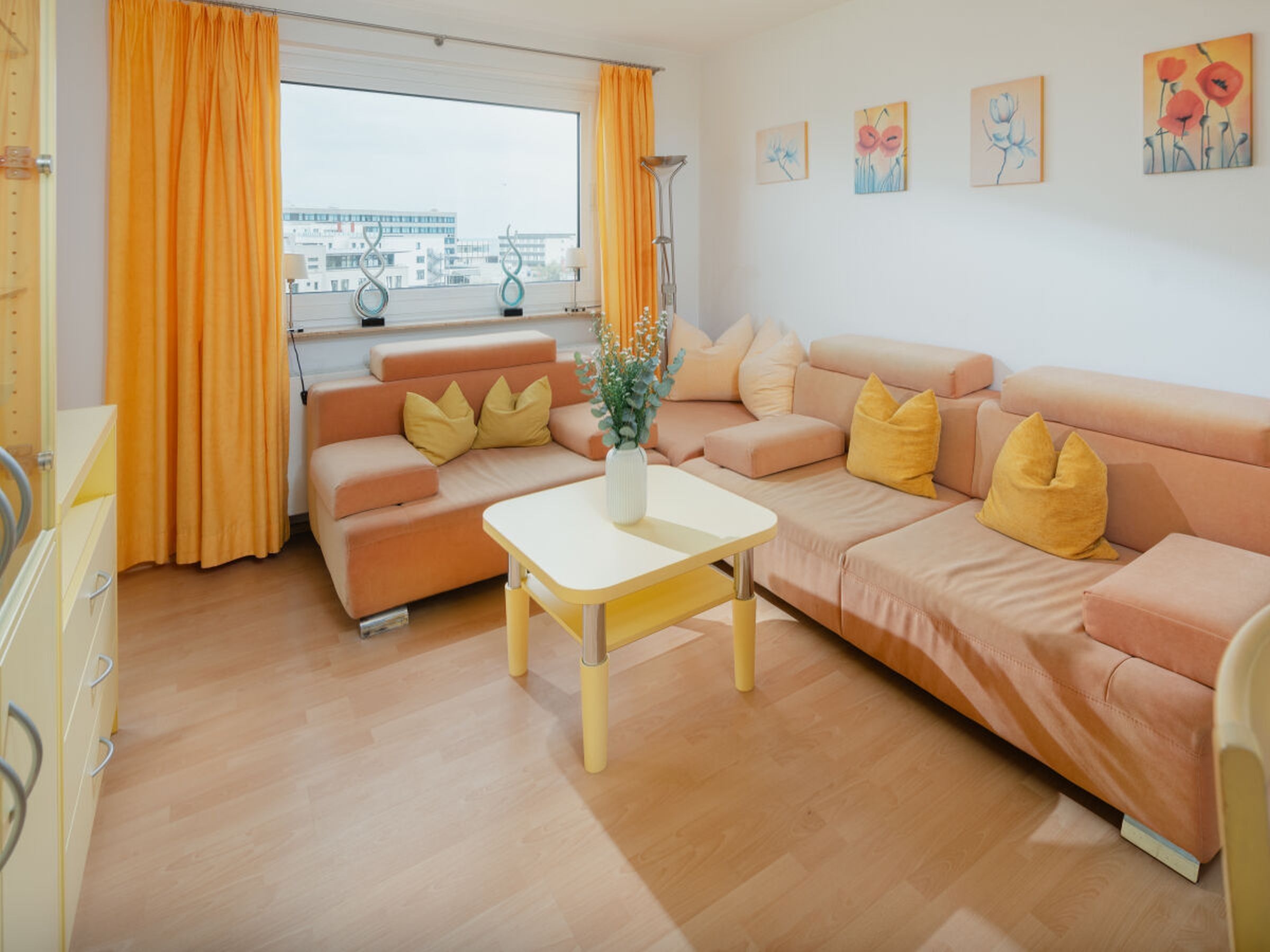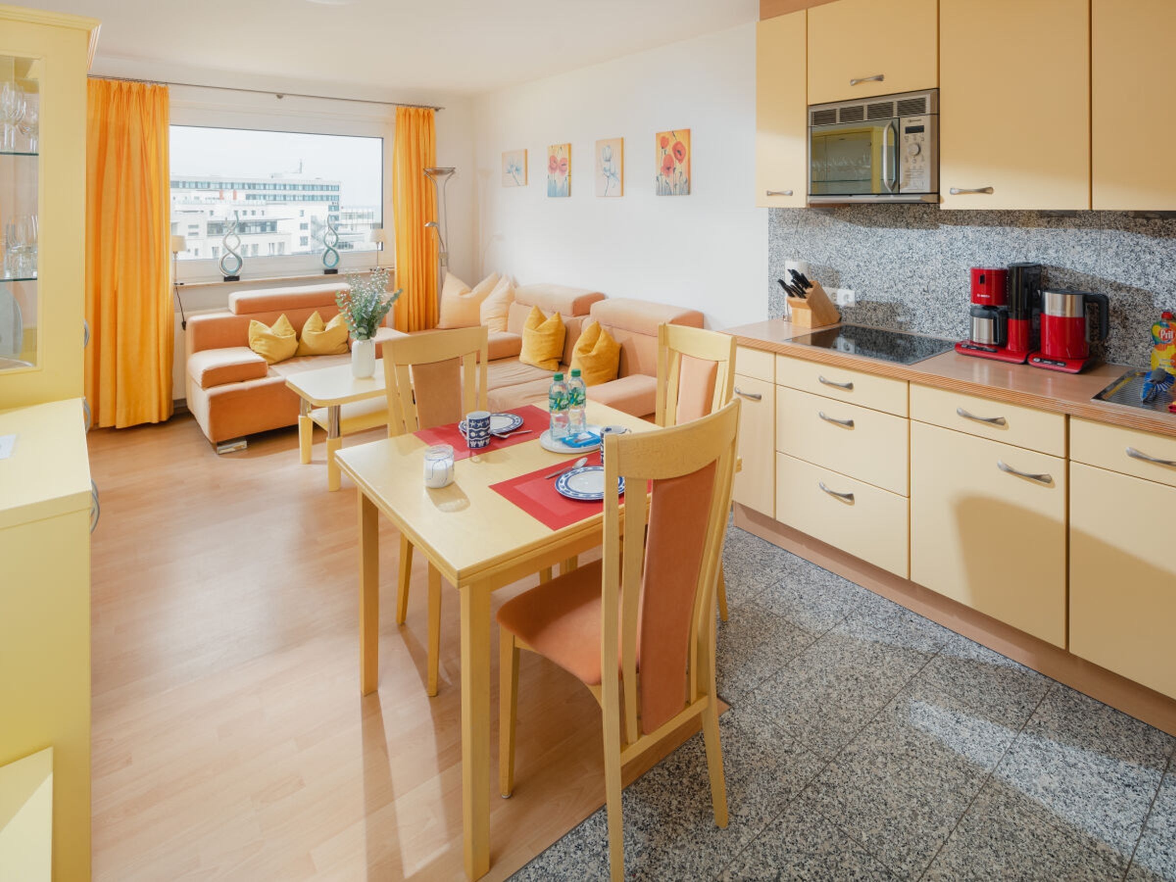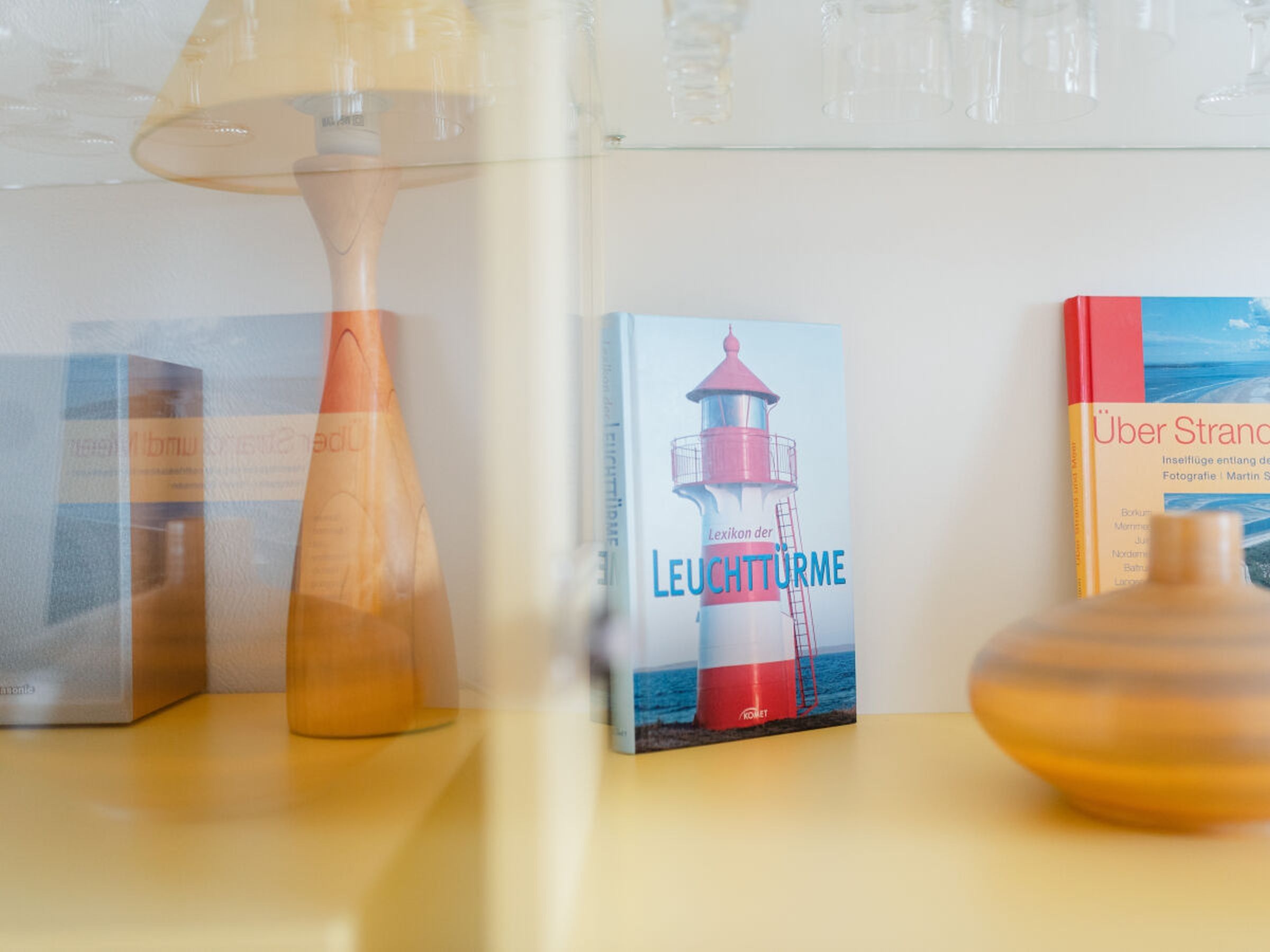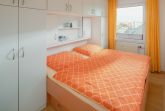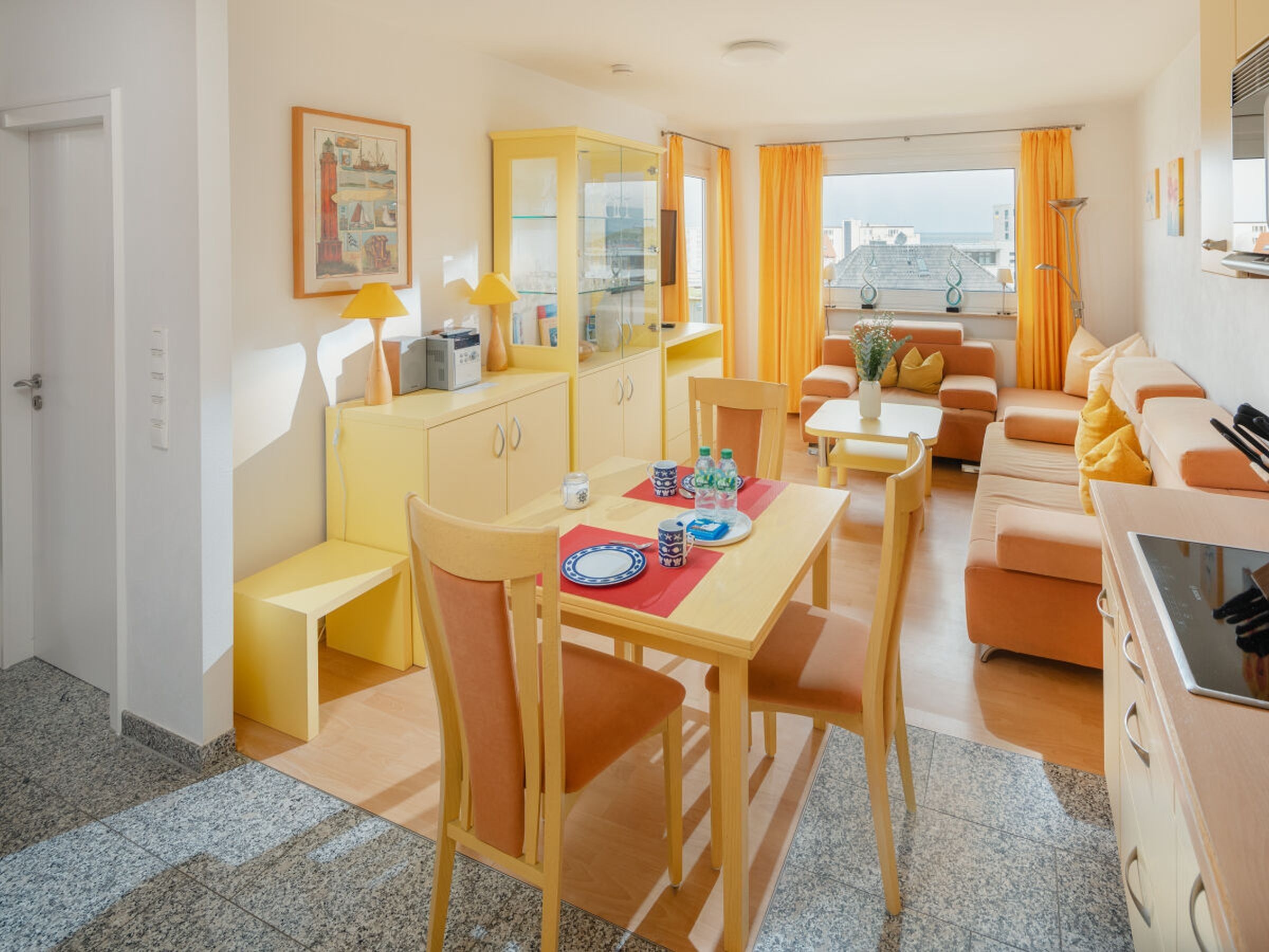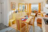 Die individuelle Nichtraucher-Ferienwohnung Terracotta in der 4. Etage im Haus Iderhoff, ausgestattet für 2 Personen mit Blick zur Seeseite. Im gemütlichen Wohn-Esszimmer mit Küche (Mikrowelle, Spülmaschine, Kühl-/Gefrierkombination, mod. Kleinküchengeräten)Sat-TV, DVD/Video, Hifi-CD-Anlage, Gesellschaftsspiele und Bücher. Im Schlafzimmer ist ein eingebautes Doppelbett. Im Badezimmer ist eine Dusche. Balkon mit zwei Liegestühlen.