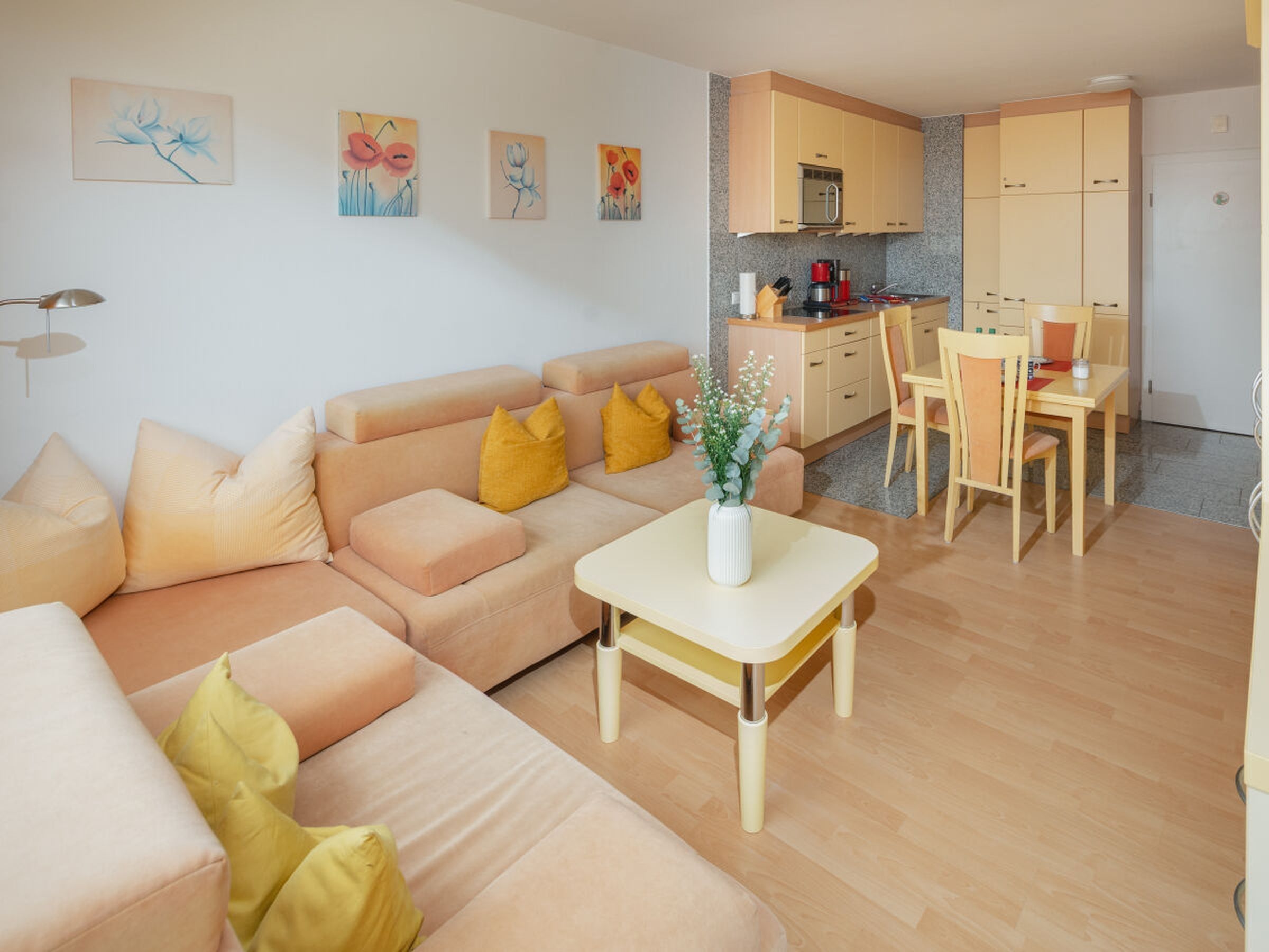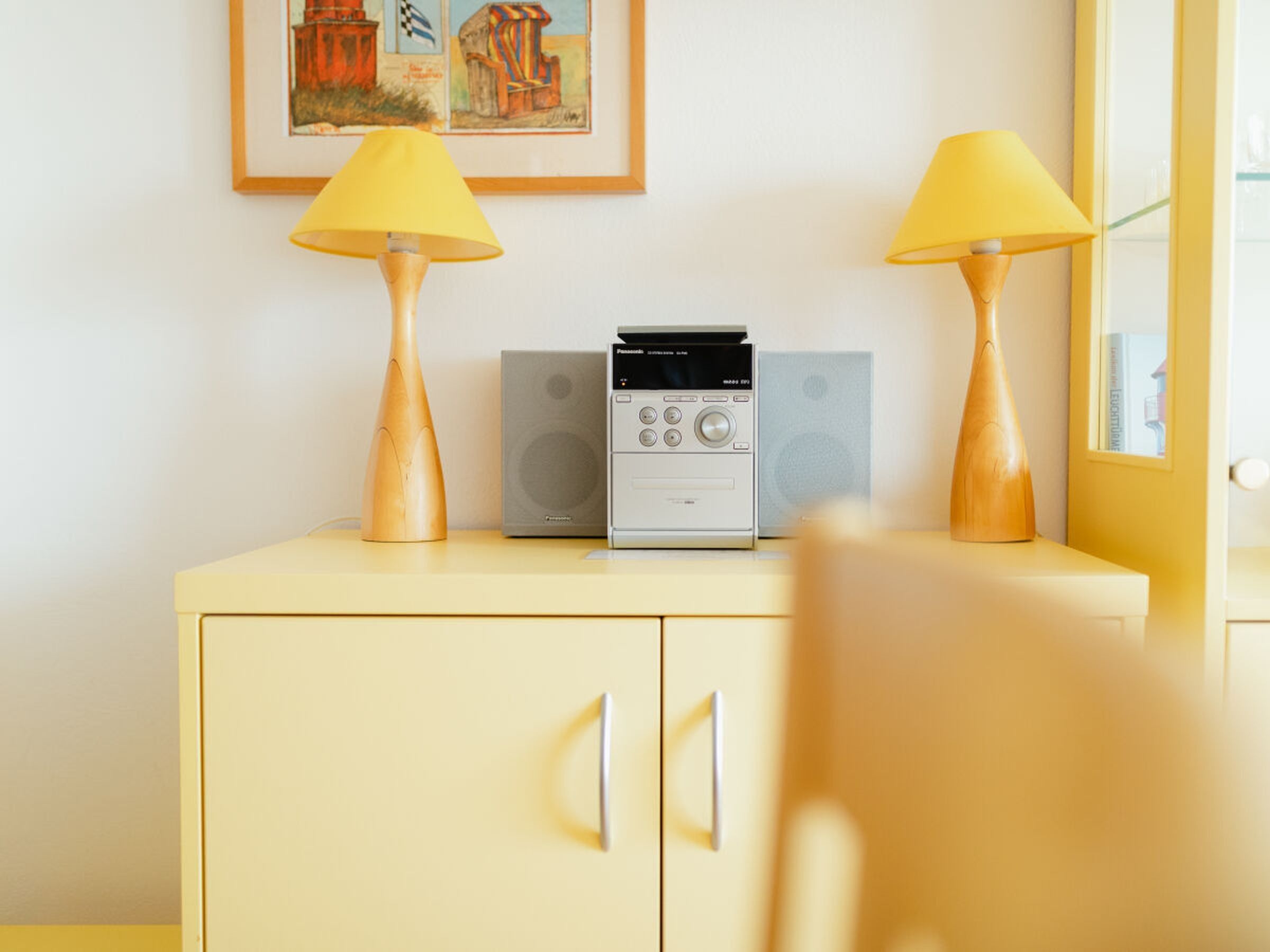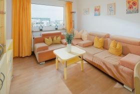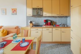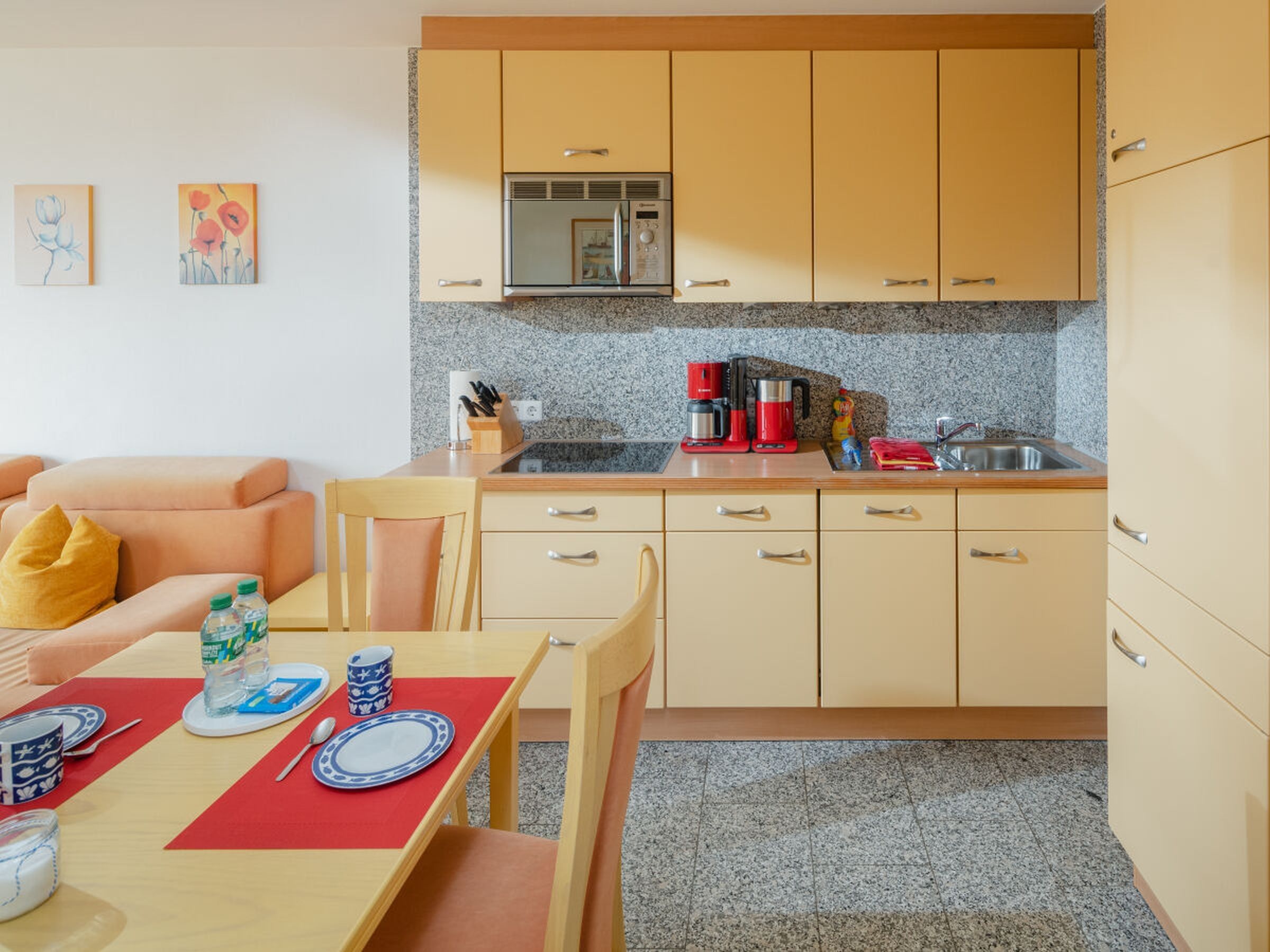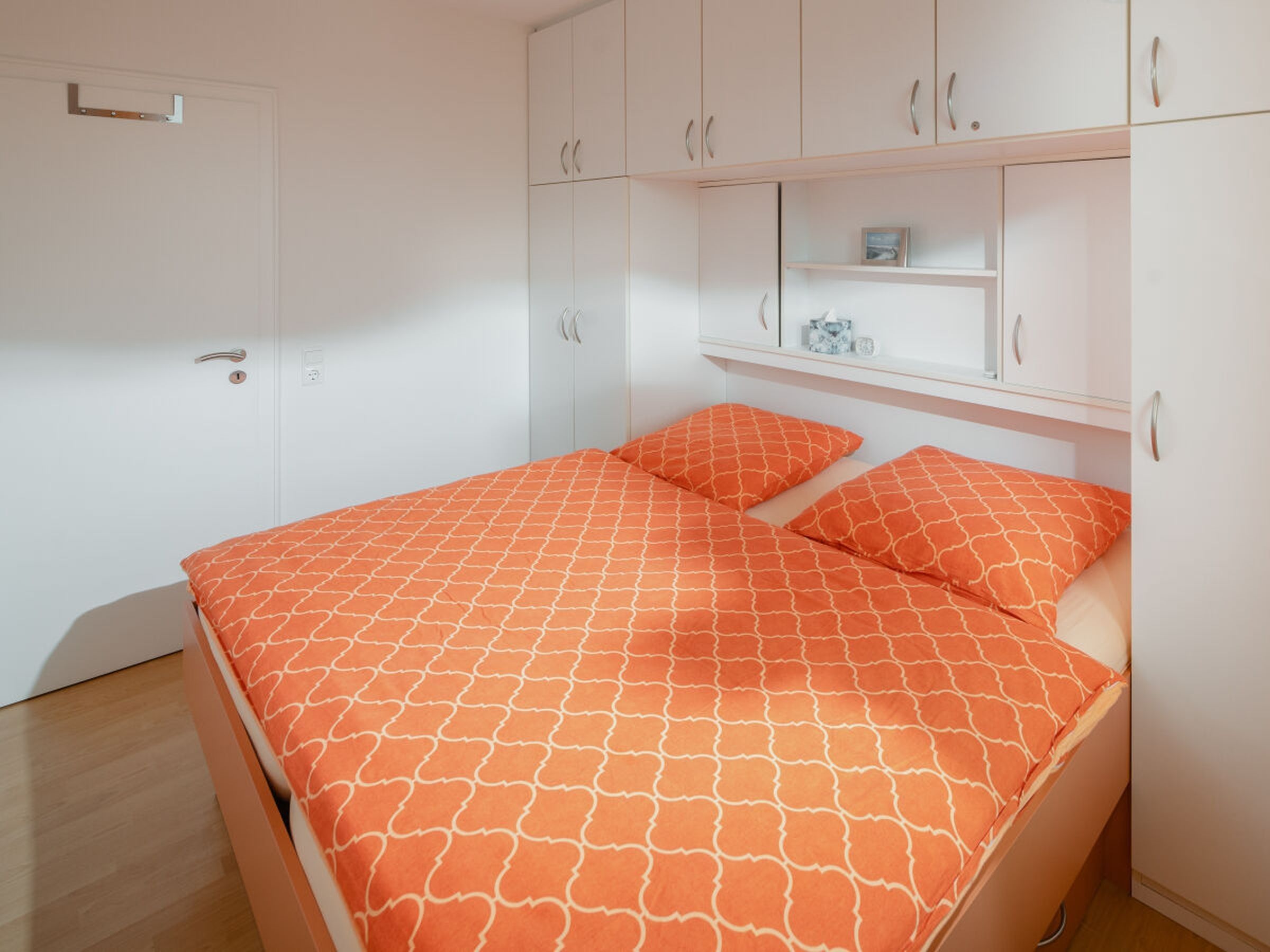 Die individuelle Nichtraucher-Ferienwohnung Terracotta in der 4. Etage im Haus Iderhoff, ausgestattet für 2 Personen mit Blick zur Seeseite. Im gemütlichen Wohn-Esszimmer mit Küche (Mikrowelle, Spülmaschine, Kühl-/Gefrierkombination, mod. Kleinküchengeräten)Sat-TV, DVD/Video, Hifi-CD-Anlage, Gesellschaftsspiele und Bücher. Im Schlafzimmer ist ein eingebautes Doppelbett. Im Badezimmer ist eine Dusche. Balkon mit zwei Liegestühlen.