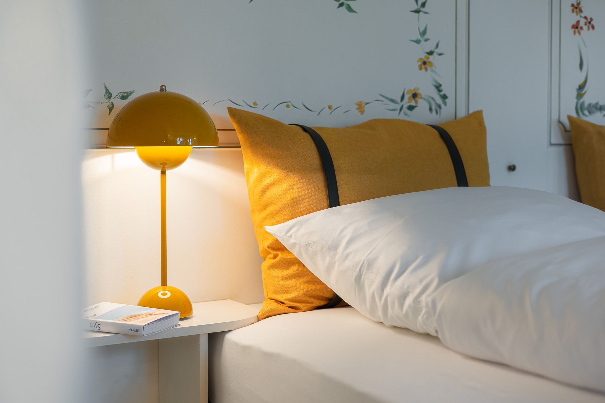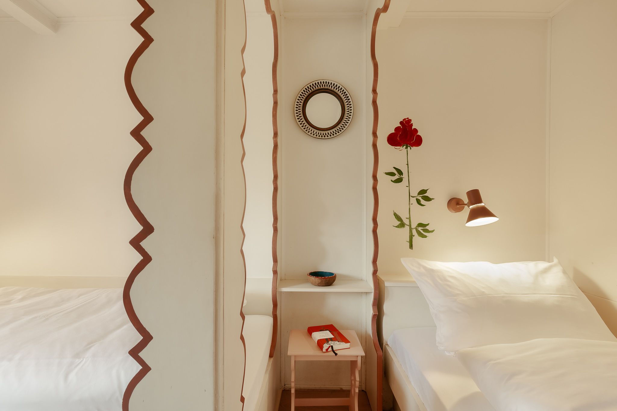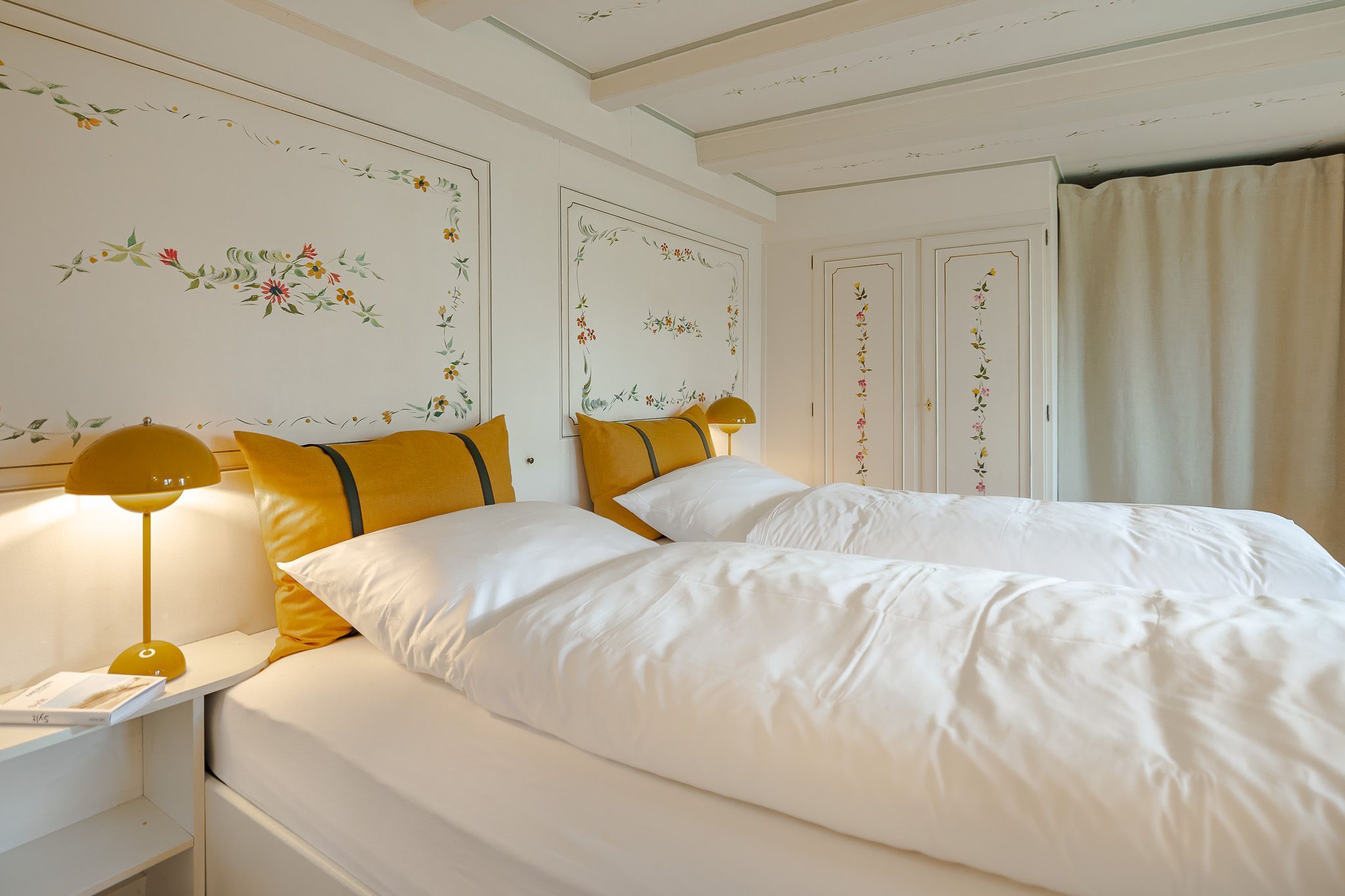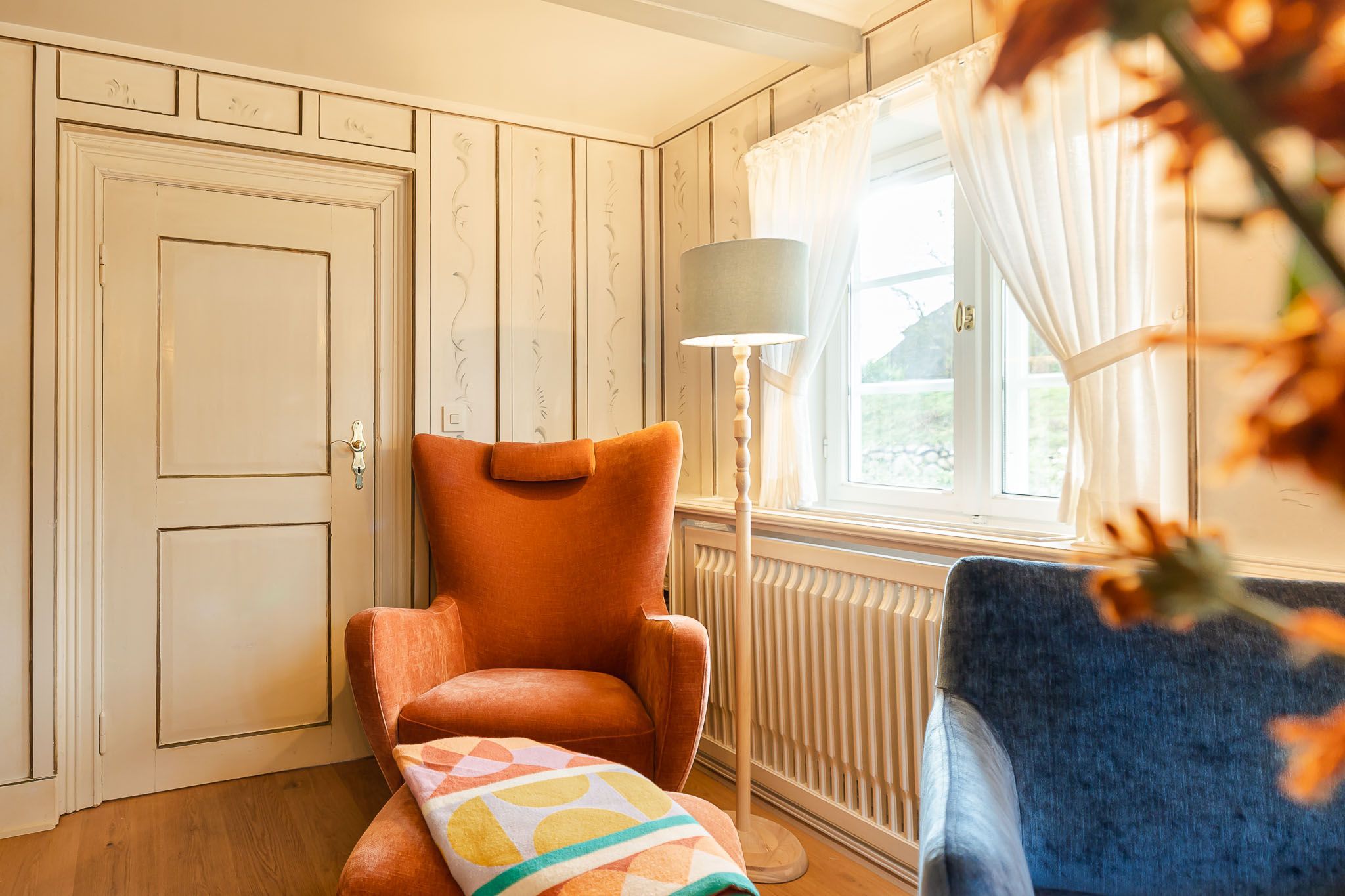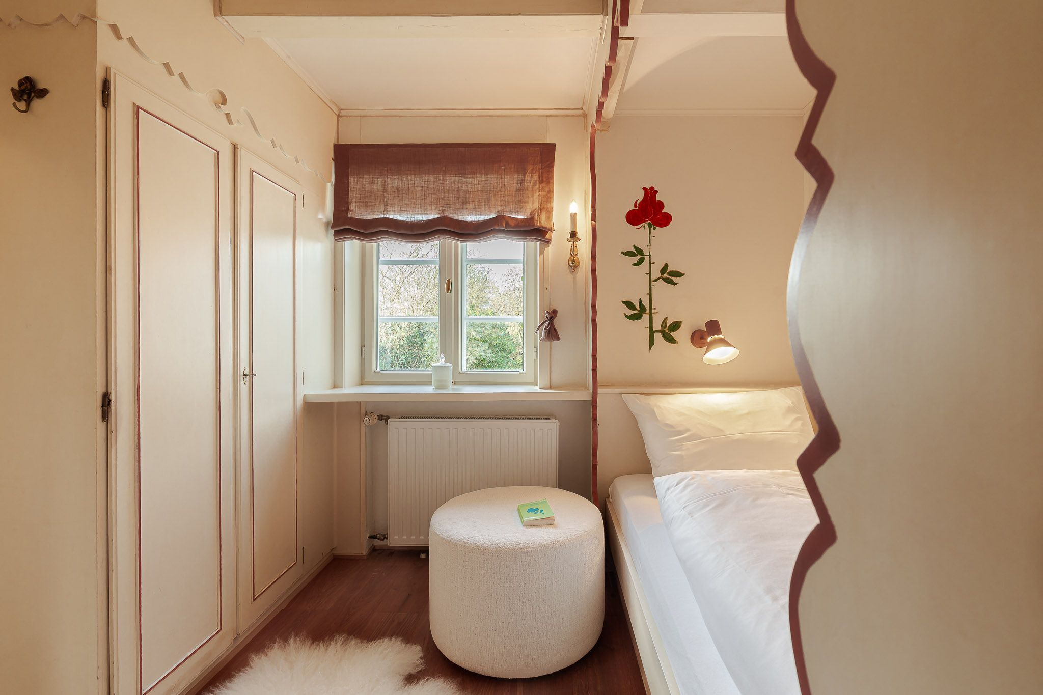 Willkommen in Bullerbü! Beim Betreten des Flurs werden Sie von dem bunten Charme Bullerbüs begrüßt. Links geht direkt das erste Schlafzimmer ab, welches mit zwei Alkoven Betten und altrosafarbenen Details ausgestattet ist. Ein Hingucker ist die Wandmalerei, hier ziert eine große apricotfarbene Rose die cremefarbenen Wände. Moderne Details wie der Pouf aus Teddyfell und die Flowerpot Lampe verleihen dem Schlafzimmer einen besonderen Charme.