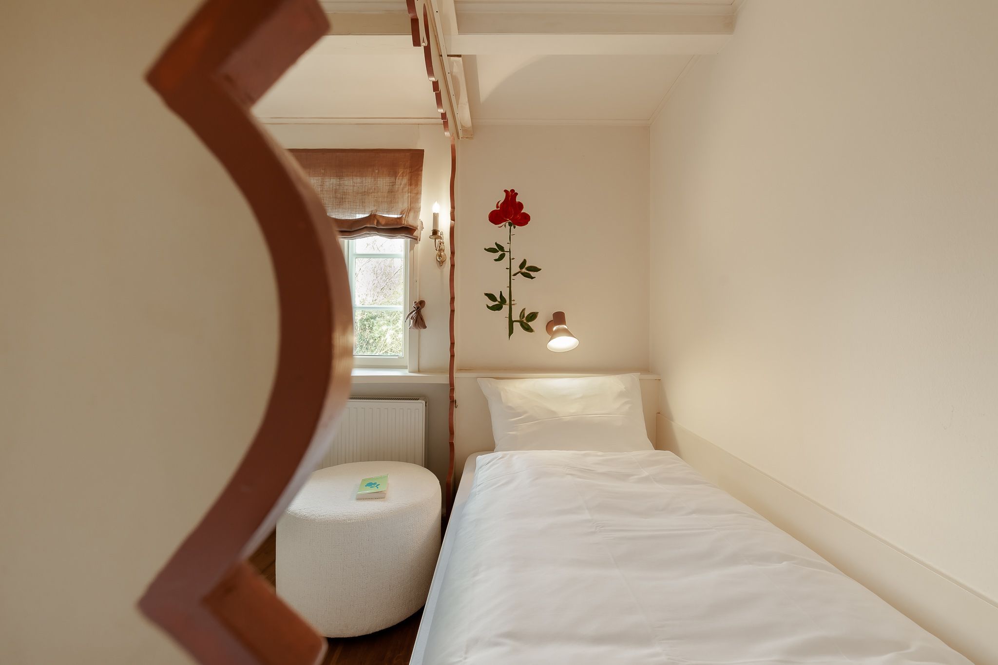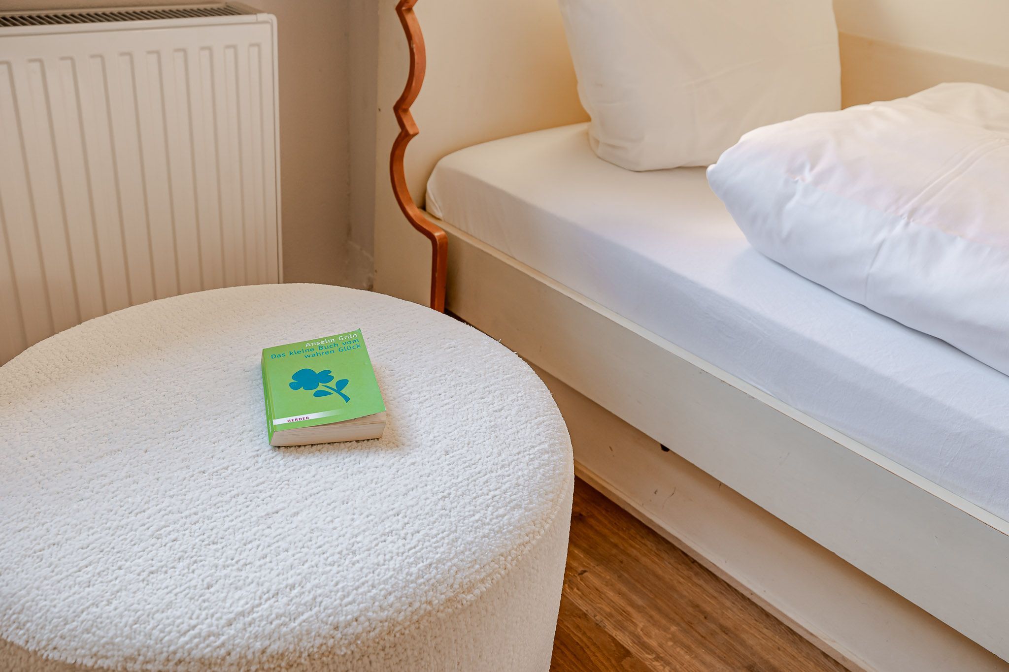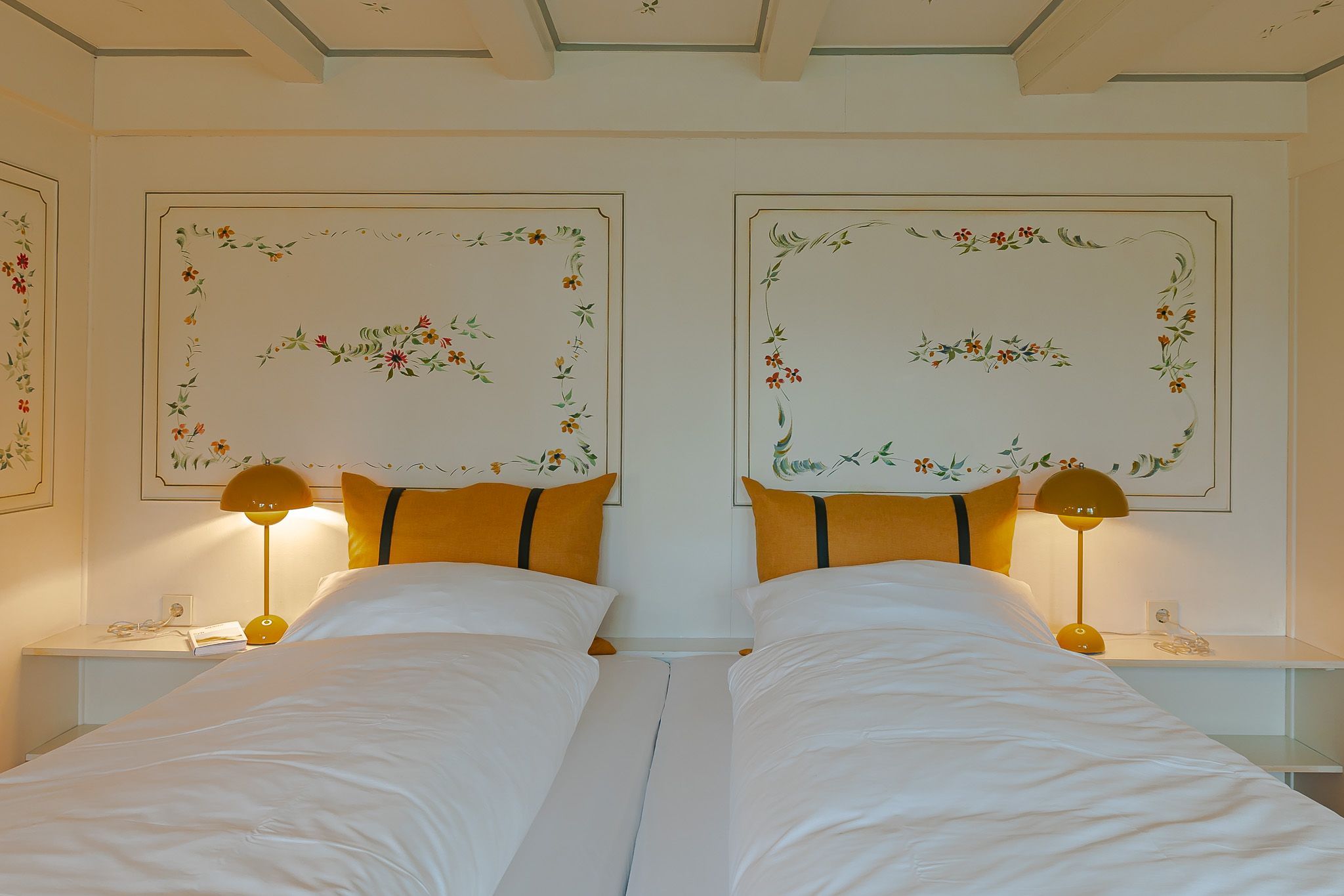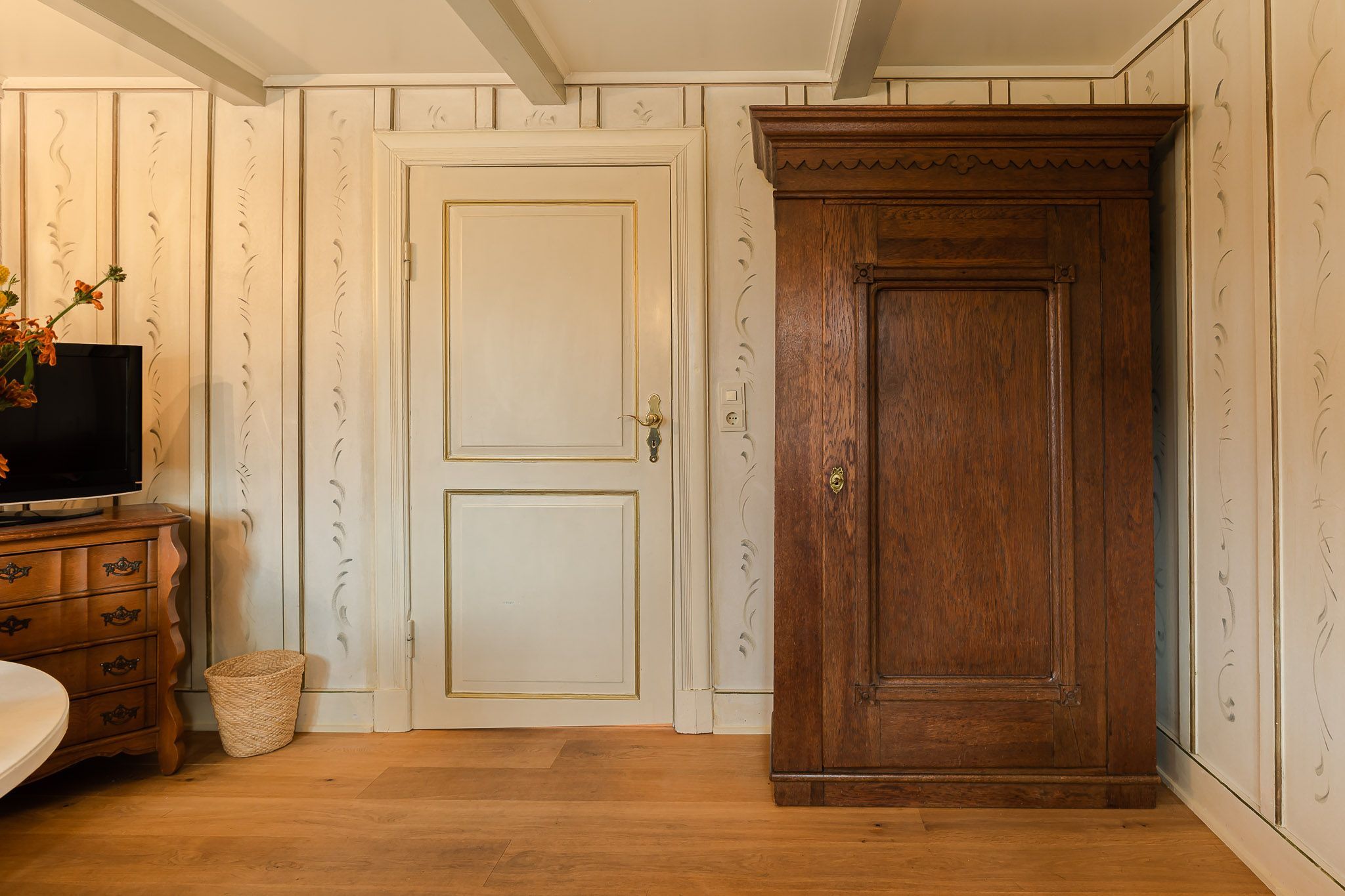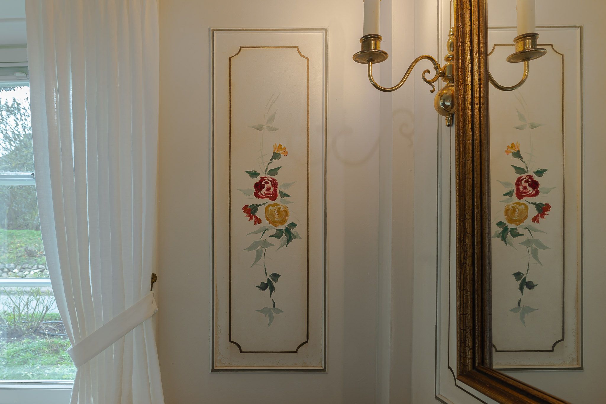 Willkommen in Bullerbü! Beim Betreten des Flurs werden Sie von dem bunten Charme Bullerbüs begrüßt. Links geht direkt das erste Schlafzimmer ab, welches mit zwei Alkoven Betten und altrosafarbenen Details ausgestattet ist. Ein Hingucker ist die Wandmalerei, hier ziert eine große apricotfarbene Rose die cremefarbenen Wände. Moderne Details wie der Pouf aus Teddyfell und die Flowerpot Lampe verleihen dem Schlafzimmer einen besonderen Charme.