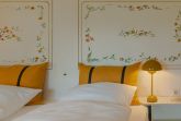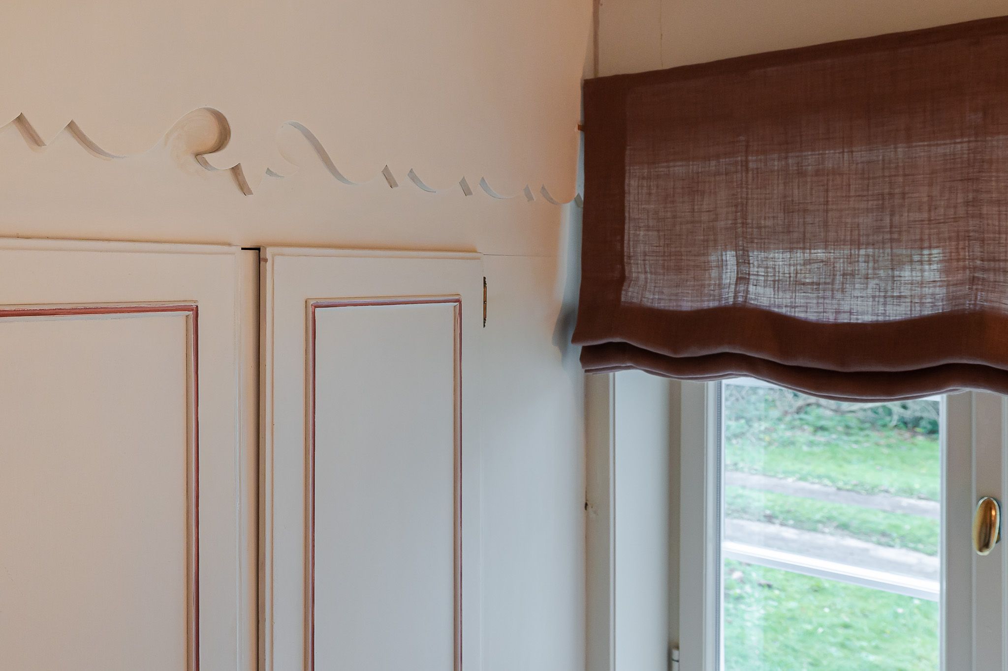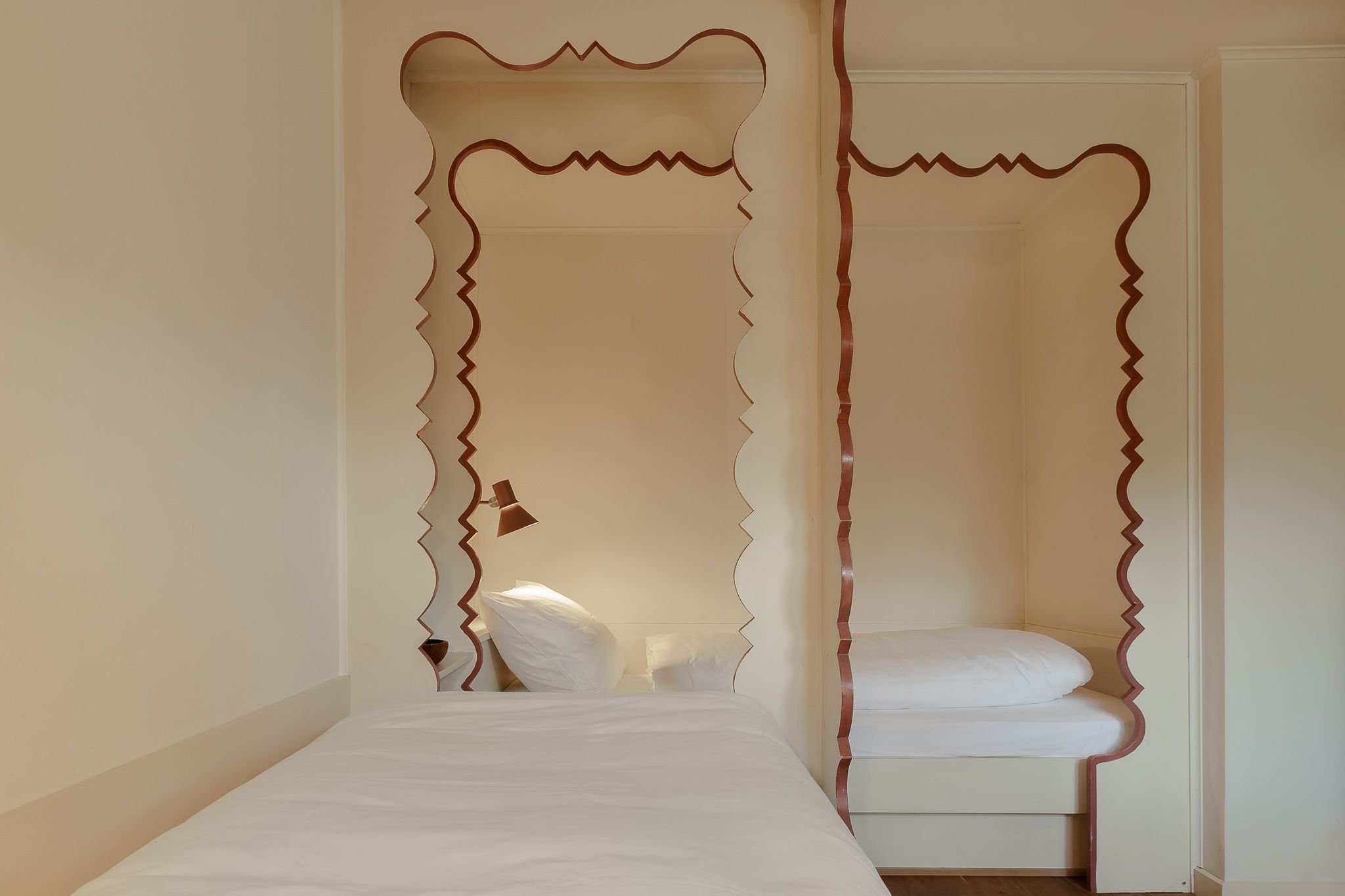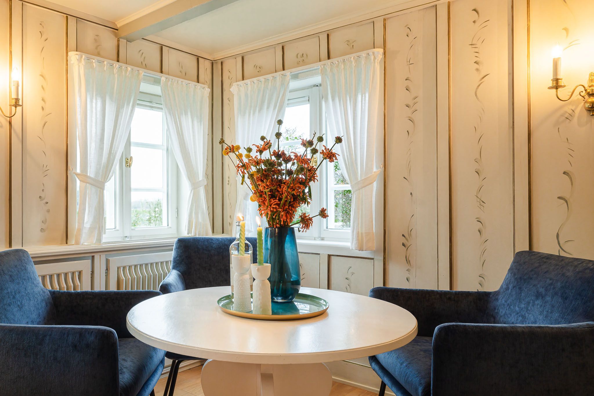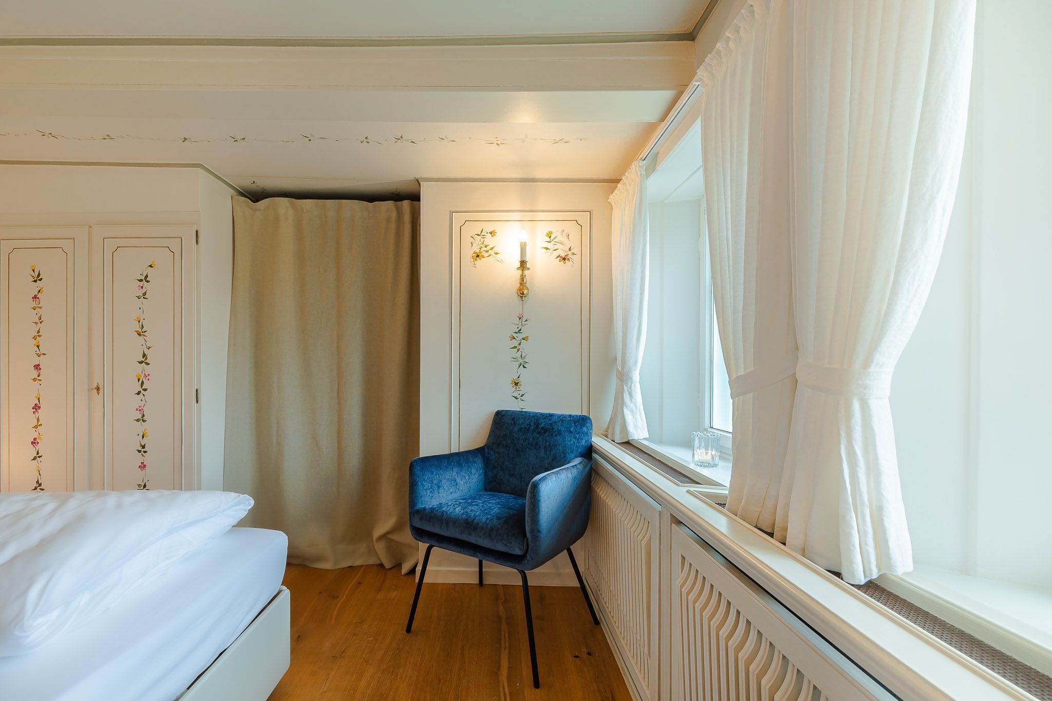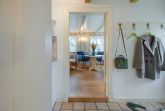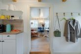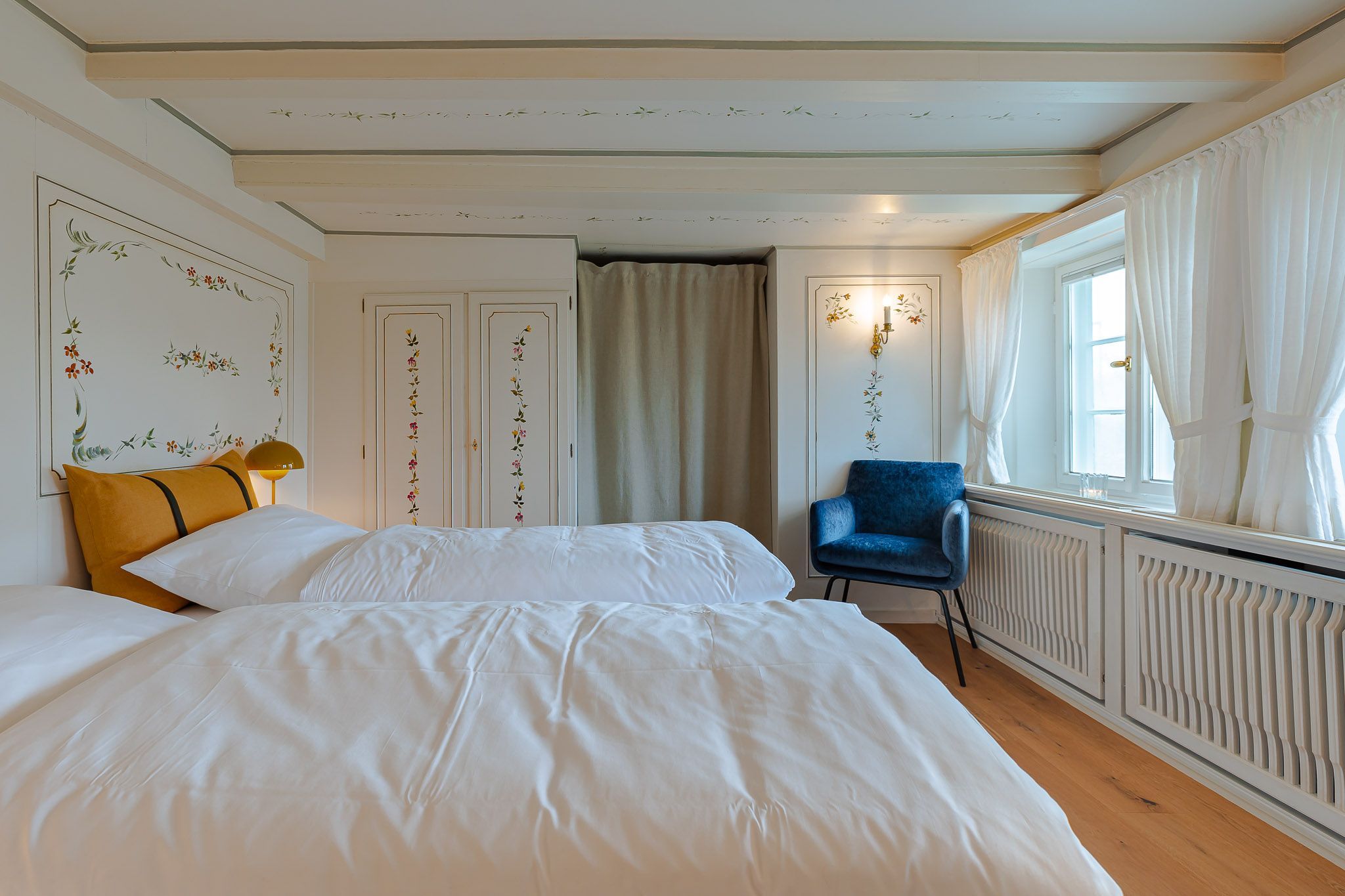 Willkommen in Bullerbü! Beim Betreten des Flurs werden Sie von dem bunten Charme Bullerbüs begrüßt. Links geht direkt das erste Schlafzimmer ab, welches mit zwei Alkoven Betten und altrosafarbenen Details ausgestattet ist. Ein Hingucker ist die Wandmalerei, hier ziert eine große apricotfarbene Rose die cremefarbenen Wände. Moderne Details wie der Pouf aus Teddyfell und die Flowerpot Lampe verleihen dem Schlafzimmer einen besonderen Charme.