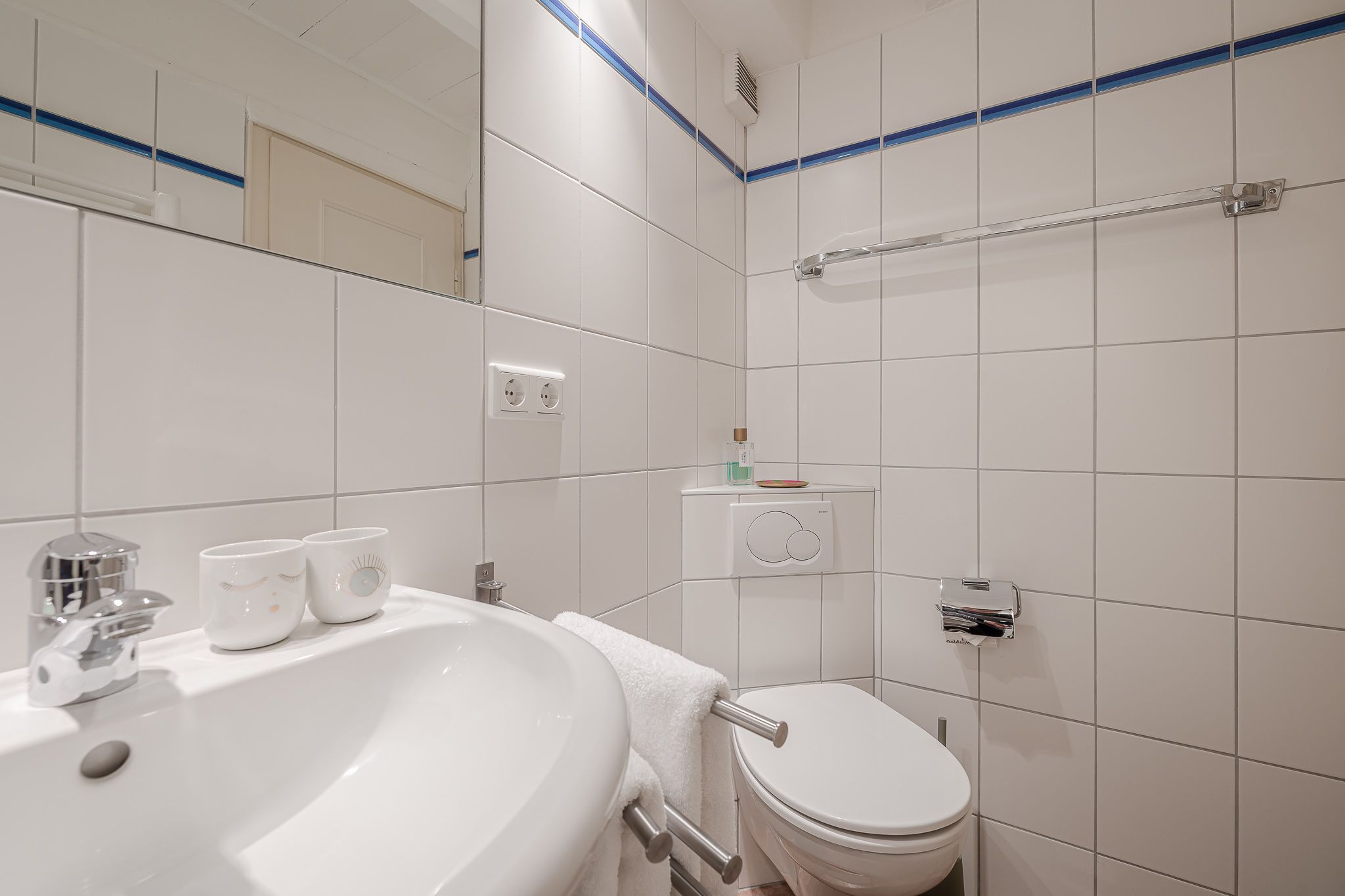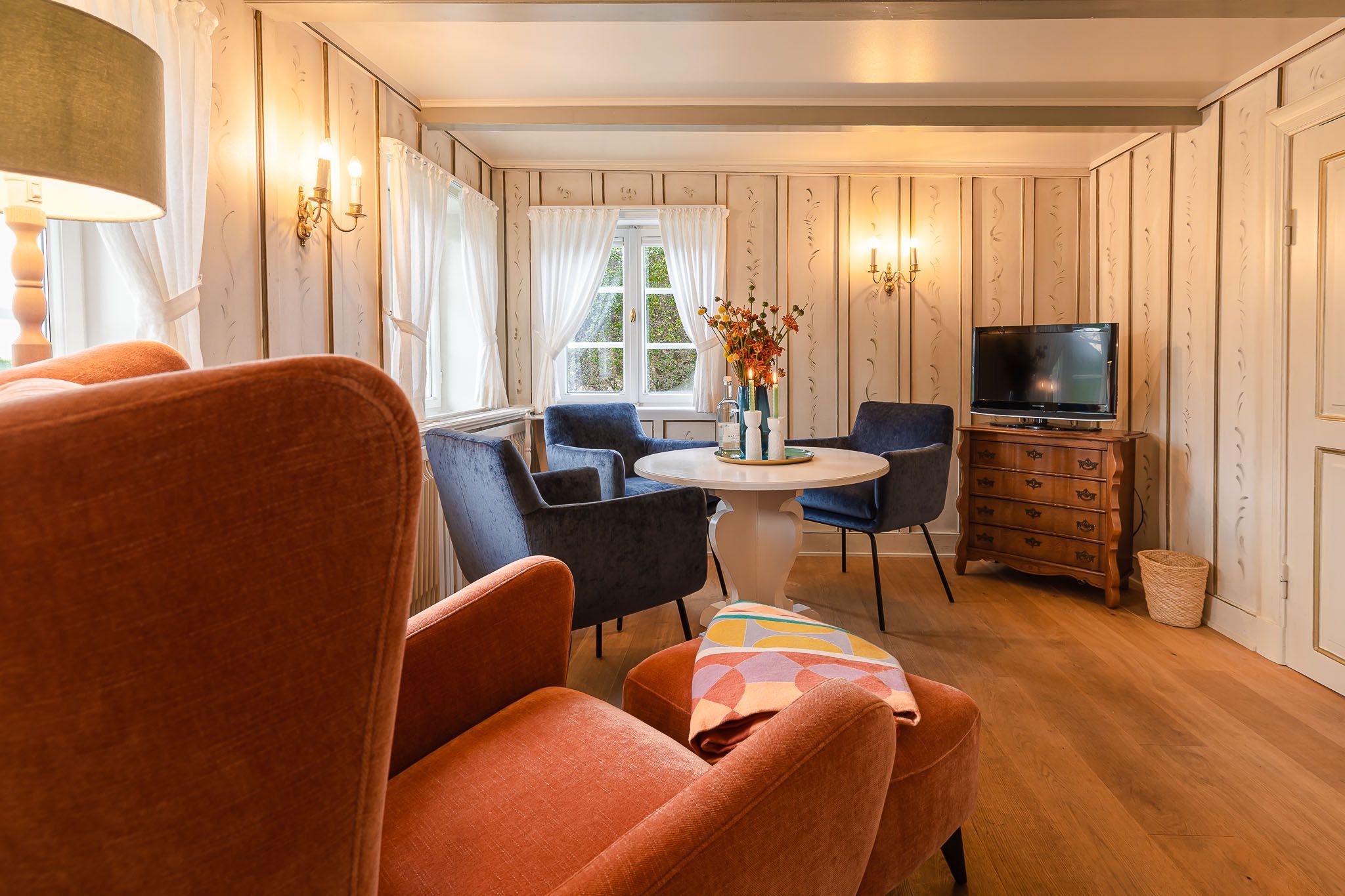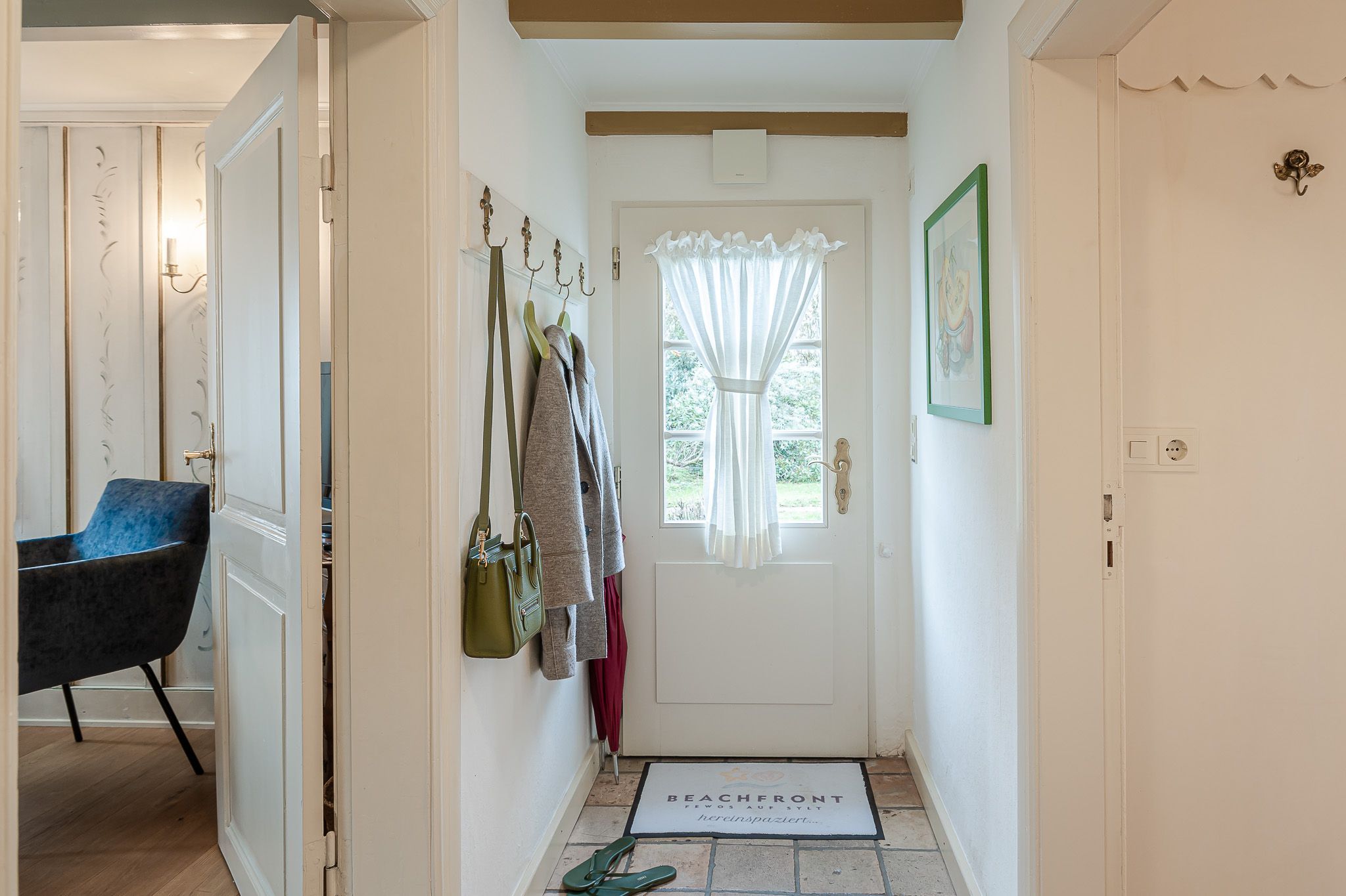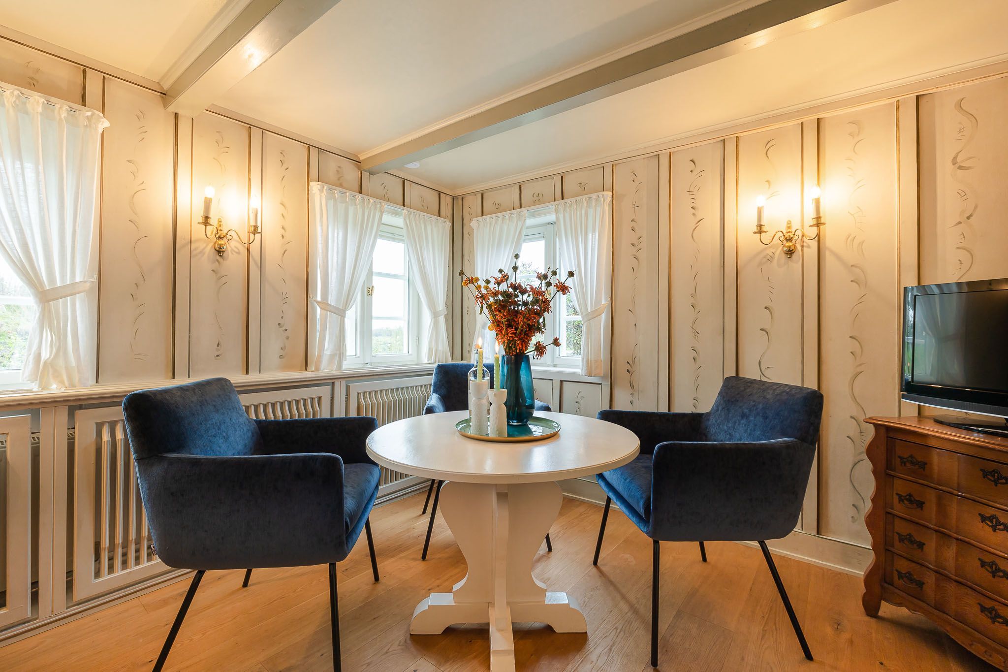 Gegenüber vom Schlafzimmer befindet sich der Wohn-Essbereich, in dem der alte Friesenschrank die langjährige Geschichte des Hauses perfekt einfängt. Bestückt mit Friesengeschirr verleiht er dem Raum einen schönen rustikalen Charme. Entspannen Sie im gemütlichen Ohrensessel, schauen Sie Ihre Lieblingsserie auf dem TV oder spielen Sie Karten am Esstisch. Hinter dem Wohn-Essbereich befindet sich das zweite Schlafzimmer mit einem komfortablen Doppelbett für erholsame Nächte.