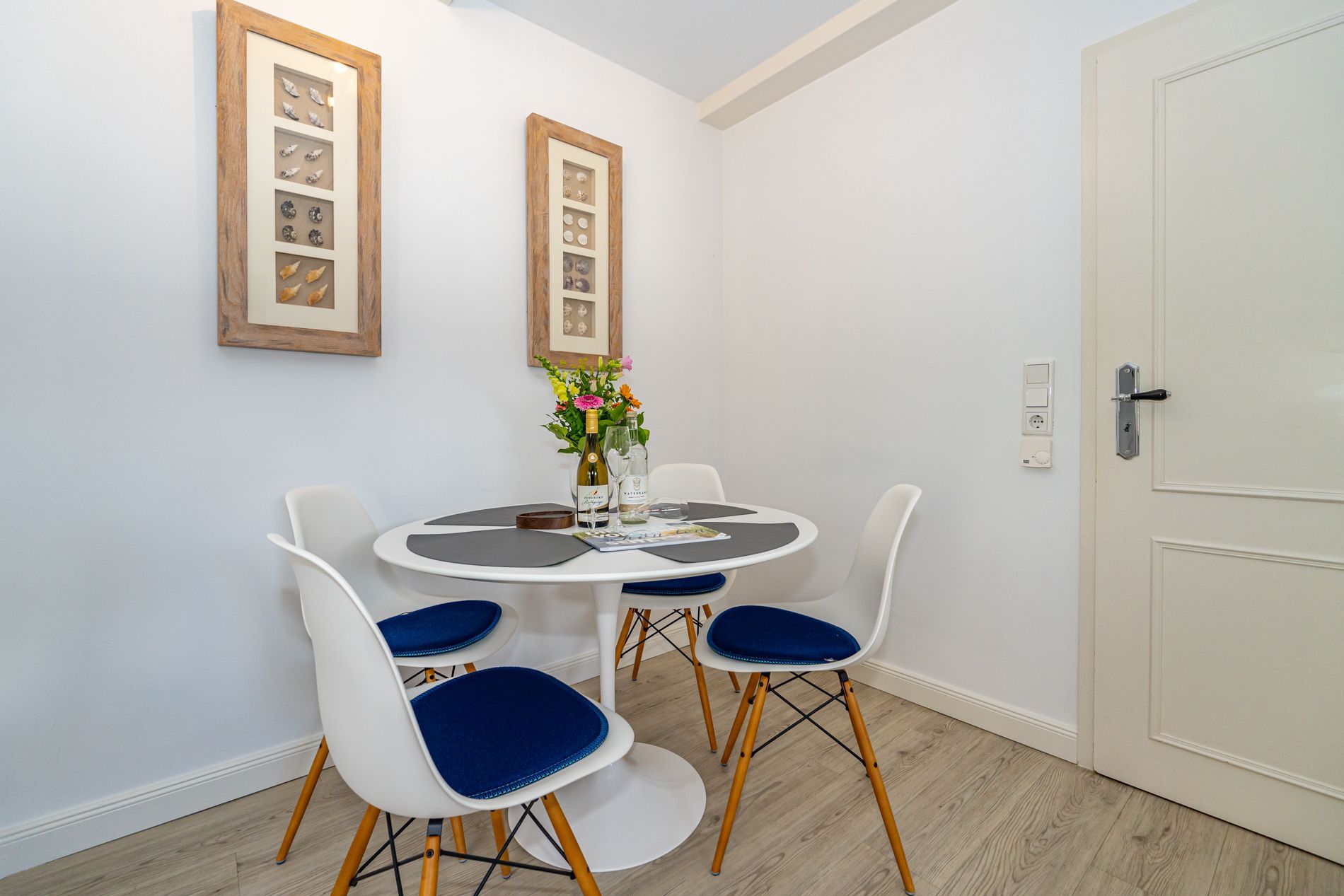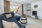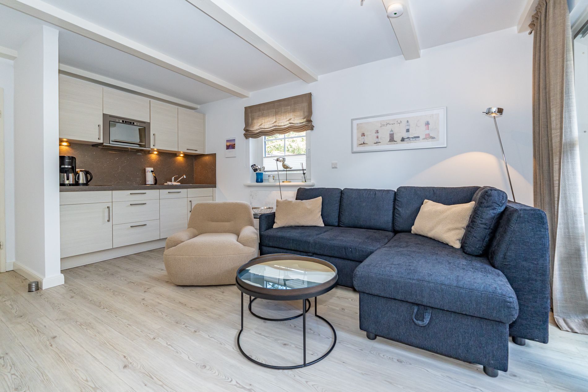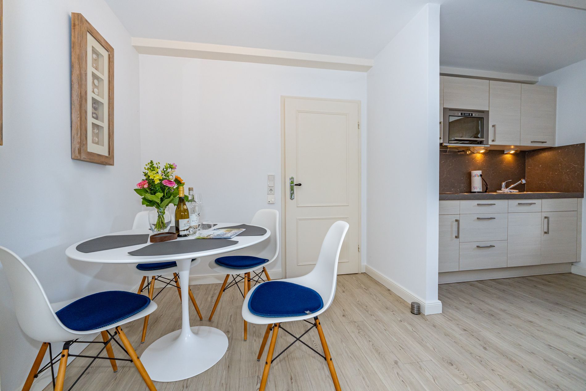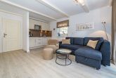 Hochwertig ausgestattete und exklusive 2-Zimmer-Nichtraucher-Ferienwohnung, ca. 45 qm im Parterre zur Südseite mit Südterrasse (mit Balkonmöbeln, Armlehnstühlen + Auflagen, Terrassentisch, Sonnenschirm + Ständer ) und Abstellraum auf der Terrasse für max. 2 Personen.